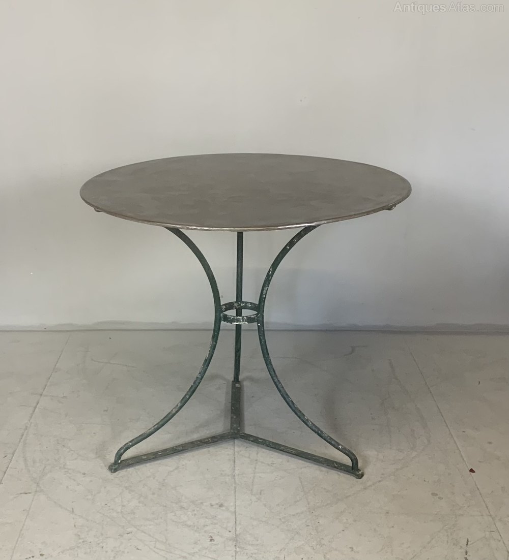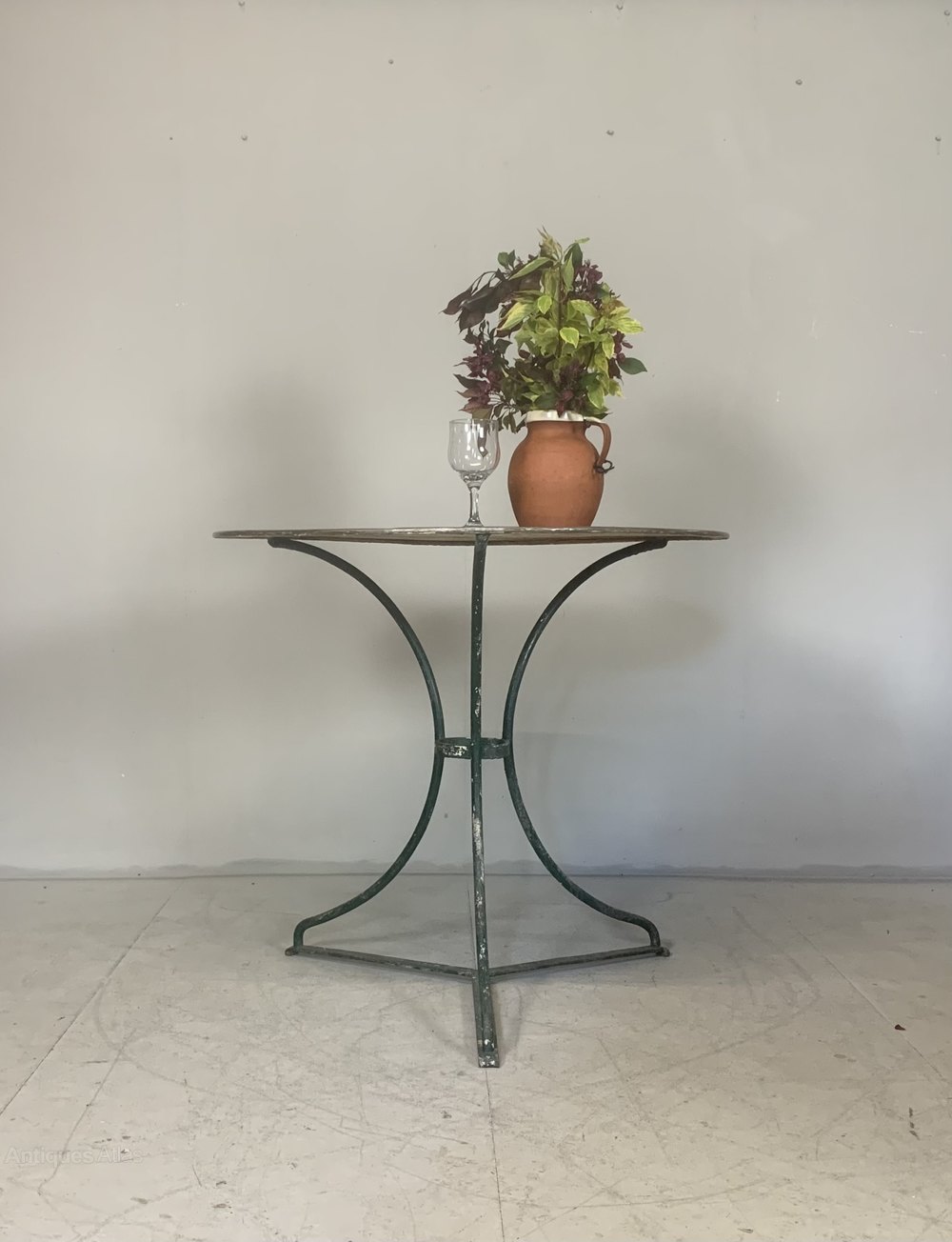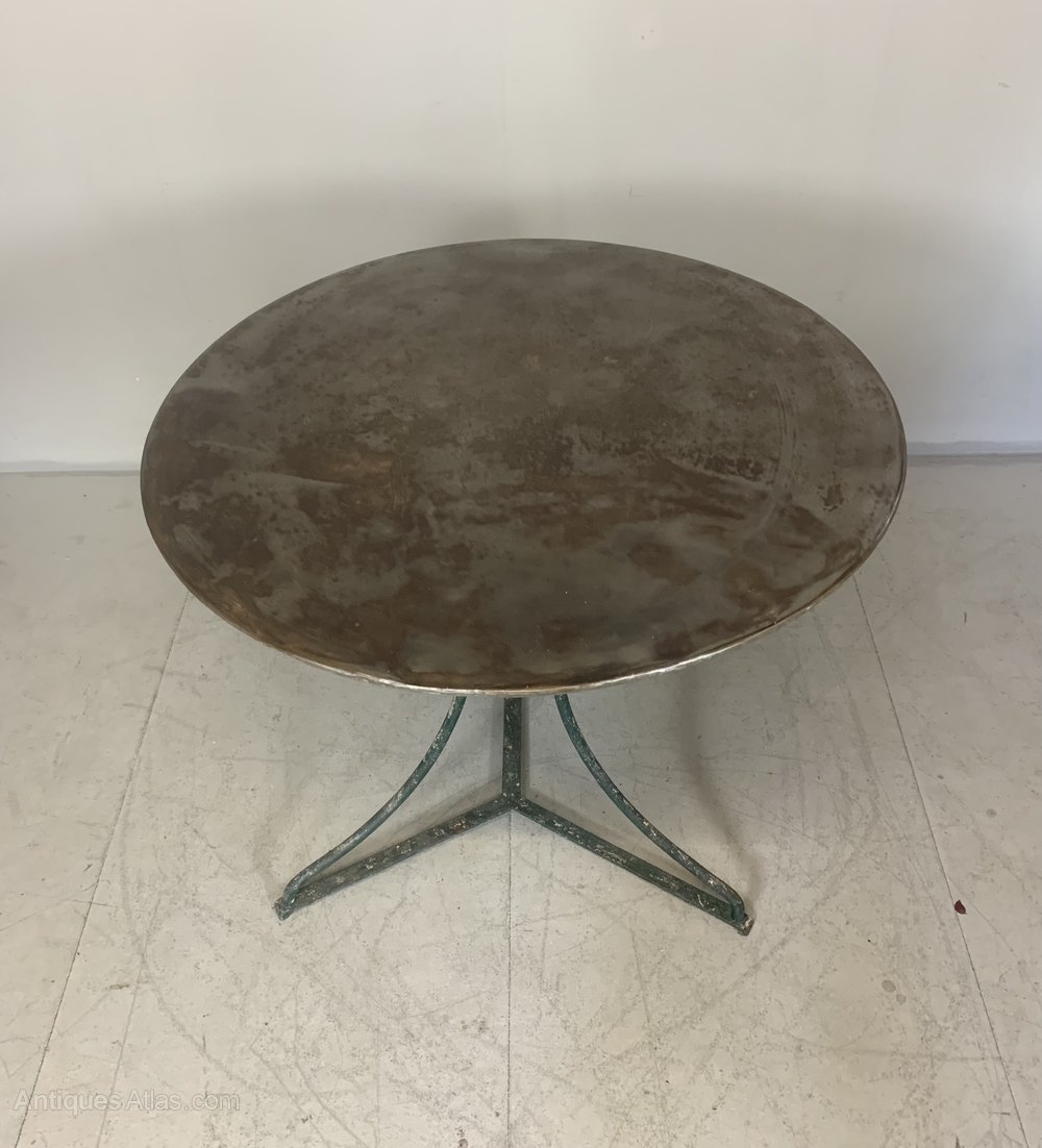 French steel garden table on a shaped tripod base on triform stretchers with a burnished oxidised top in old paint
