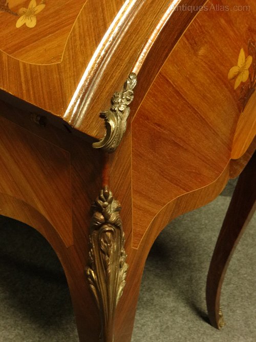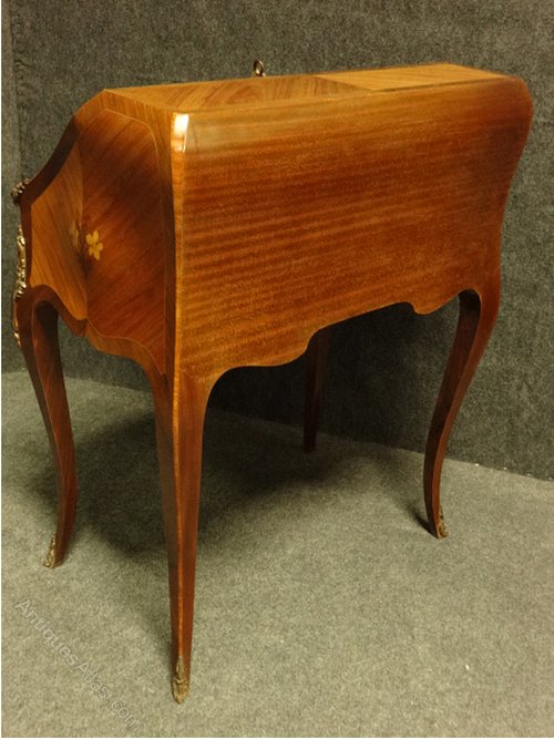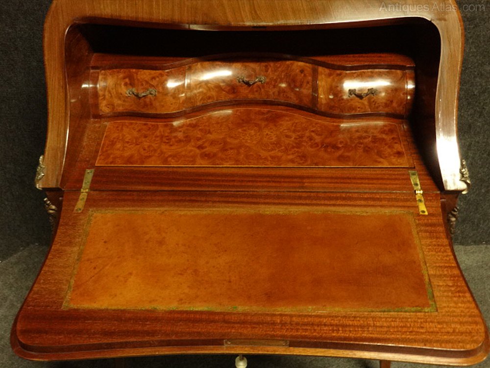 A good French kingwood and marquetry bombe shaped bureau, lovely burr walnut interior with well, in excellent original condition.