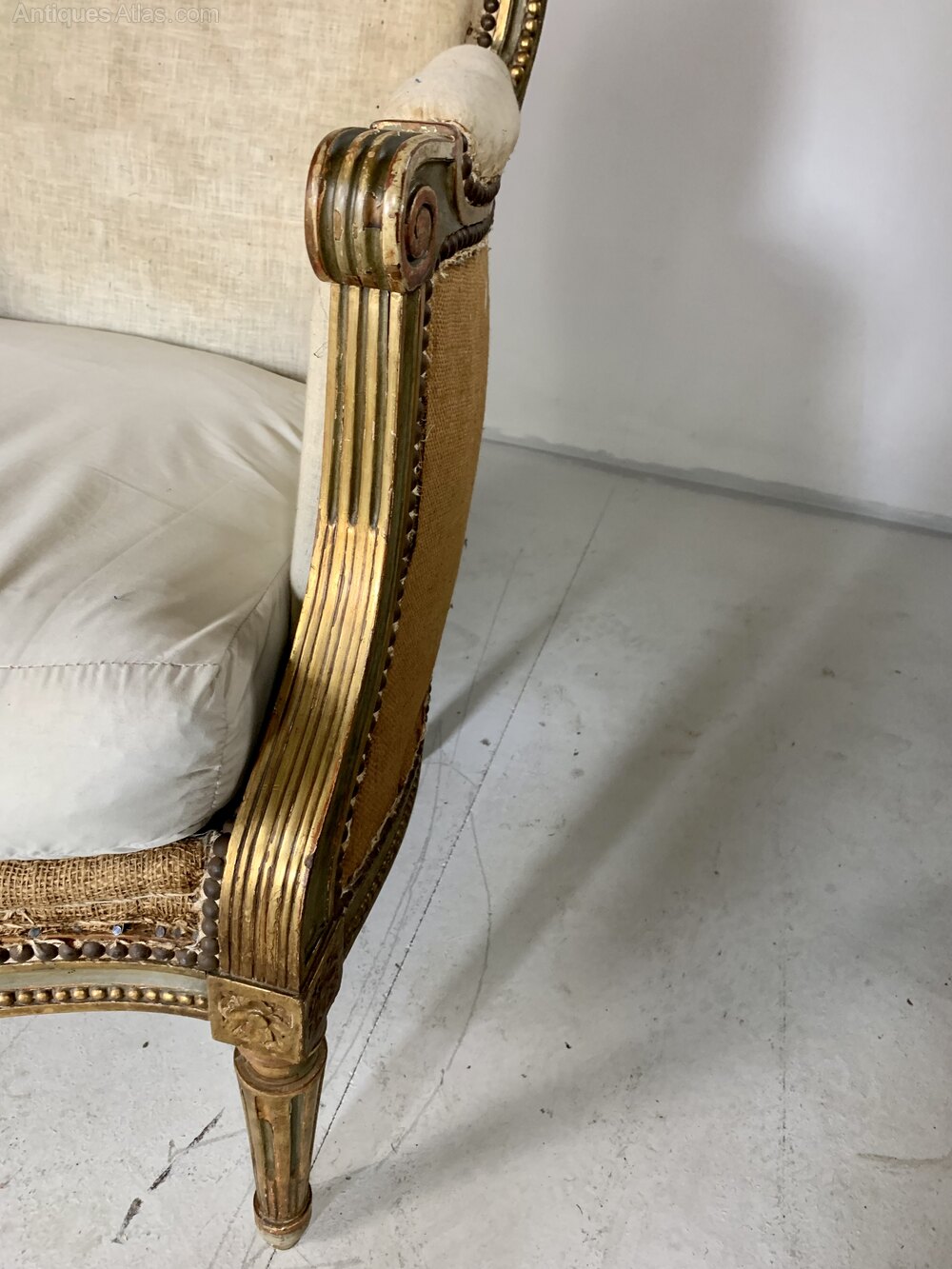 Elegant 18th Century deconstructed Directiore period enclosed library chair of shapely form with original parcel gilt and polychrome decoration on turned reeded fluted legs in aged but good condition given its age and use ,deconstructed down to the original linen and hessian with horsehair padding with the old stud work and feather down seat cushion Suitable for recovering or use as it is would work well as a desk or library chair 4.75”or 103.5 cm high 27” or 68.5 25.5” or 65cm Seat depth 20.25 or 51.5cm Height to seat 18.5”or 47 cm