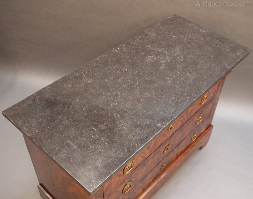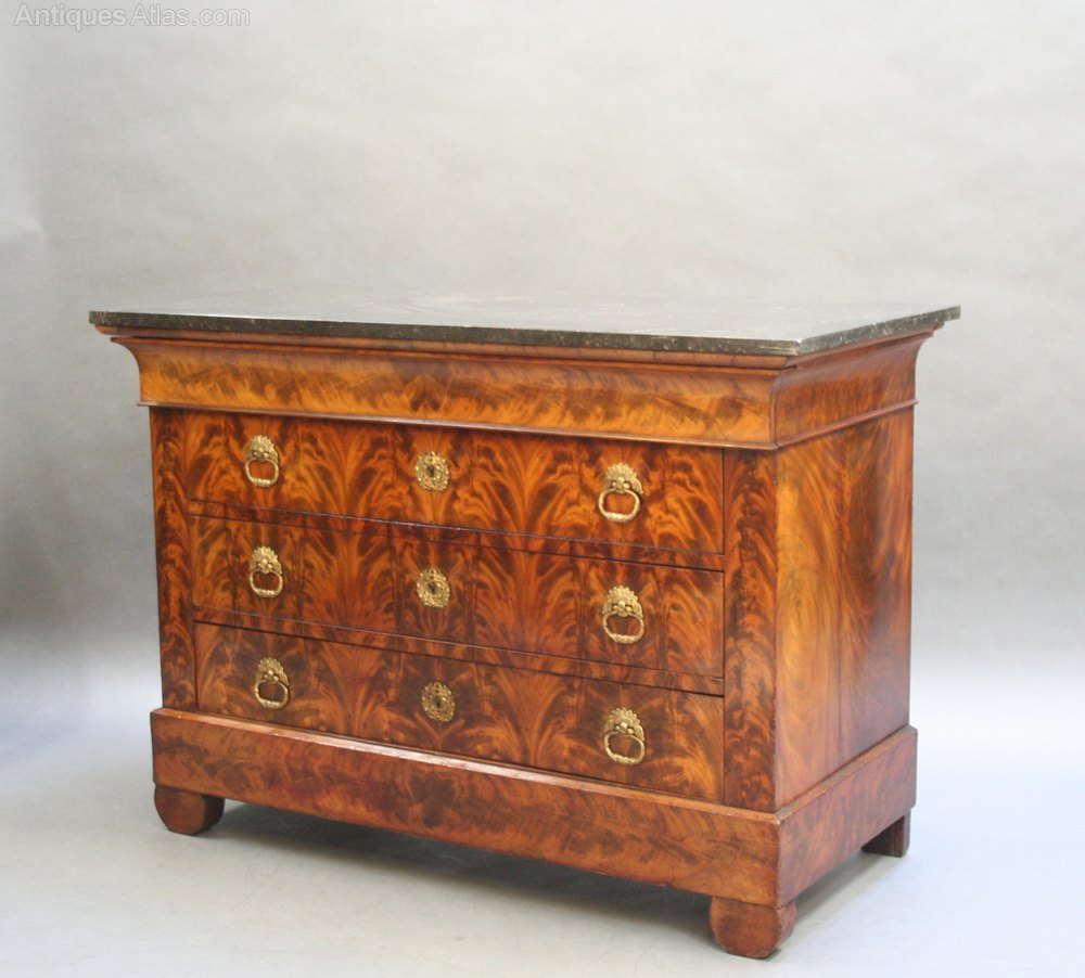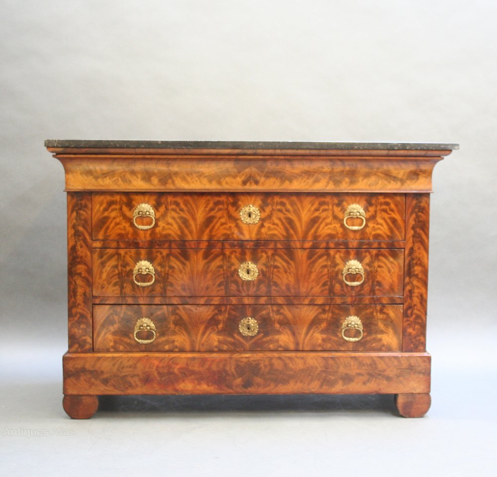 Circa 1860 this very well figured mahogany commode of good colour has a marble top above convex frieze drawer and 3 further long drawers with ornate gilt handles and escutcheons, raised on plinth base and demi-lune feet.