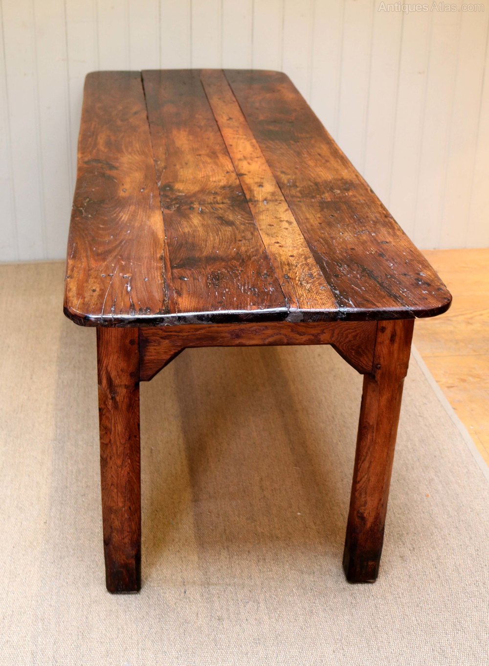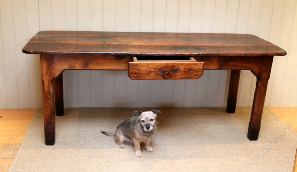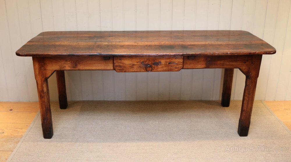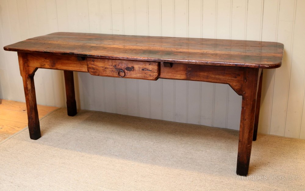 French oak farmhouse table having a four plank top with rounded ends, a single central cutlery drawer raised on thick chamfered edge legs and shaped supports.The height to the undertier is 62cm