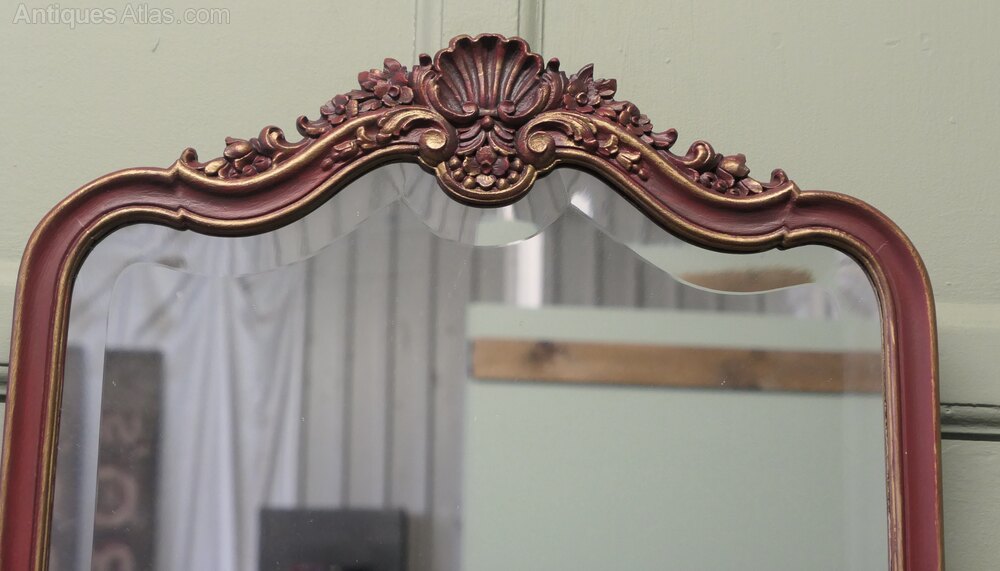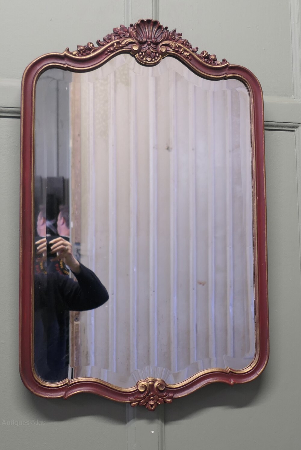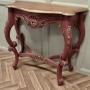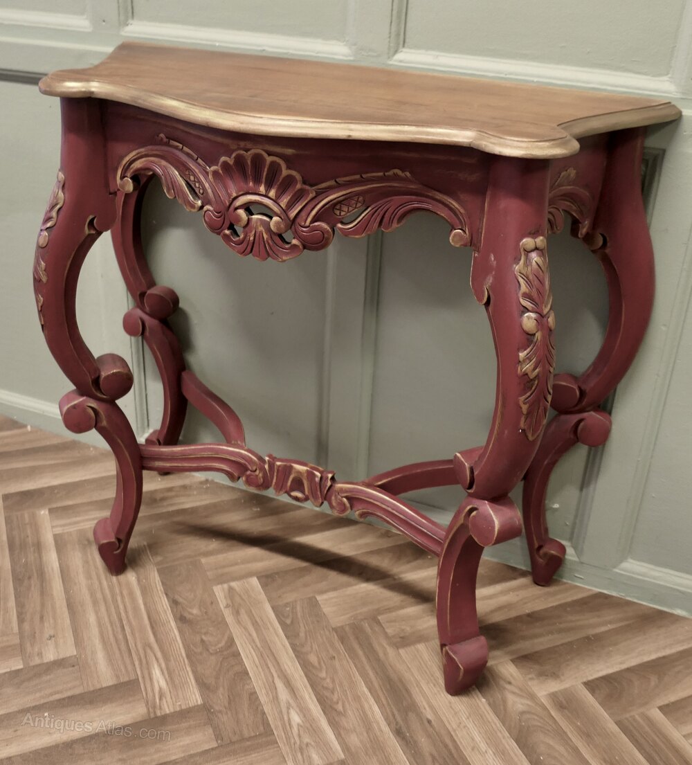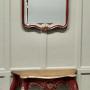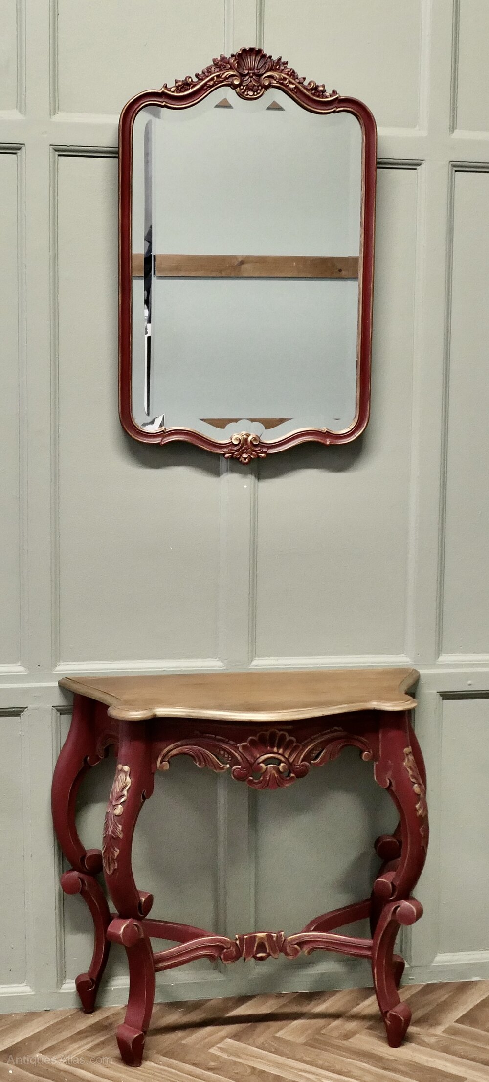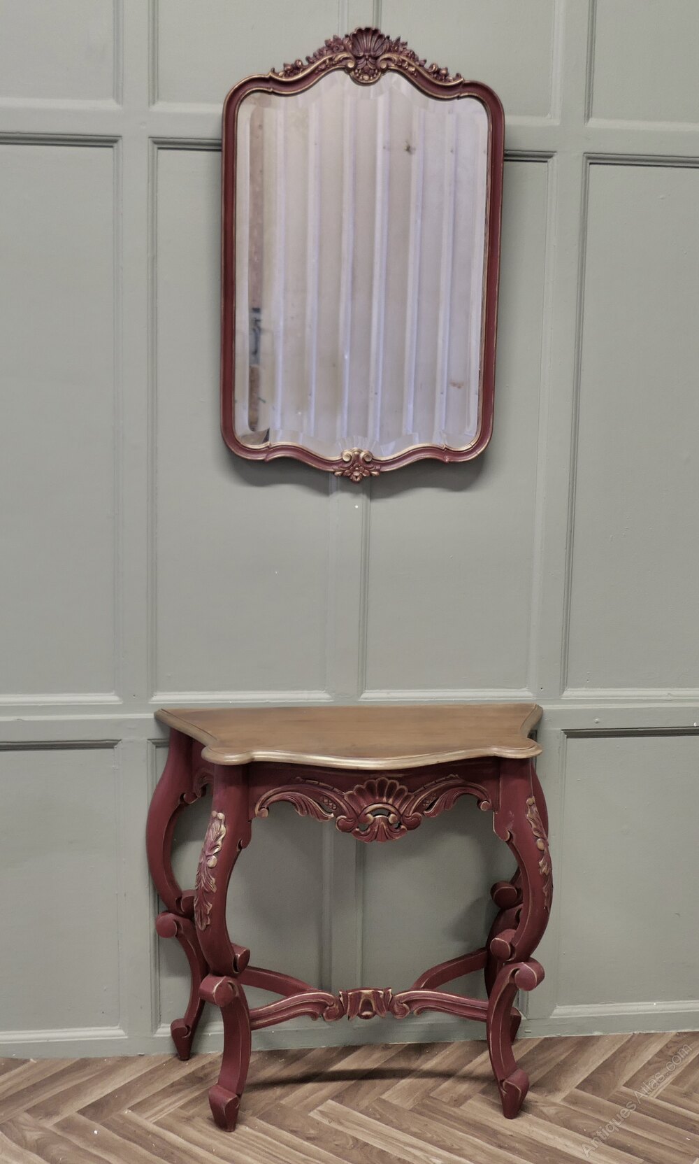 This is a very attractive set, the table is carved with a shaped and polished top it has decorative shell carving on the legs which matches the frame of the mirror, the set has been painted in a warm plumb colour with detail highlighted in gold