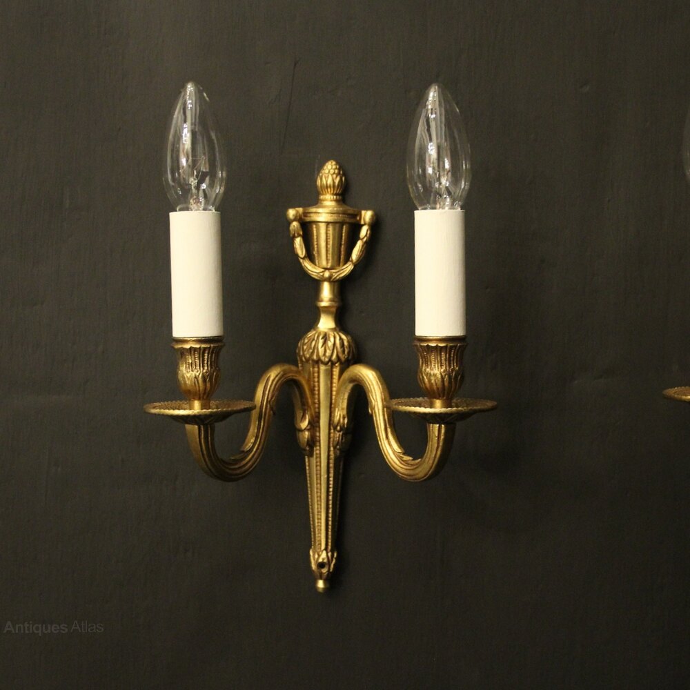 A French pair of gilded brass twin arm wall lights, the reeded scrolling arms with circular bobeche drip pans and bulbous candle sconces, issuing from tapering reeded backplate with urn laurel swaged finial, great small scale. Fully rewired and PAT tested. All our wall lights come with aged brass screws for fixing and spare bulbs.