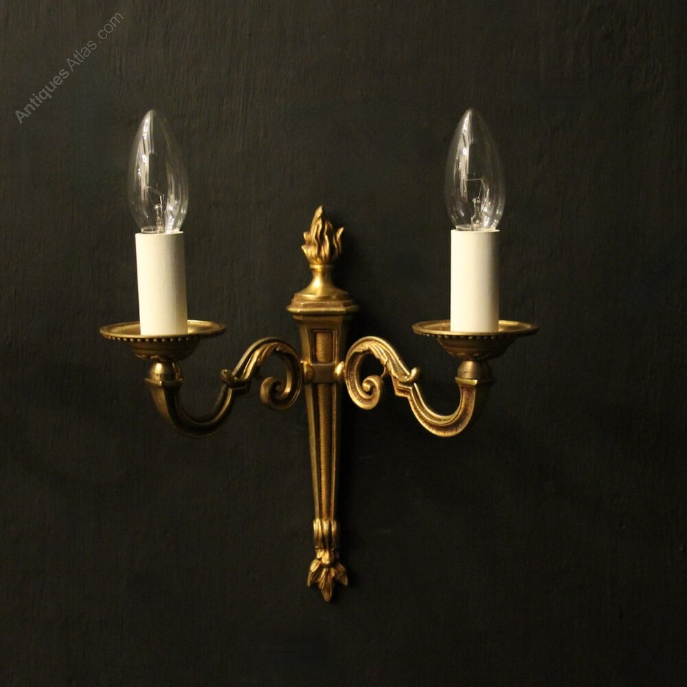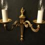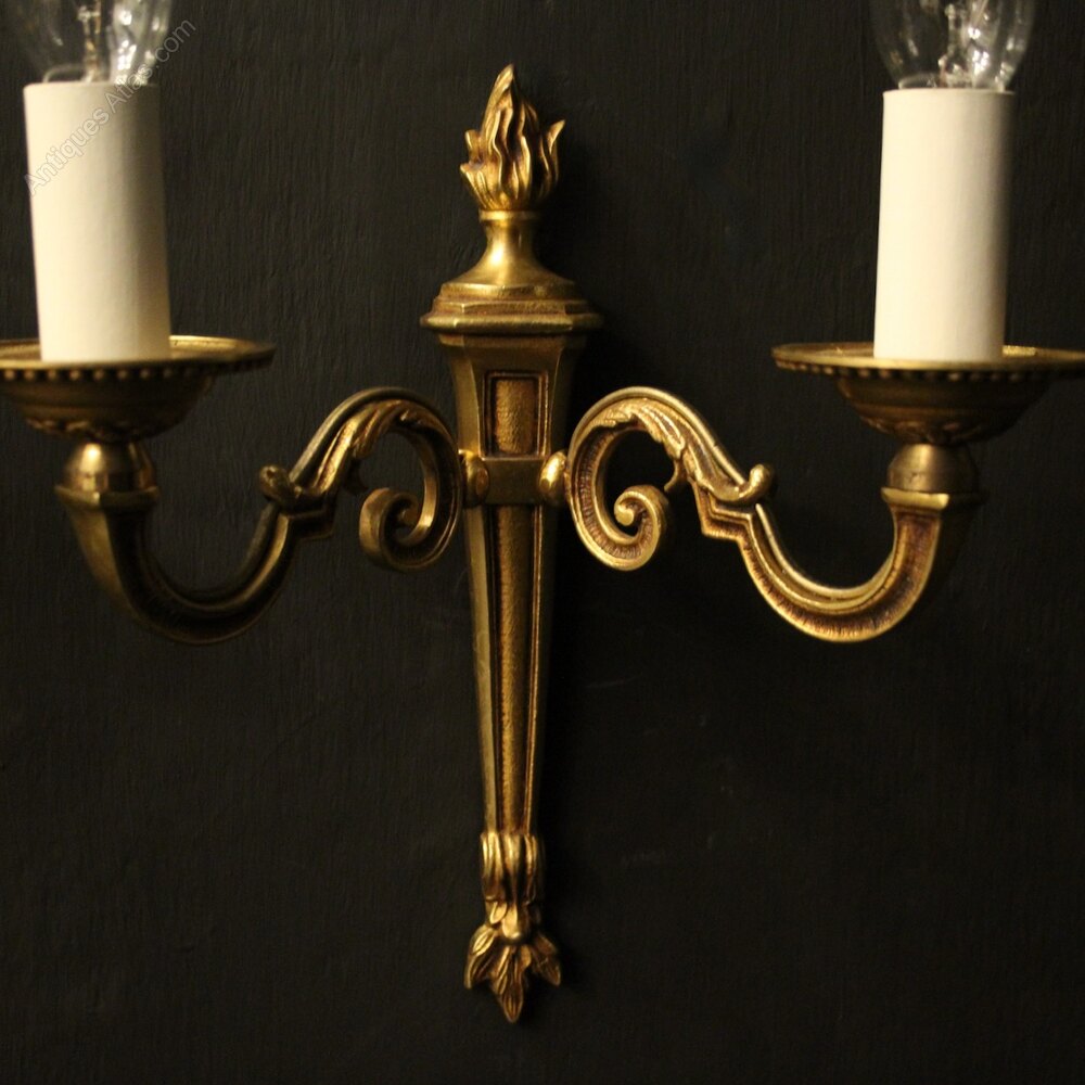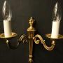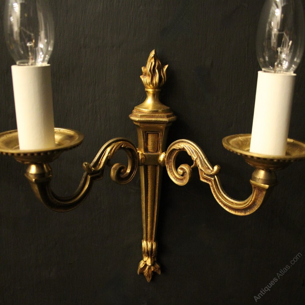 A small French pair of gilded brass twin arm wall lights, the scrolling arms with circular leaf bobeche drip pans, issuing from a reeded tapering backplate with flame finial, nice original patination. Fully rewired and PAT tested. All our wall lights come with aged brass screws for fixing and spare bulbs.