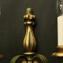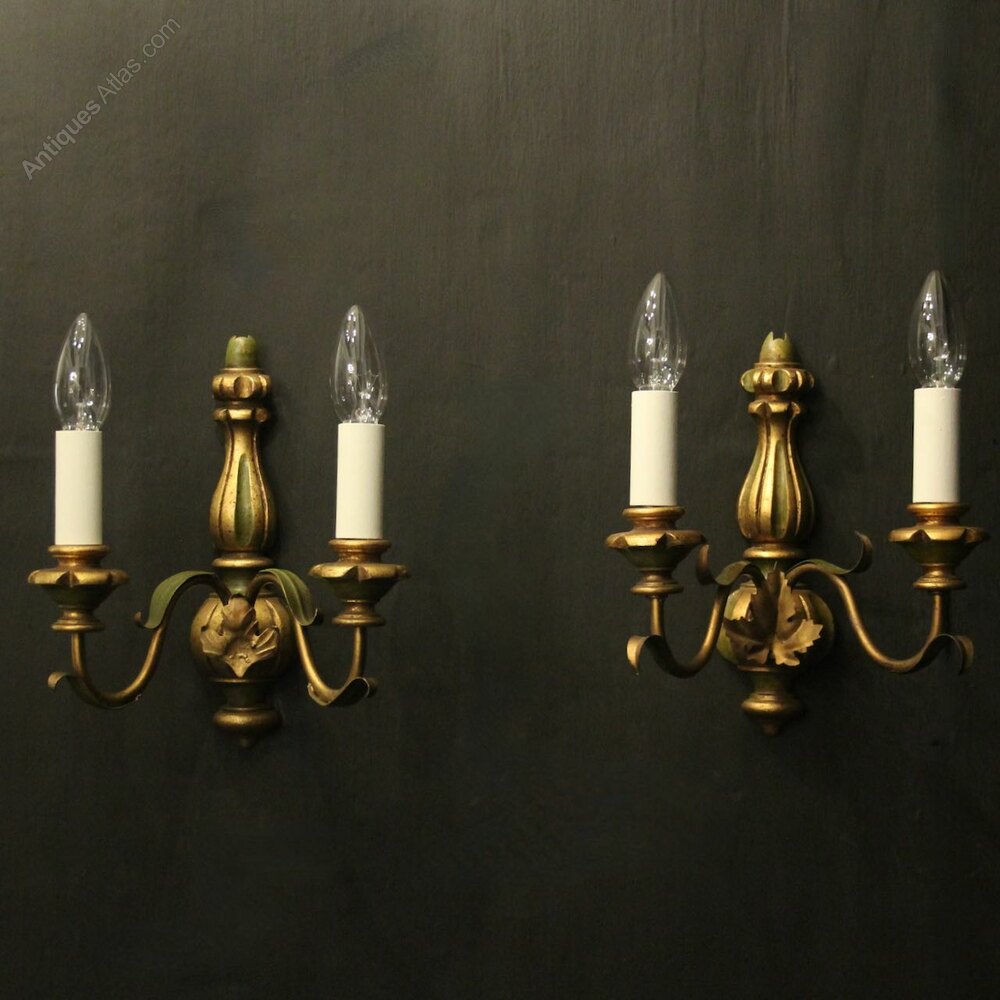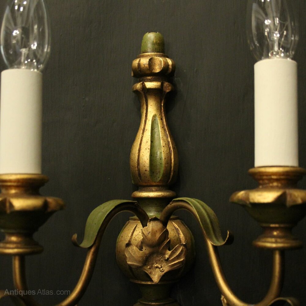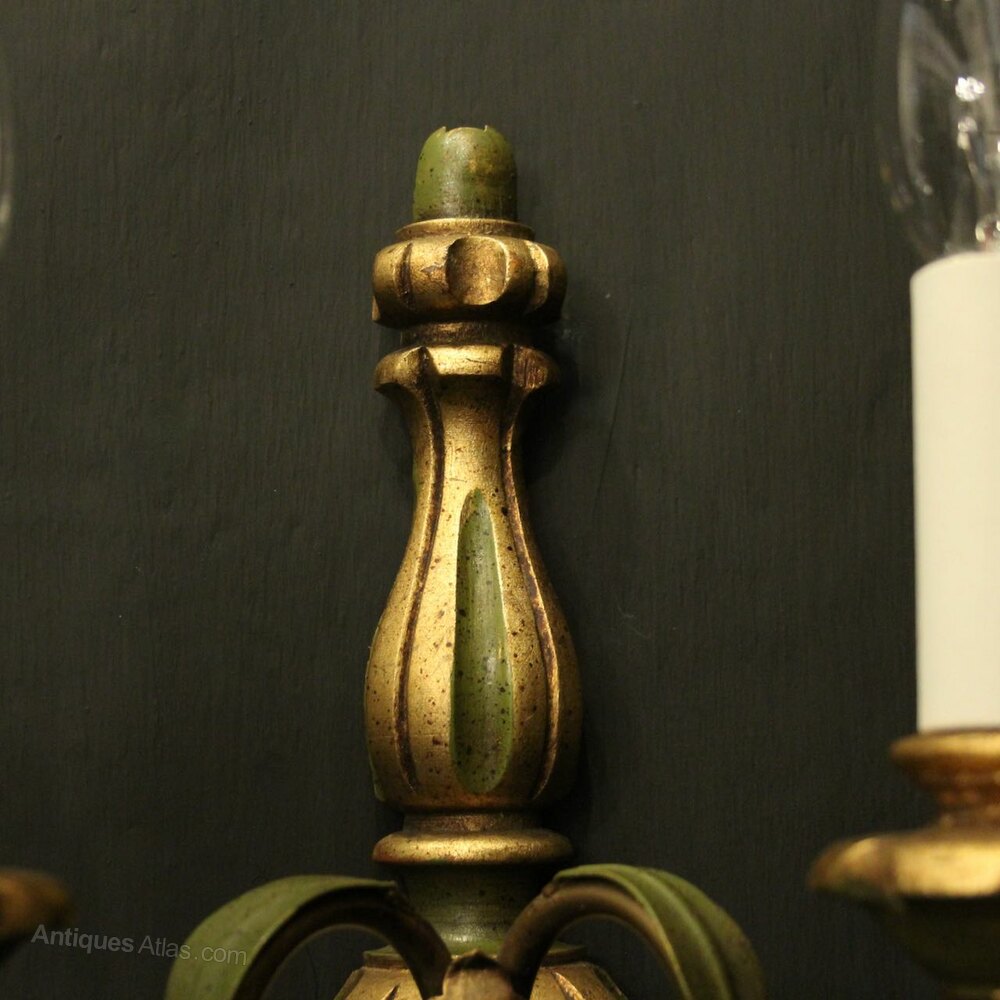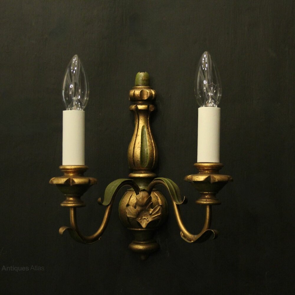 A pretty French pair of carved giltwood, Toleware and polychrome twin arm wall lights, the toleware leaf scrolling arms with wooden scalloped candle sconces, issuing from an ornate bulbous scalloped green and gilt wooden backplate, very decorative and nice patination. Fully rewired and PAT tested. All our chandeliers come with ceiling fixings and spare bulbs.