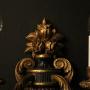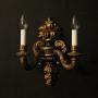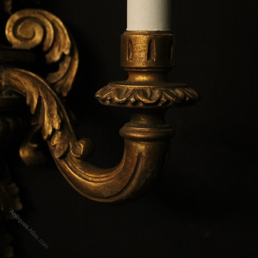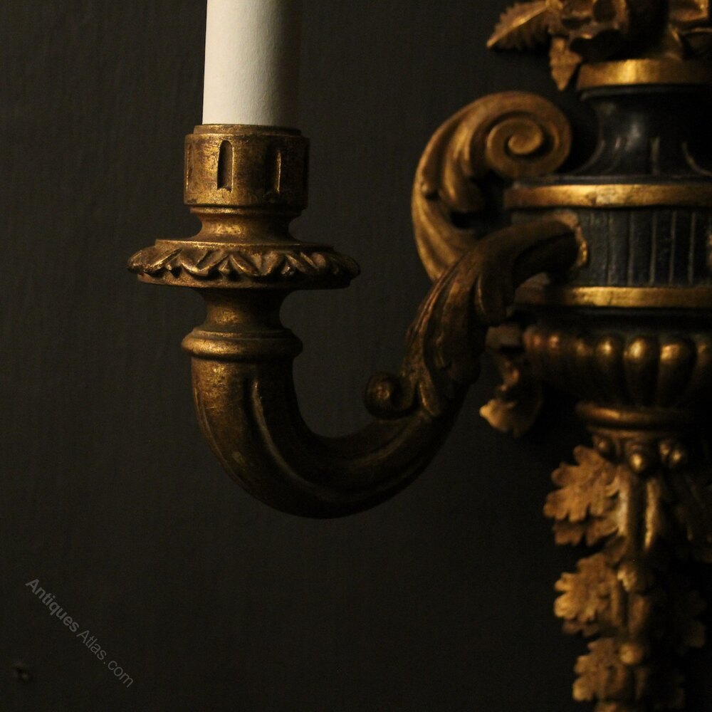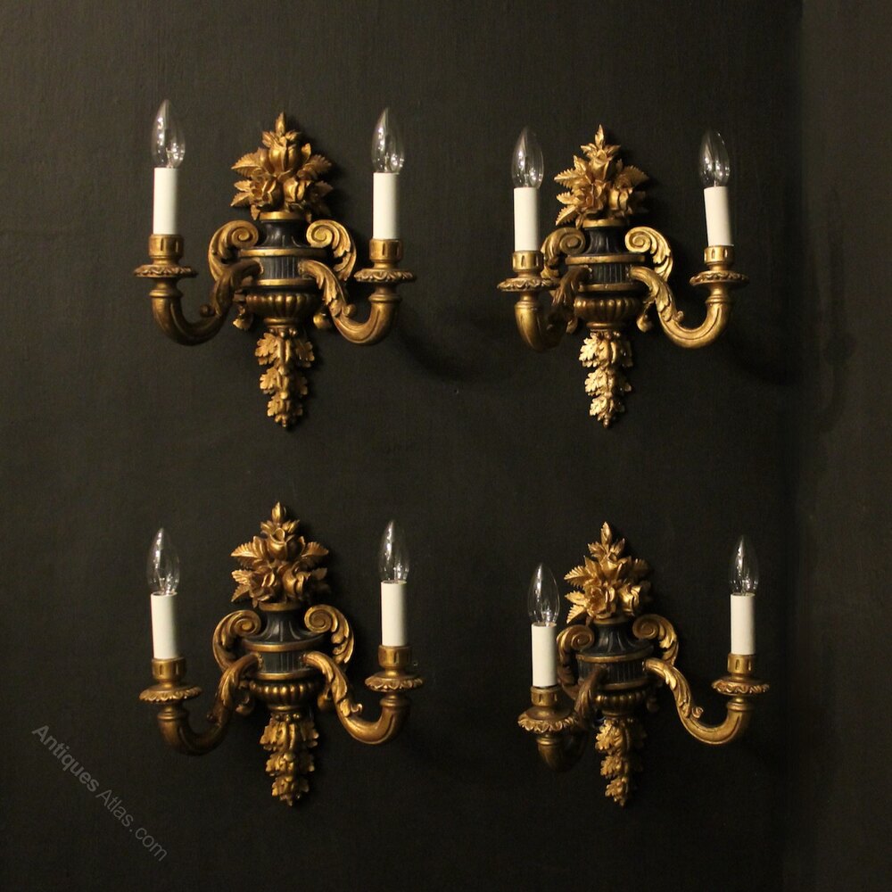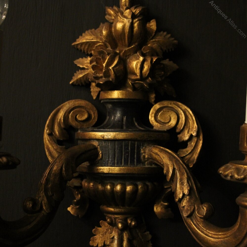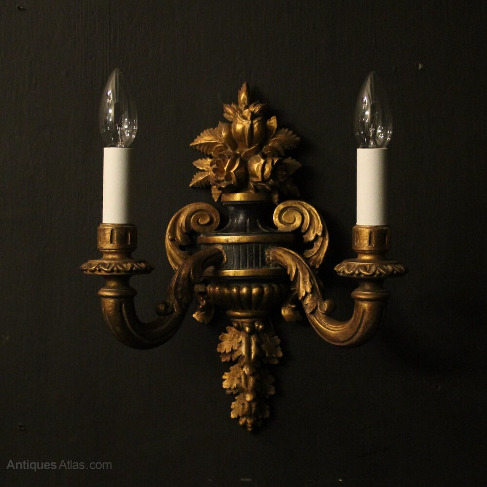A French set of 4 carved gilded wooden twin arm antique wall lights, the wooden reeded scrolling arms with circular bobeche drip pans and reeded candle sconces, issuing from an ornately carved ebonised backplate with floral basket canopy and decorative scrolling sides with leaf base, lovely original patination and nicely carved. Fully rewired and PAT tested. All our wall lights come with aged brass screws for fixing and spare bulbs. One wall light has slightly twisted arms so not perfect.