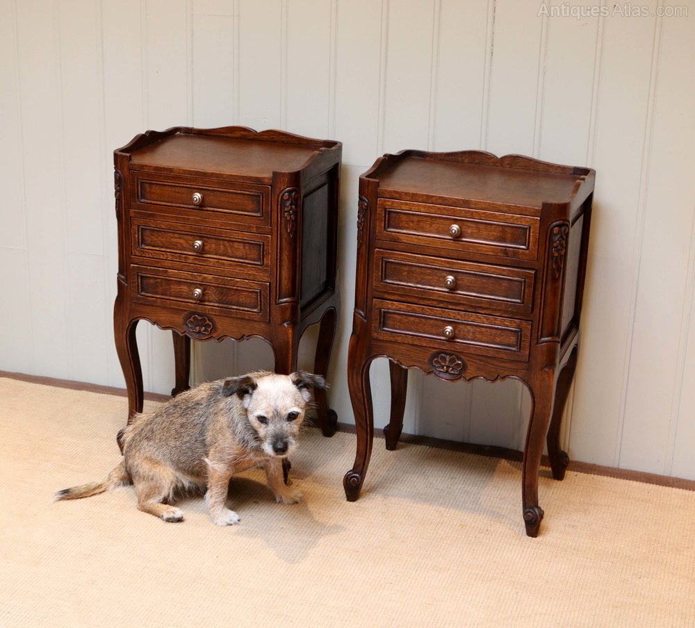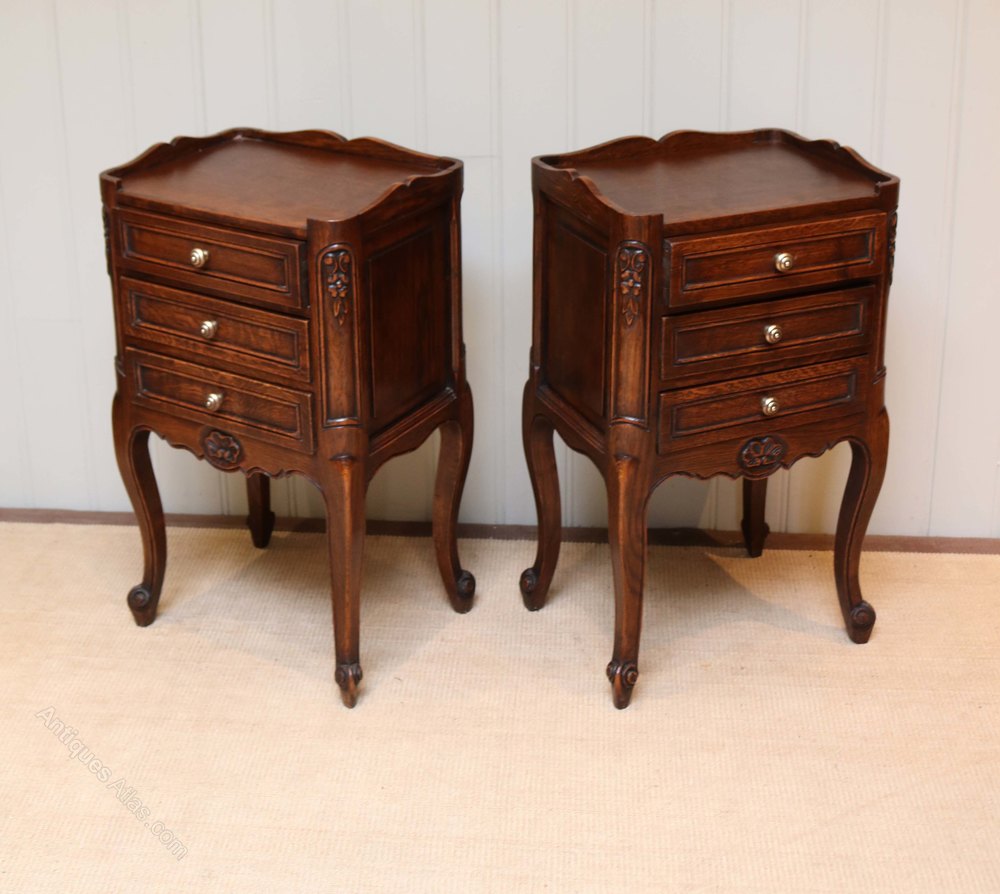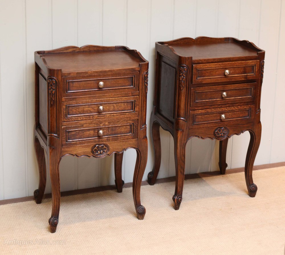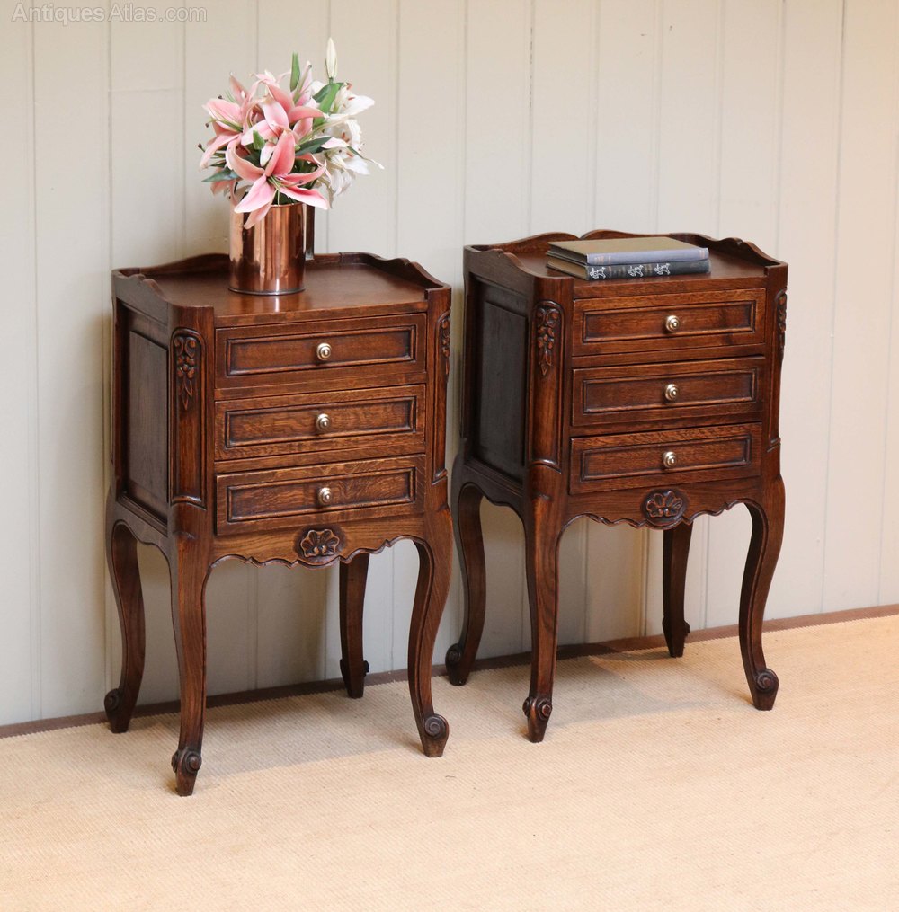 Pair of French solid oak bedside cabinets having three drawers with carved detail to the edges and base raised on cabriole legs