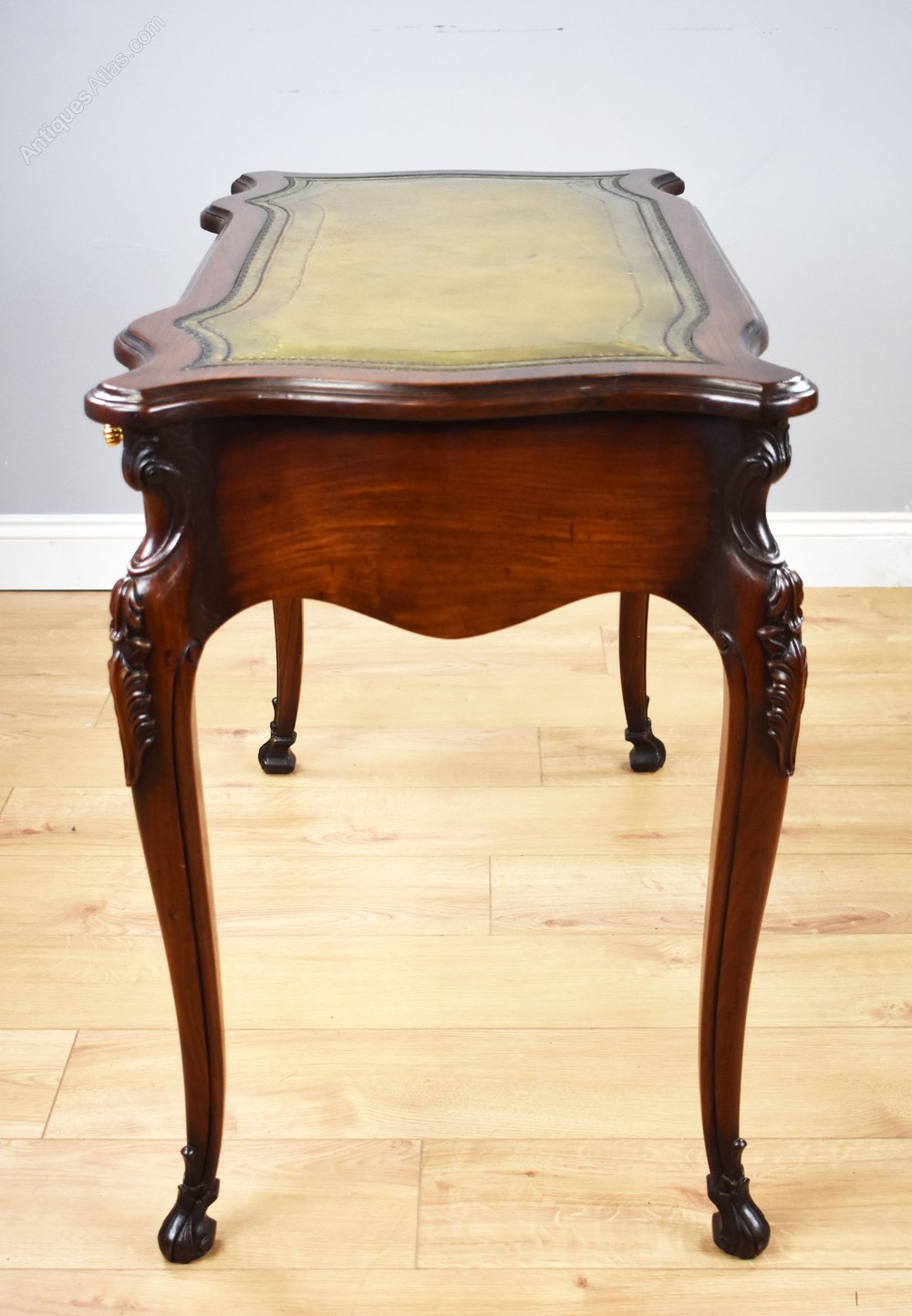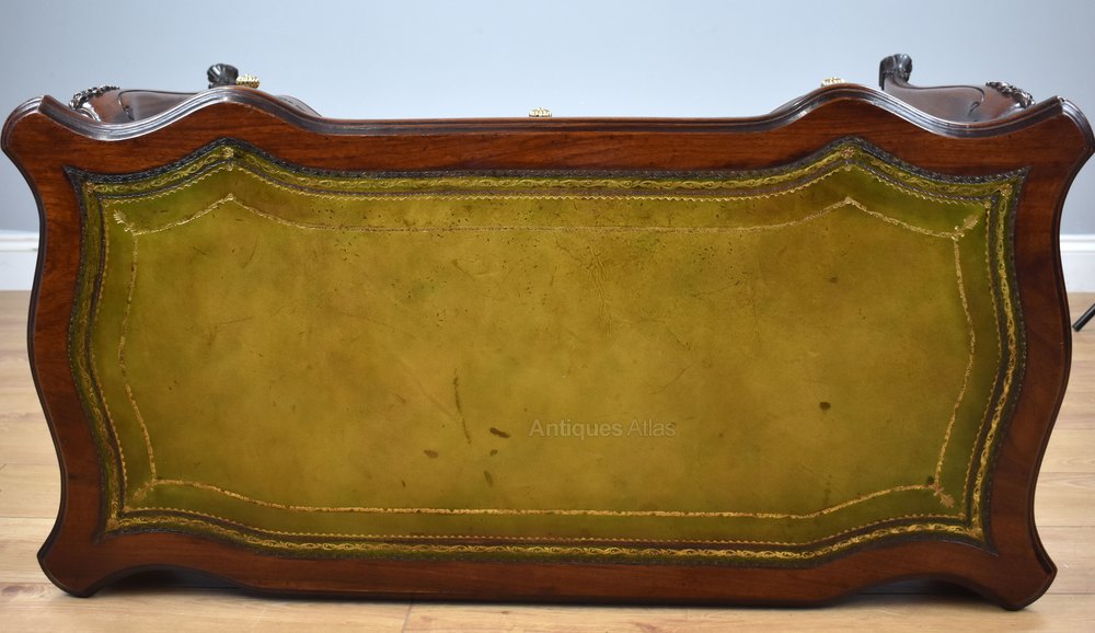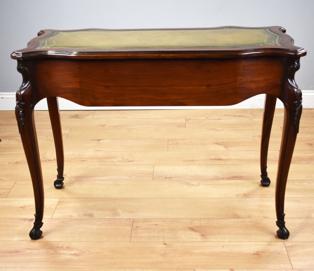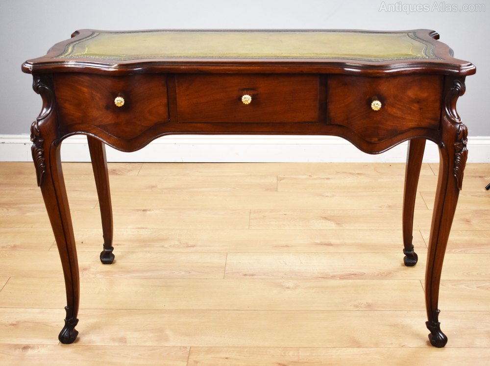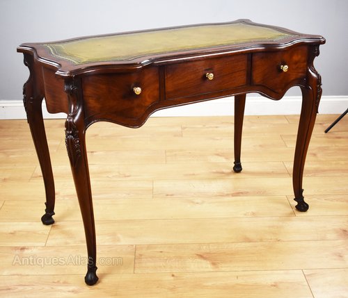 For sale is a good quality French style mahogany writing table. The table, serpentine in form, is inset with superbly shaped top quality leather hide decorated with fine blind and gold tooling. Below this there are three serpentine shaped drawers, each with ornate brass knobs. The desk is raised on elegantly shaped legs with decorative carvings terminating on carved feet. This is a very elegant piece and is in excellent condition for its age.