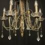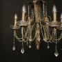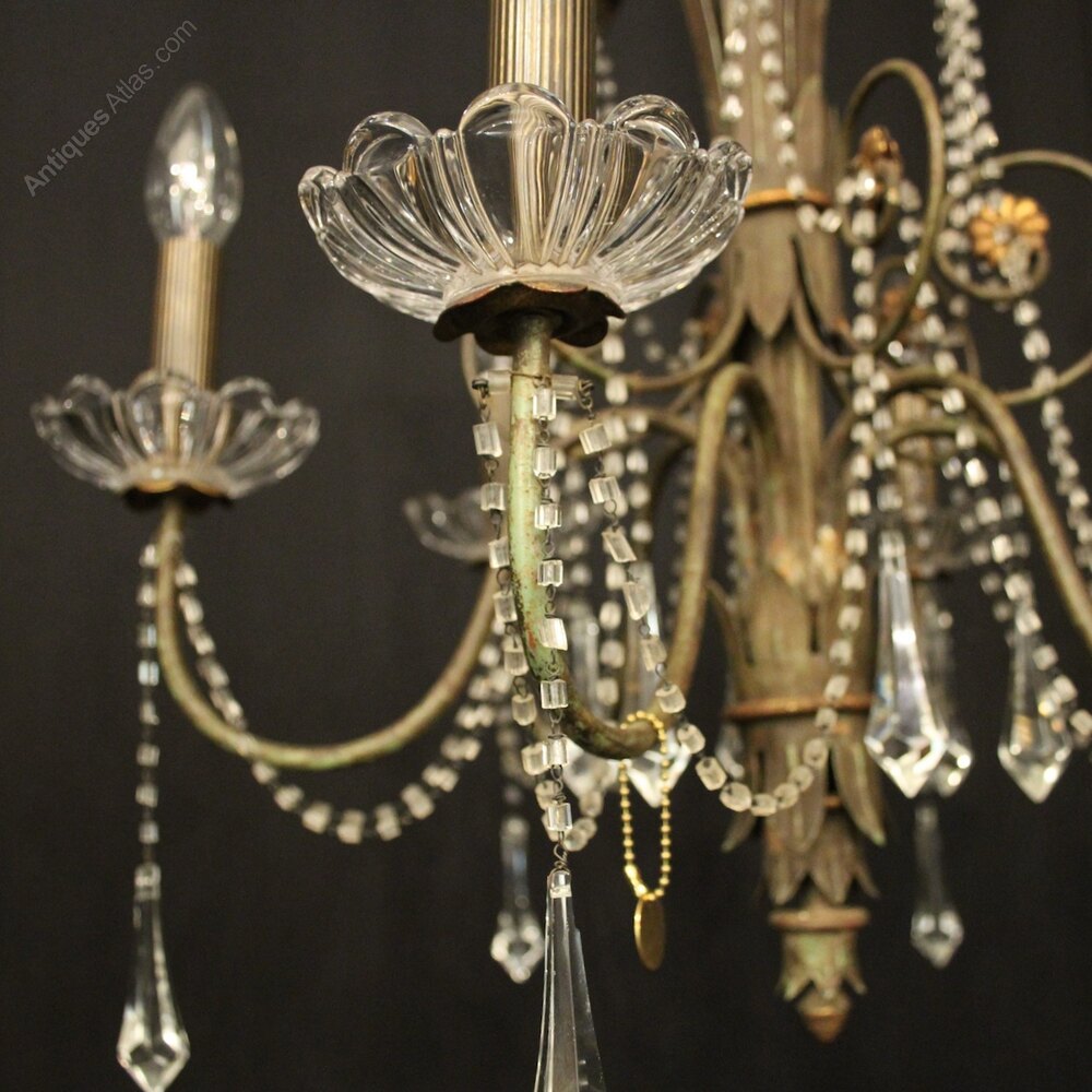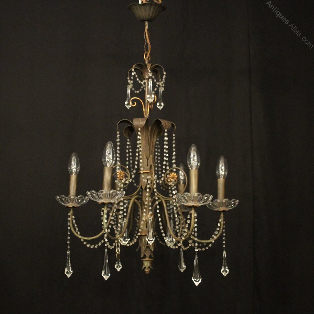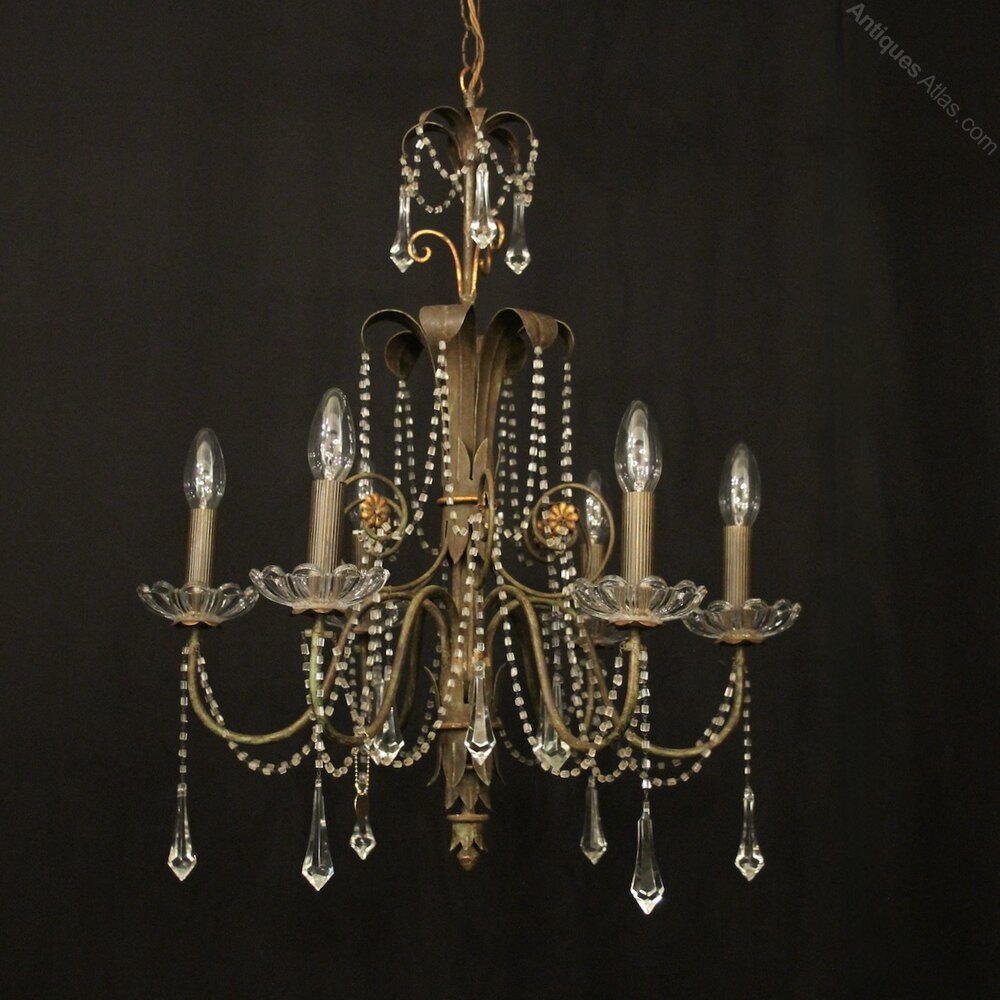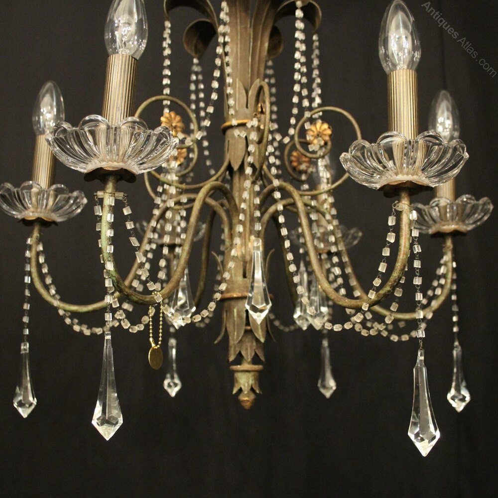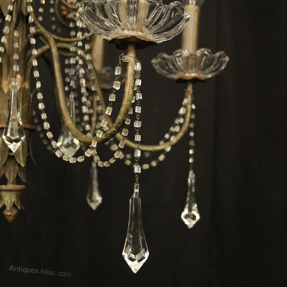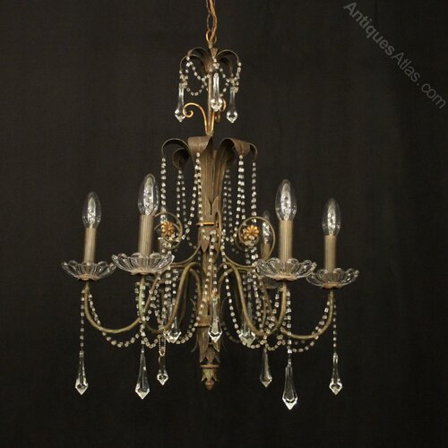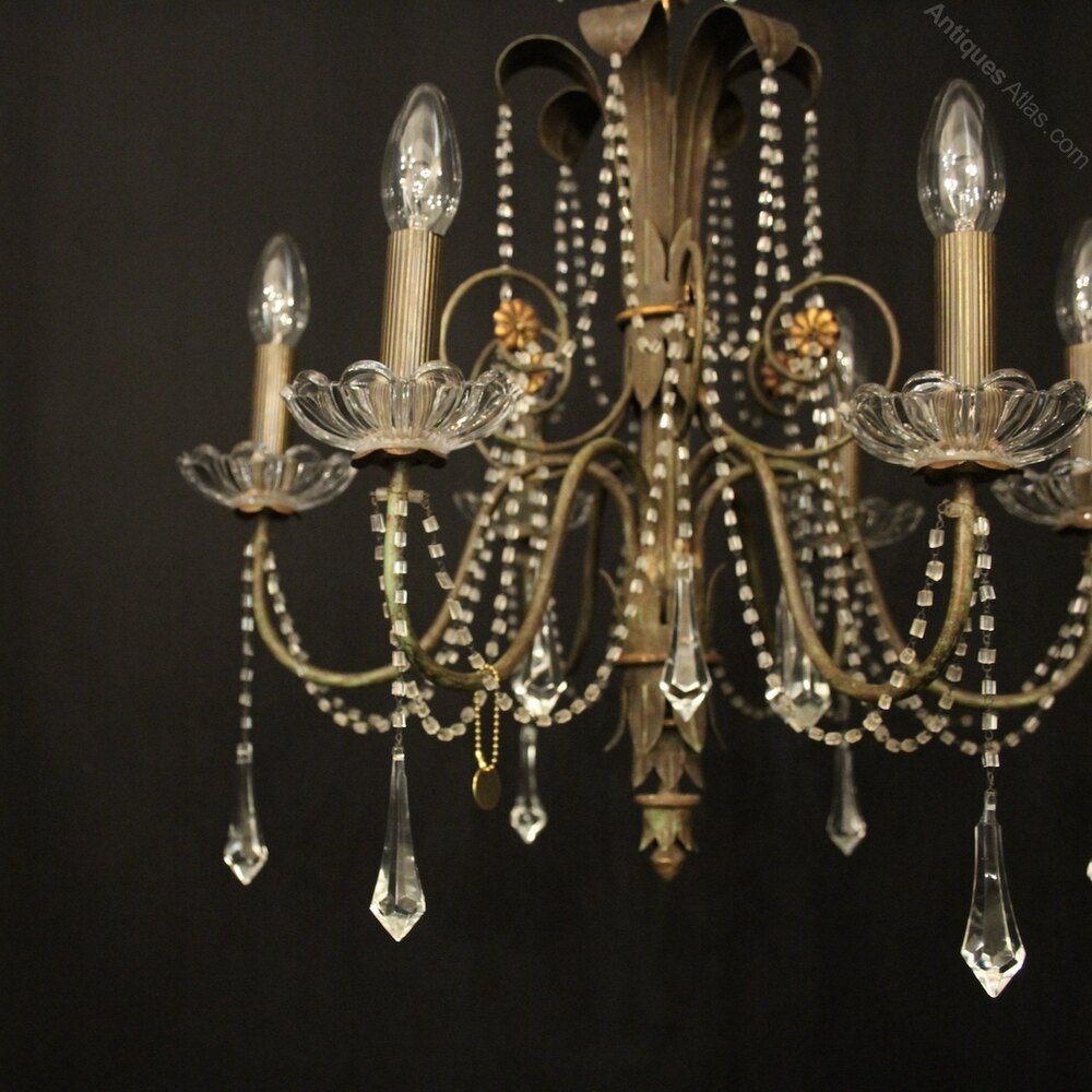 A lovely French polychrome toleware and crystal six light antique chandelier, the scrolling arms with glass bobeche drip pans, issuing from an ornate foliated leaf centre and decorated with swaged crystal chains with crystal pendants. Having the original chain and ceiling rose. Super original patination and a very pretty light fitting. Fully rewired and PAT tested. All our chandeliers come with bulbs and ceiling fixings.