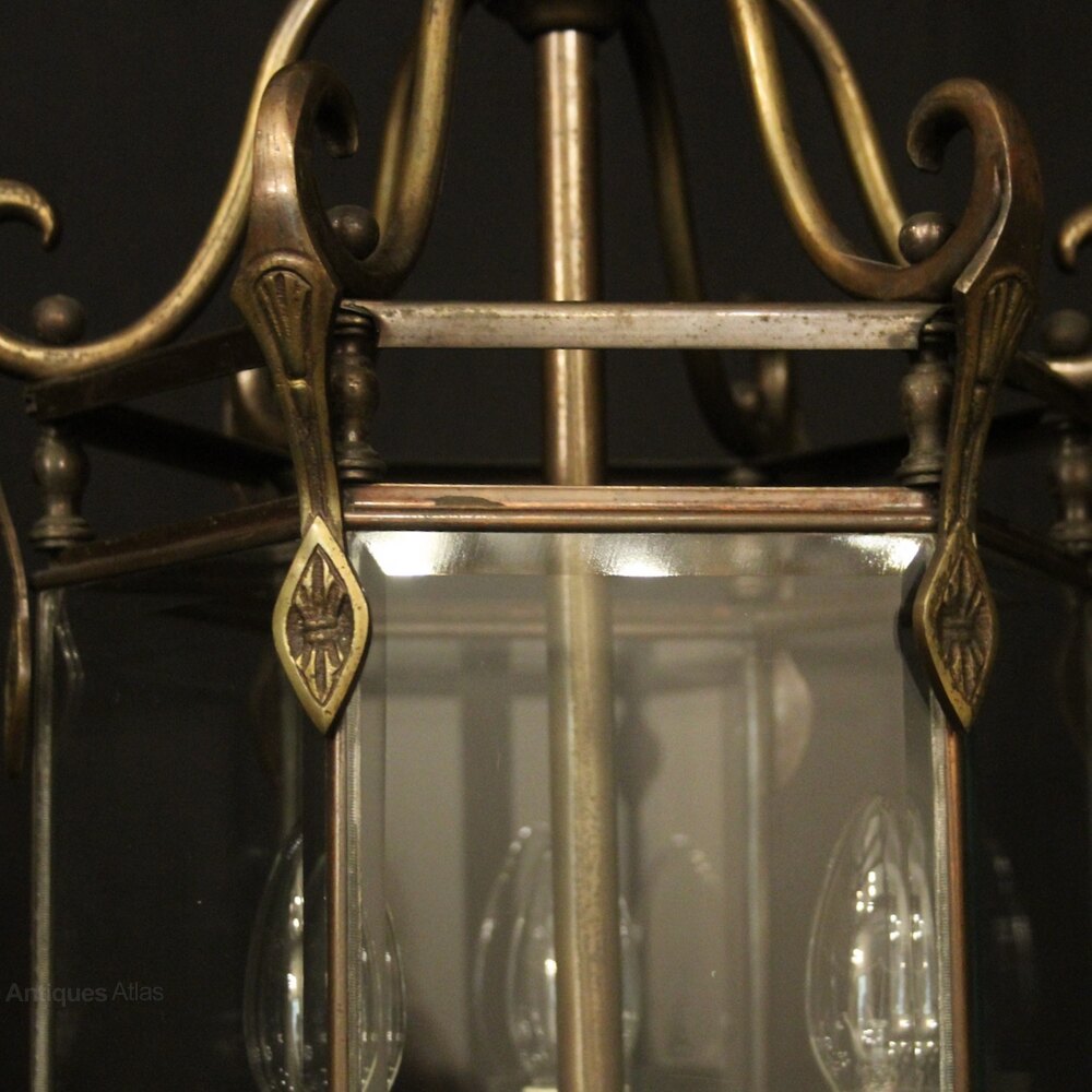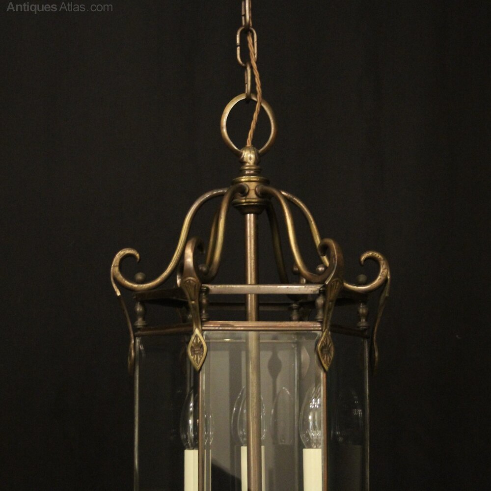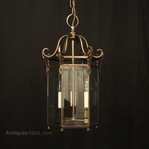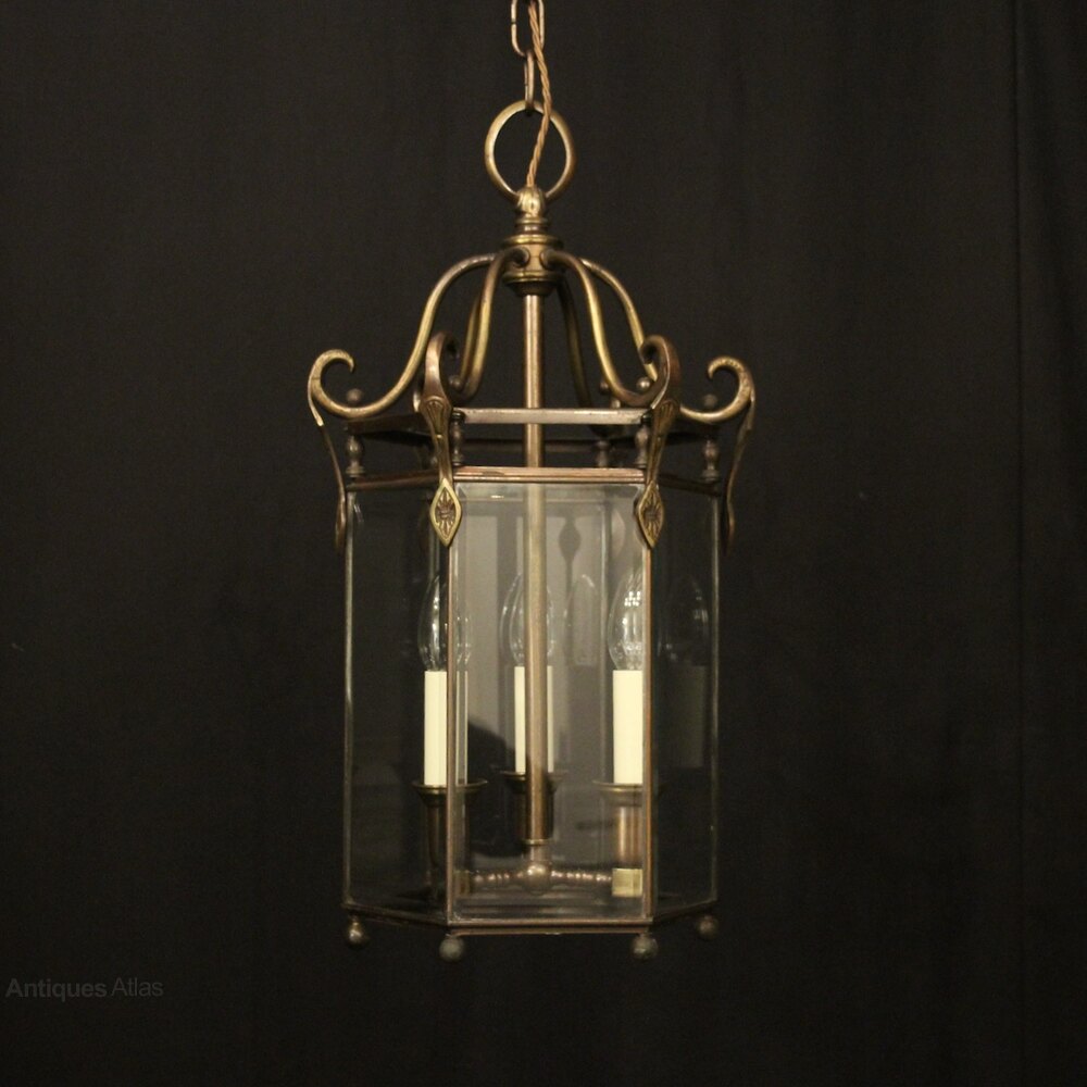 A French oxidized gilded brass triple light hexagonal antique hall lantern, the six bevelled glass panels held within a brass framework with decorative lozenge embellishments, the central column with three trumpet light fittings and scrolling canopy with decorative ball finials, having the original chain and ceiling rose. Fully rewired and PAT tested. All our lanterns come with bulbs and ceiling fixings.