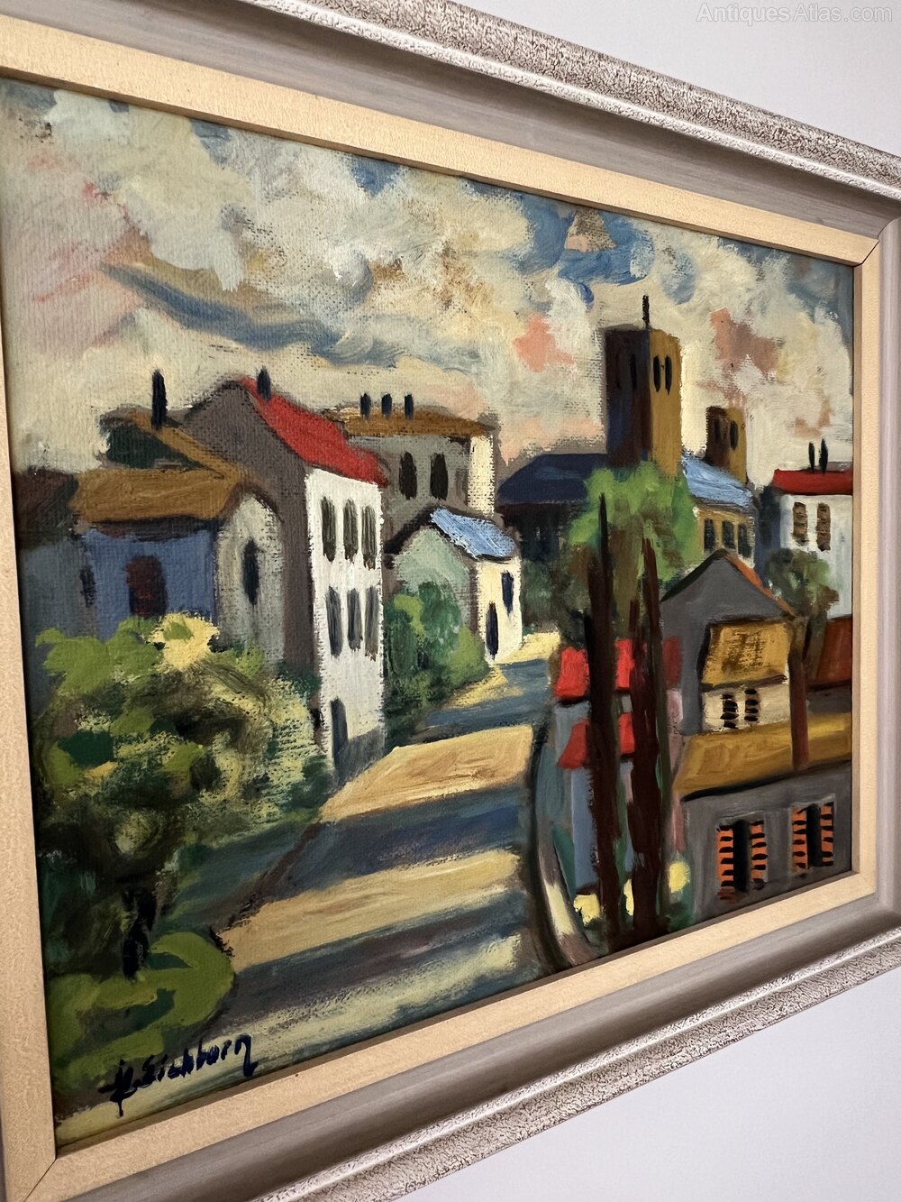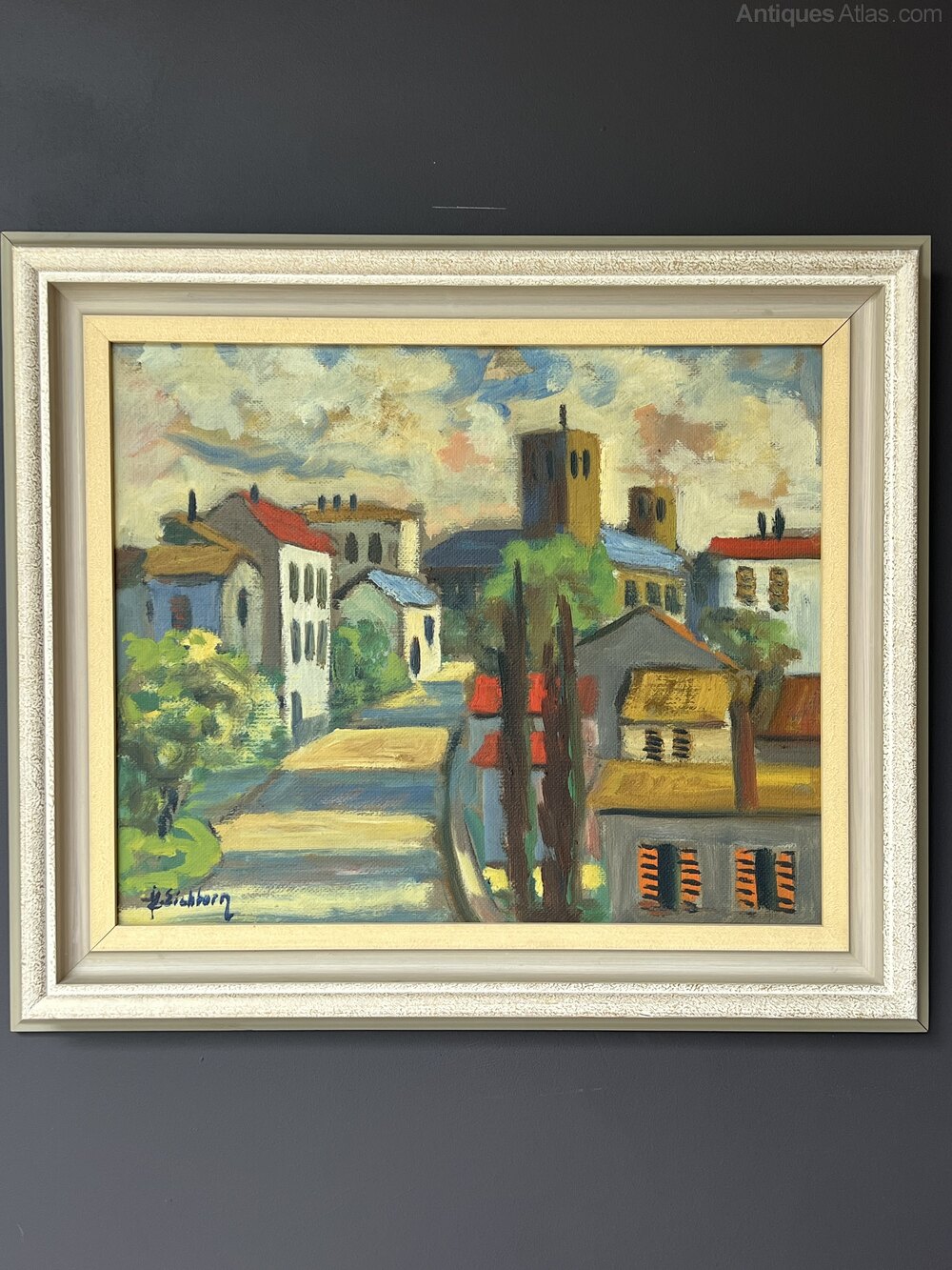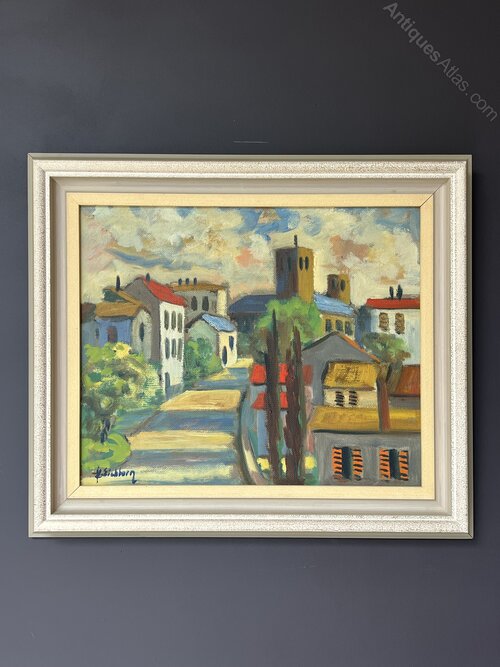 Mid-Century Oil on Board of a French village landscape. A typical French village scene evoked in bold hues by listed Swedish artist Jack Eichborn (1906-1981).