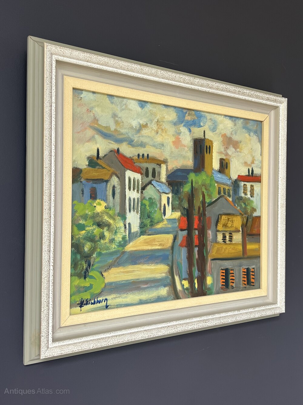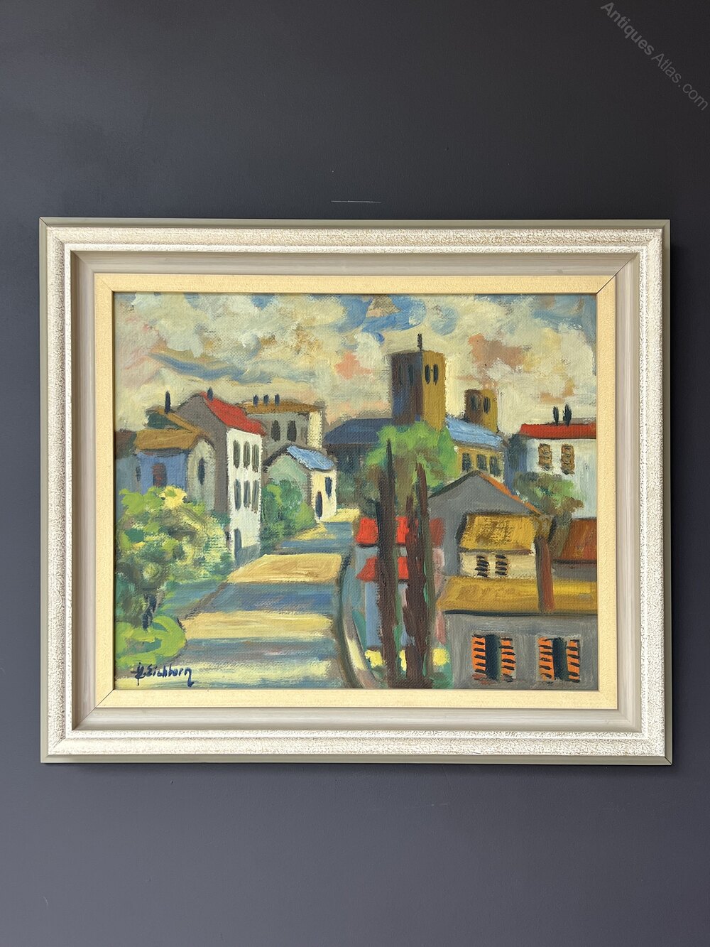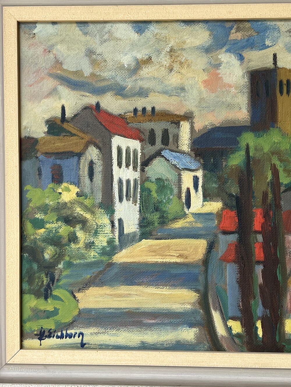Mid-Century Oil on Board of a French village landscape. A typical French village scene evoked in bold hues by listed Swedish artist Jack Eichborn (1906-1981).