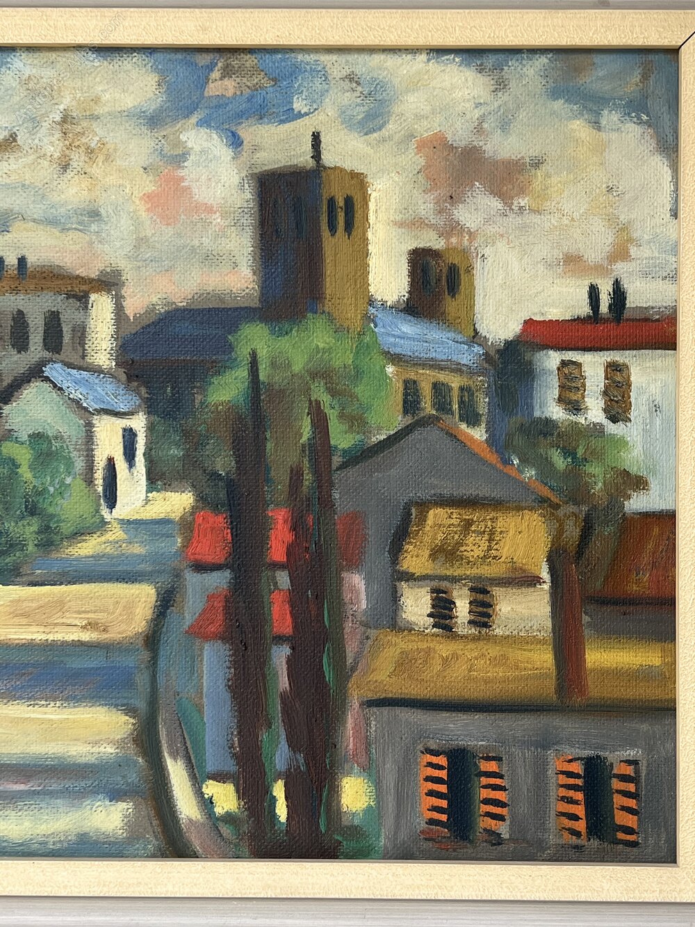 Using strong colour and vivid brushwork the artist evokes a typical French village landscape.