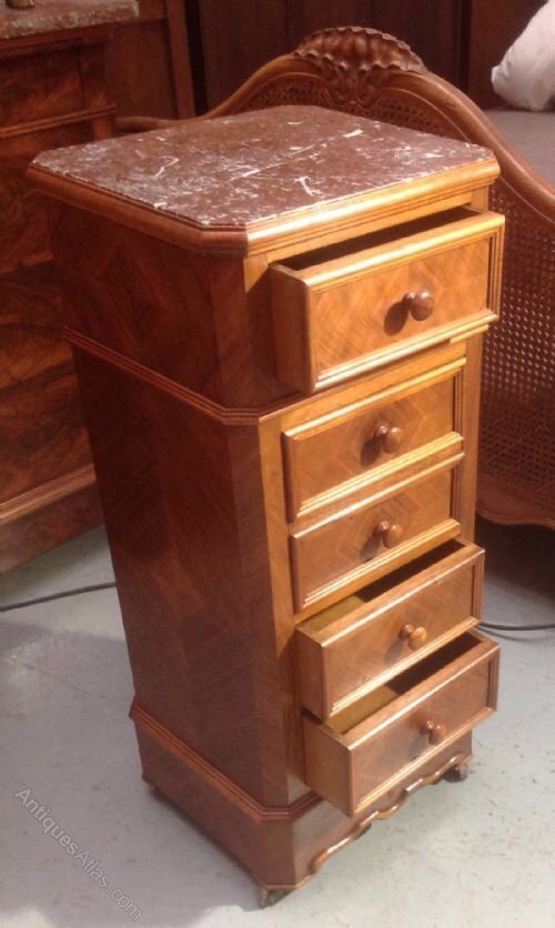 There is a top drawer with a marble lined cupboard and three drawers below.