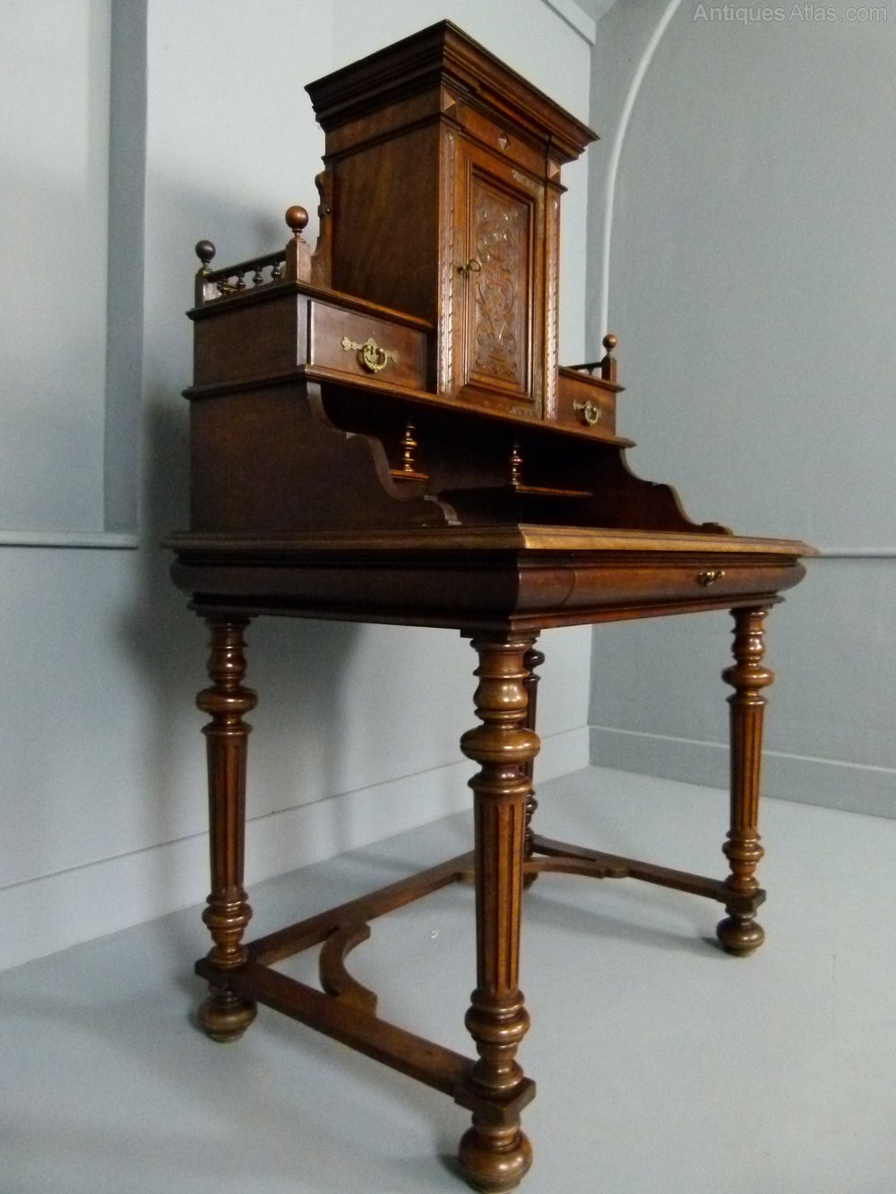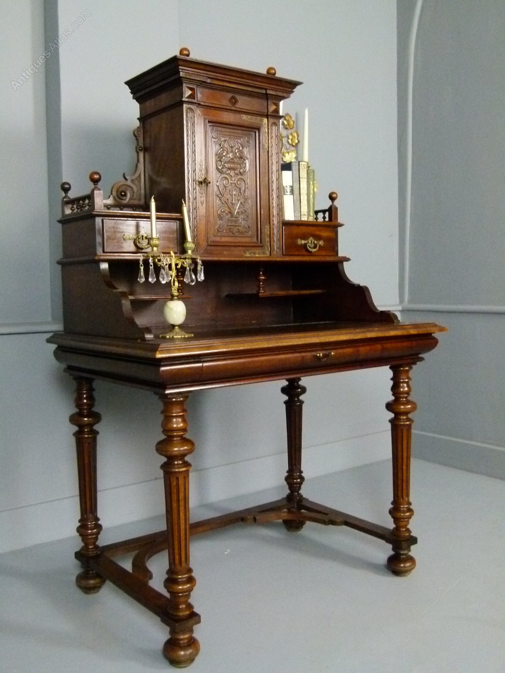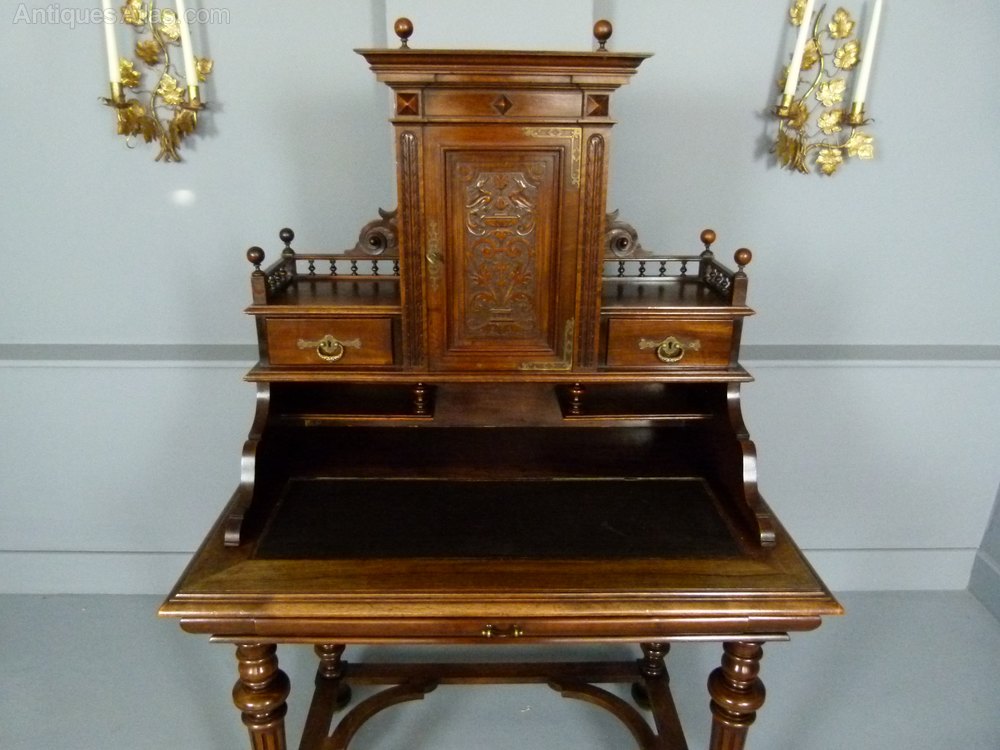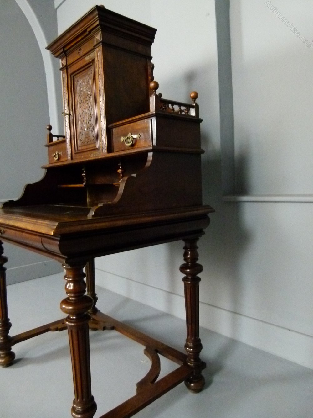 This very elegant desk is made of solid walnut. The galleried super-structure has a central cabinet, flanked by two drawers, with very pretty and high quality ornate brass handles. The cabinet door is particularly lovely, having a beautifully carved door, with ornate pierced brass hinges. Matching ornate escutcheon, with original working lock and key.