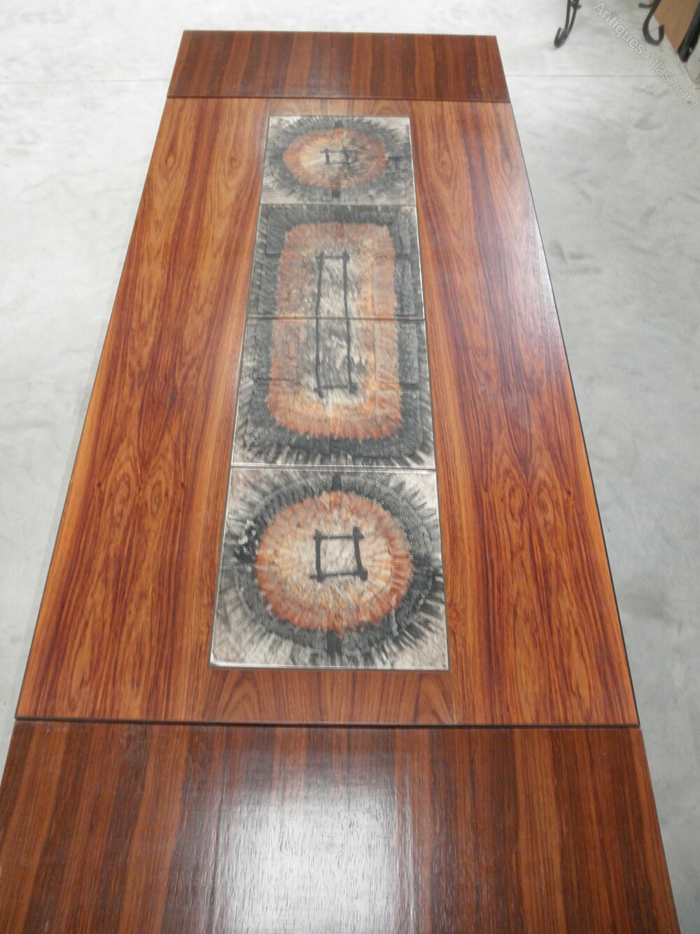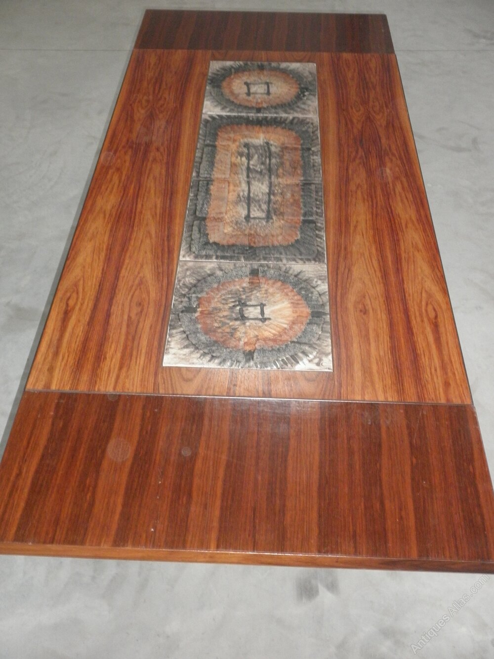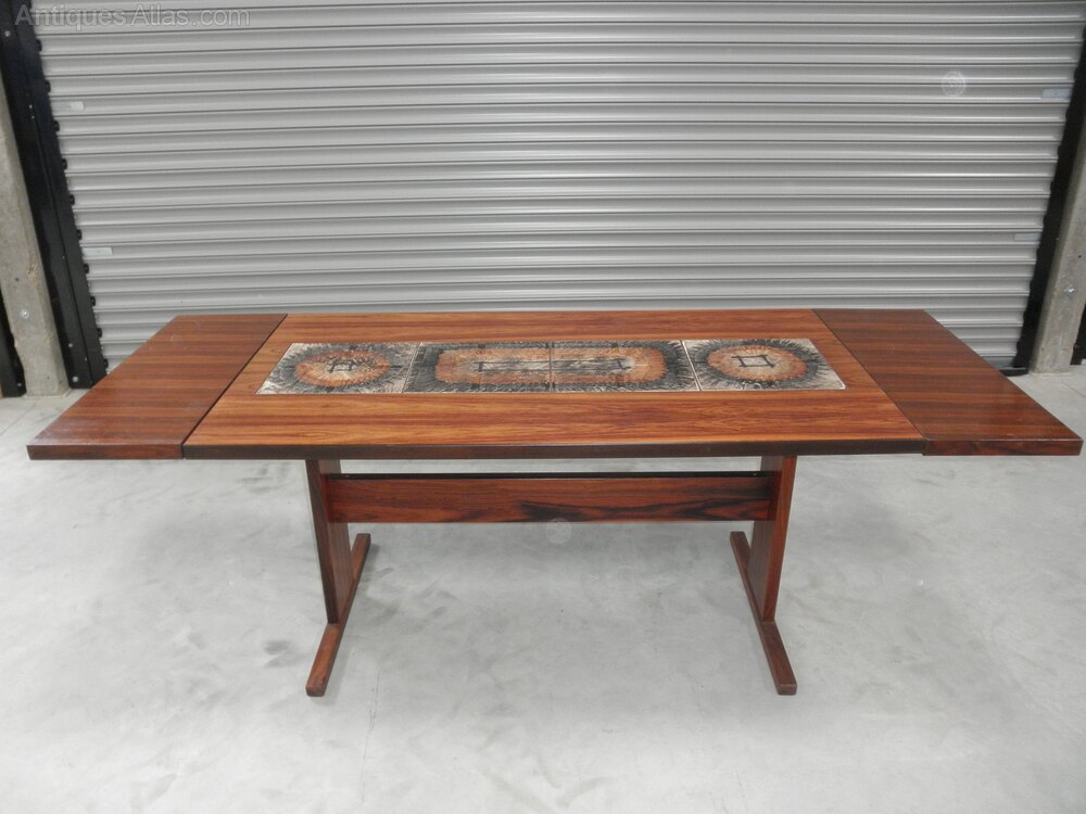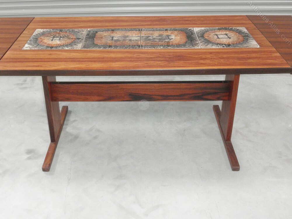 Produced by Gangsø Møbelfabrik, Denmark, in a mid-century-modern refectory style this rectangular rosewood veneered dining table dates from the 1970s, featuring inset central tiles with detachable draw-leaf extending ends.