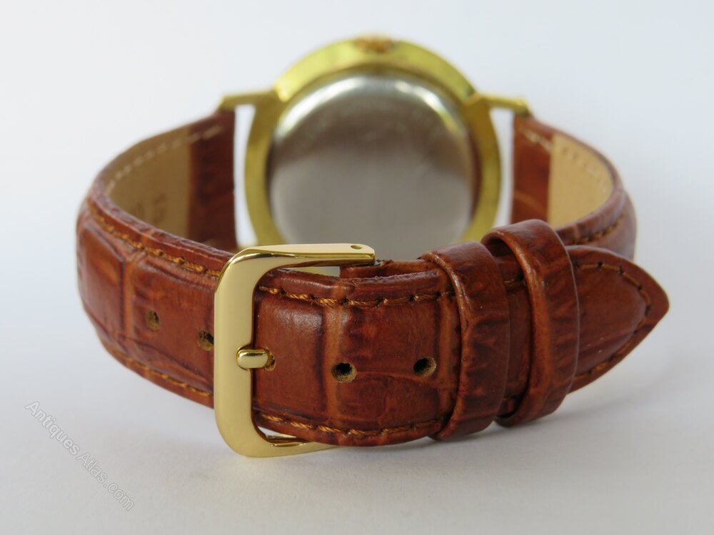 The watch measures 34.5mm diameter excluding the winding crown and the lugs. The case is gold plated while the case back is stainless steel.