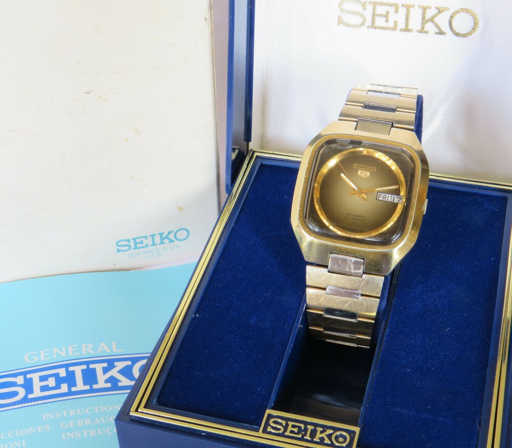 The watch comes in a Seiko presentation box, complete with sleeve (the sleeve is a little tatty and has darkened with age) and a Seiko instruction booklet.