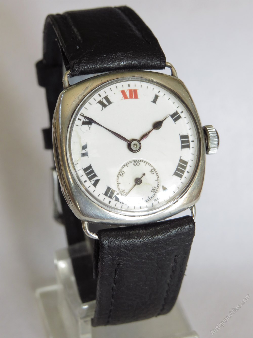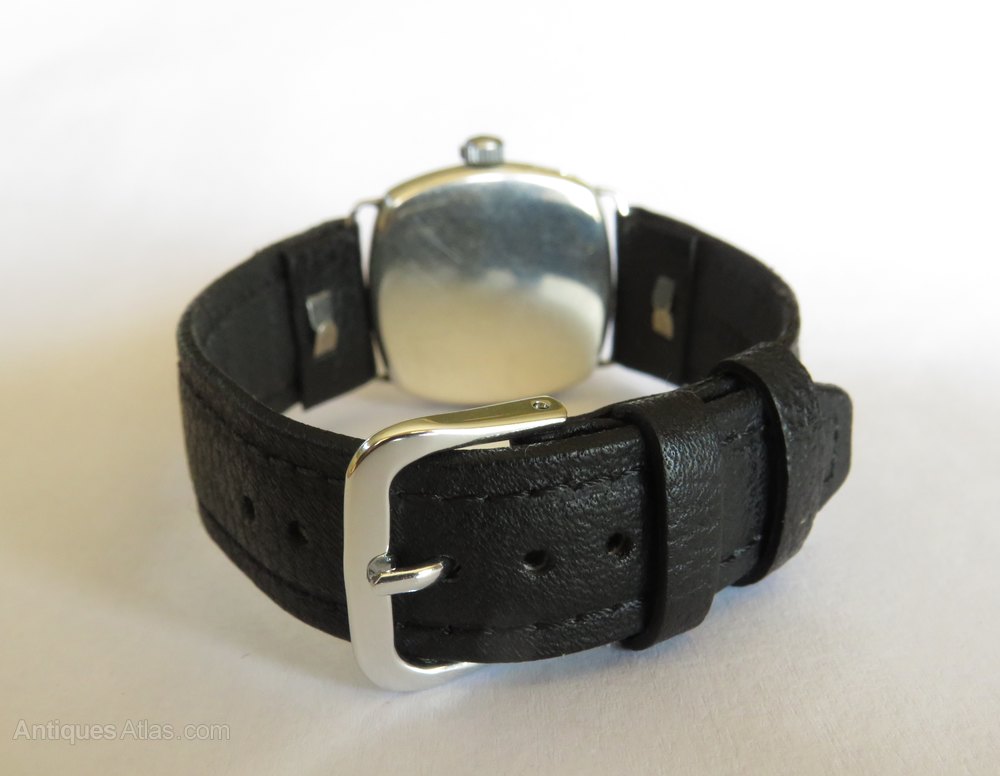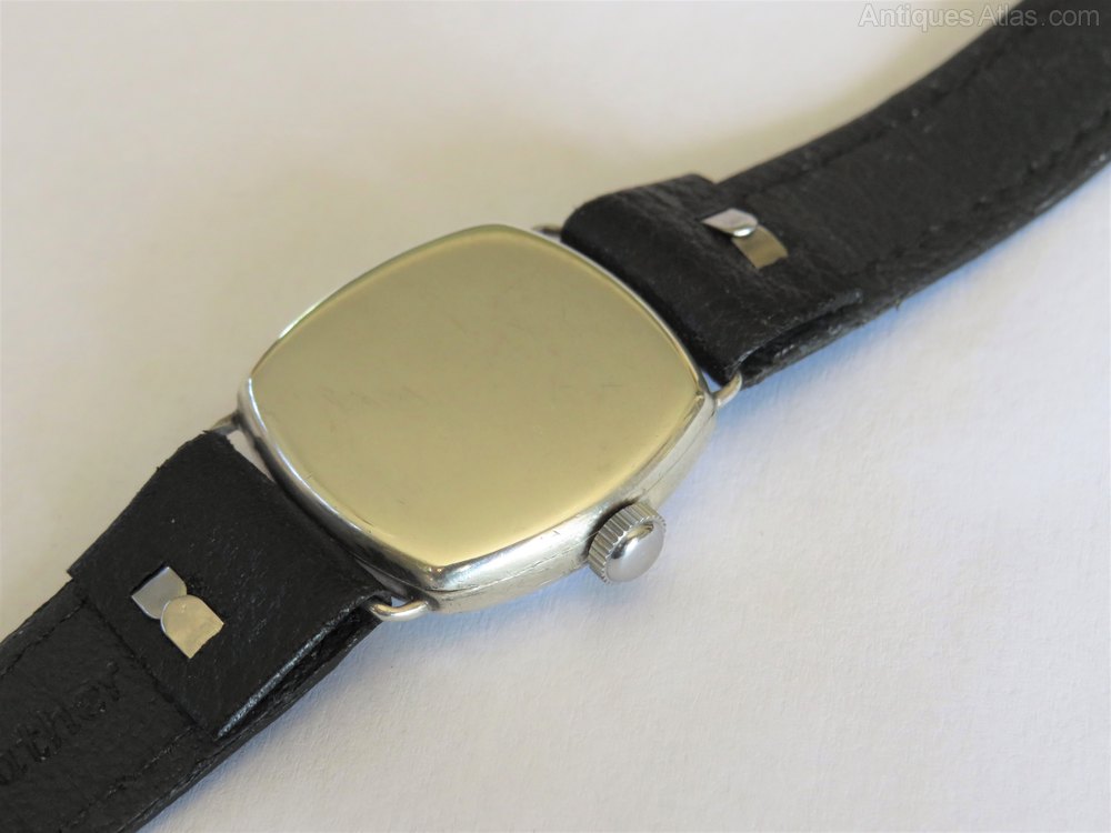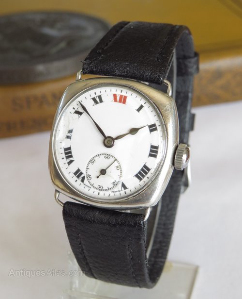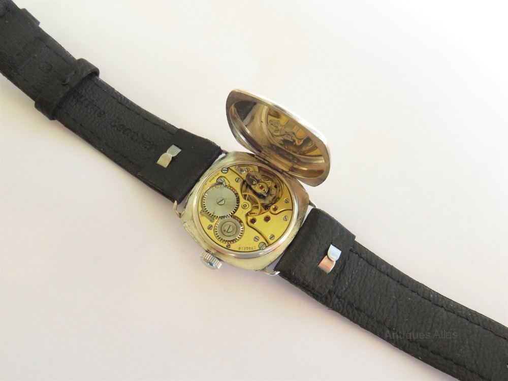 The watch measures 28mm wide excluding the winding crown and 28mm high excluding the fixed lugs so although originally designed to be worn by a man, it would suit a slimmer wrist. The case is silver and there are hallmarks inside the hinged case back for Glasgow (import mark), 1927 with an importer's mark for James Weir.