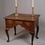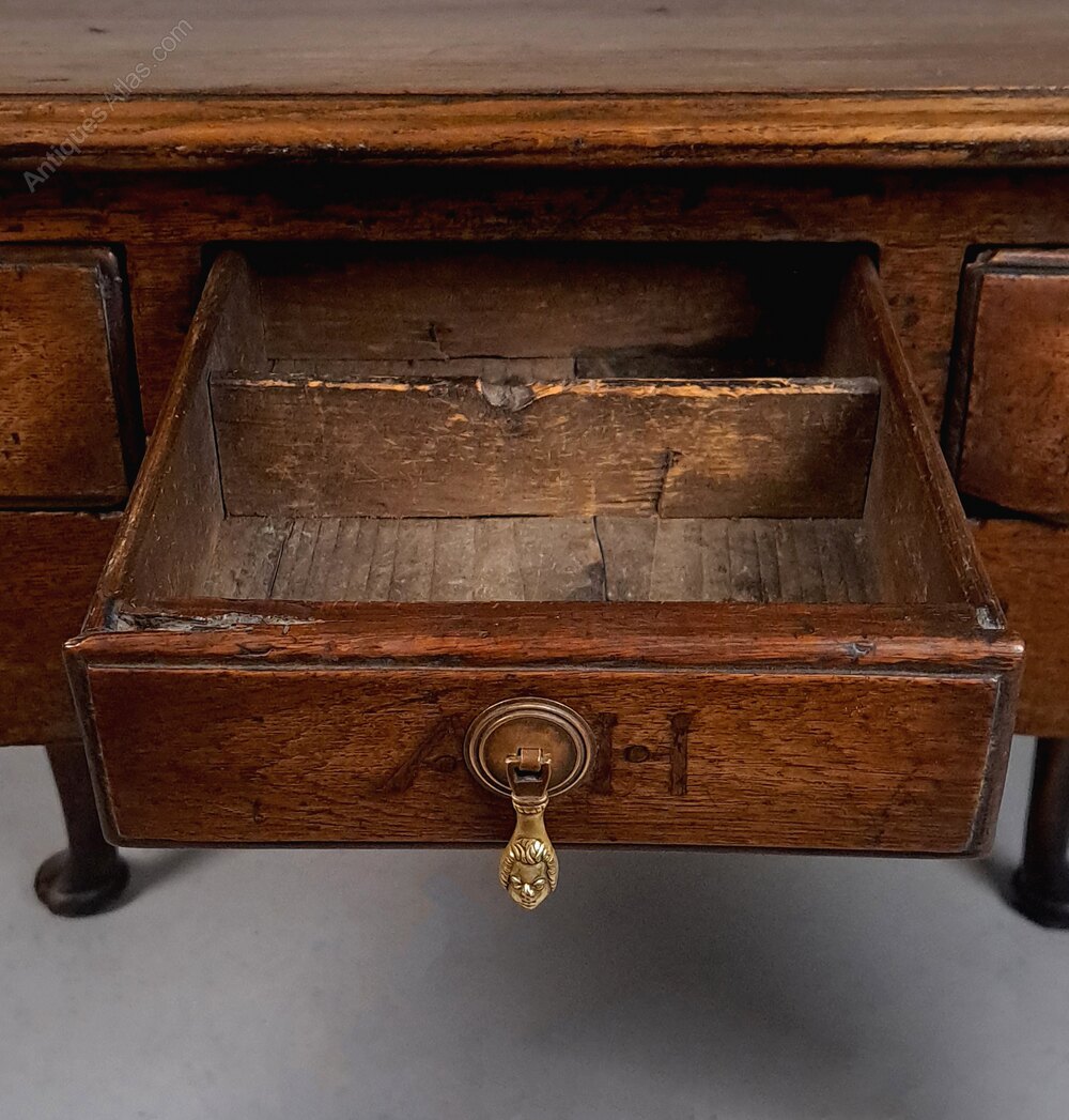 Each of the lowboy’s drawer fronts are inlaid with walnut to give the date 1741 (divided over the two flanking drawers) and on the central drawer front the initials A.H.
