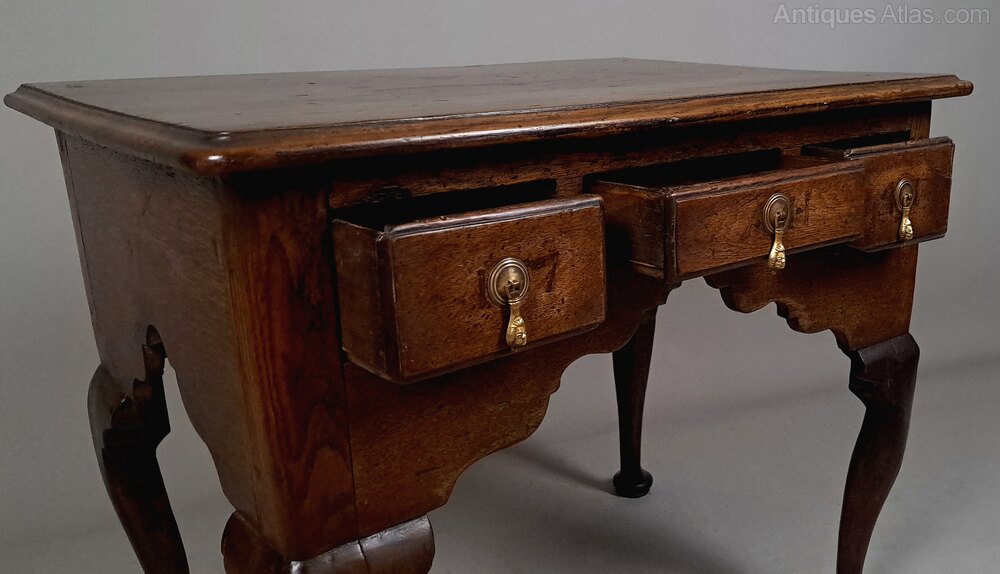 The solid elm over-sailing top has a thumb moulded border and the drawers sit within a well shaped apron which is repeated on both the sides and at the back. The gently shaped cabriole legs are made in solid elm.