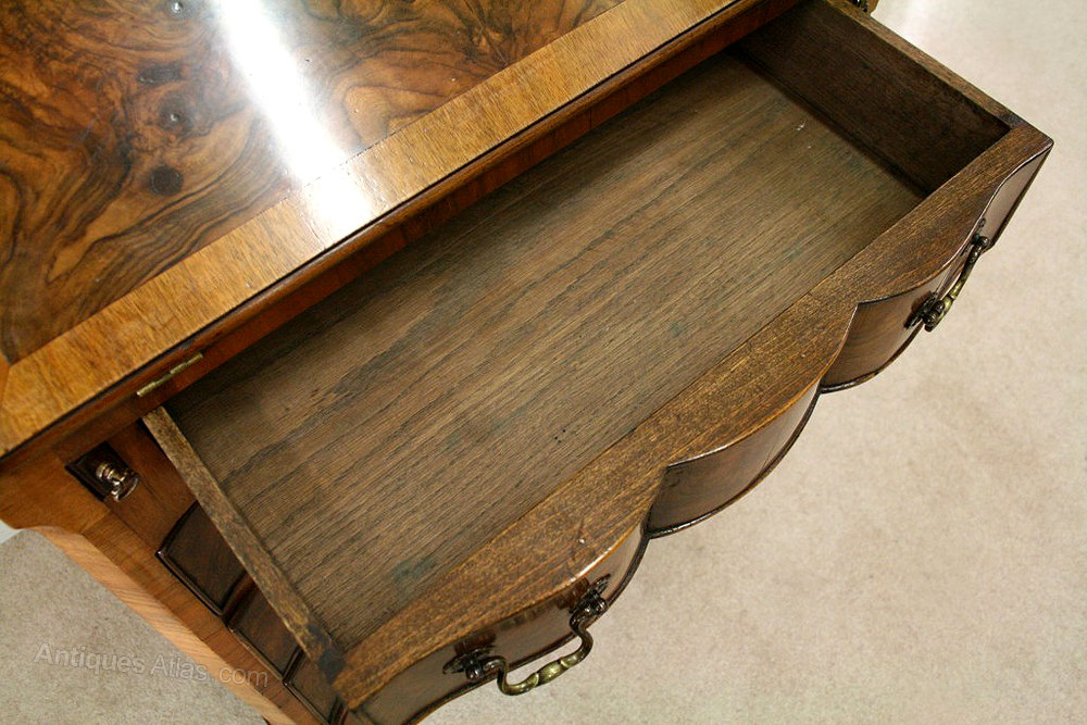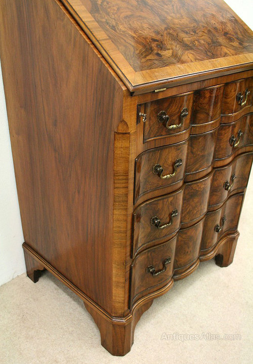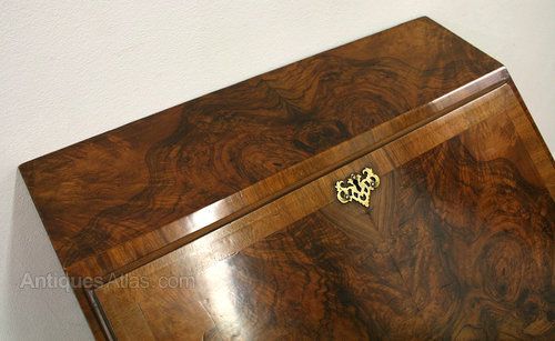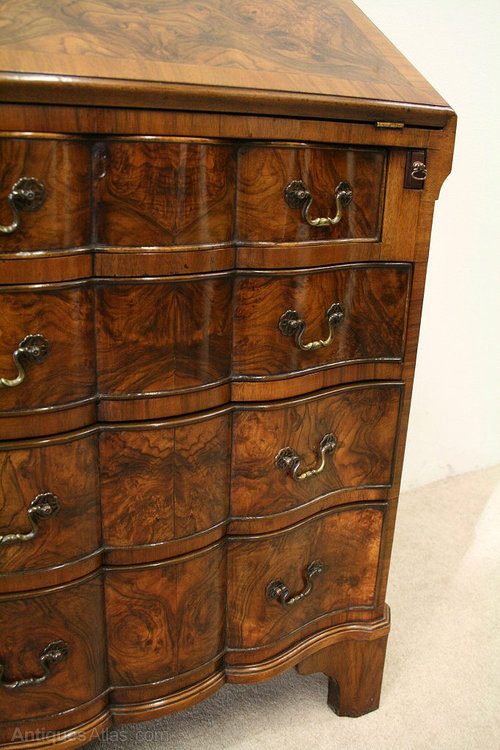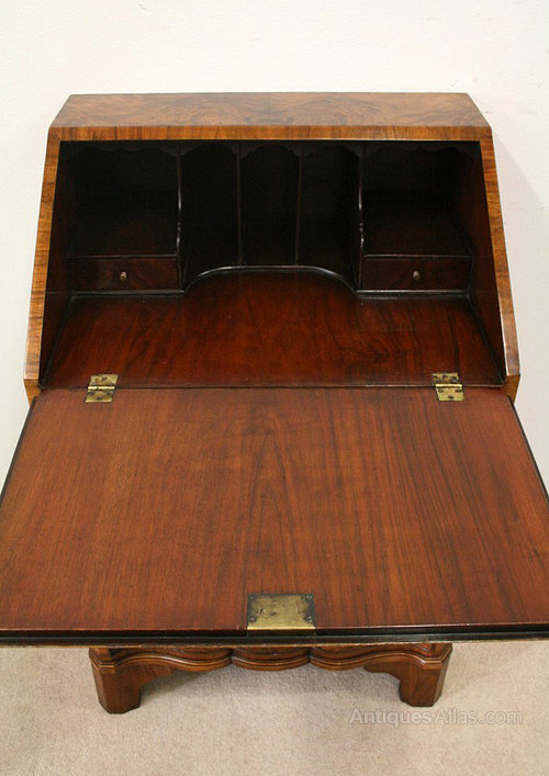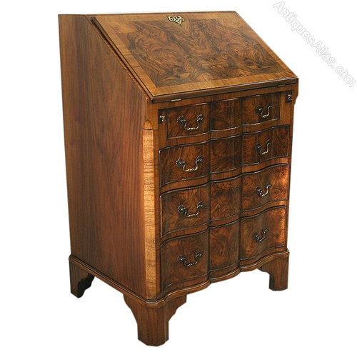 Circa 1920, George II style crossbanded burr walnut bureau with a shaped interior over four graduating shaped drawers with brass drop handles, all standing on bracket feet.