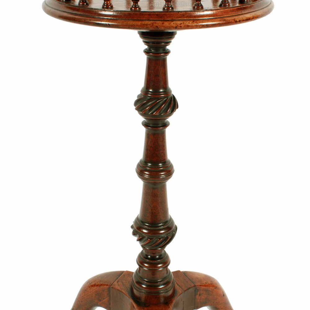 The table has a small round top that has a baluster gallery with a half round gilt brass top rail.