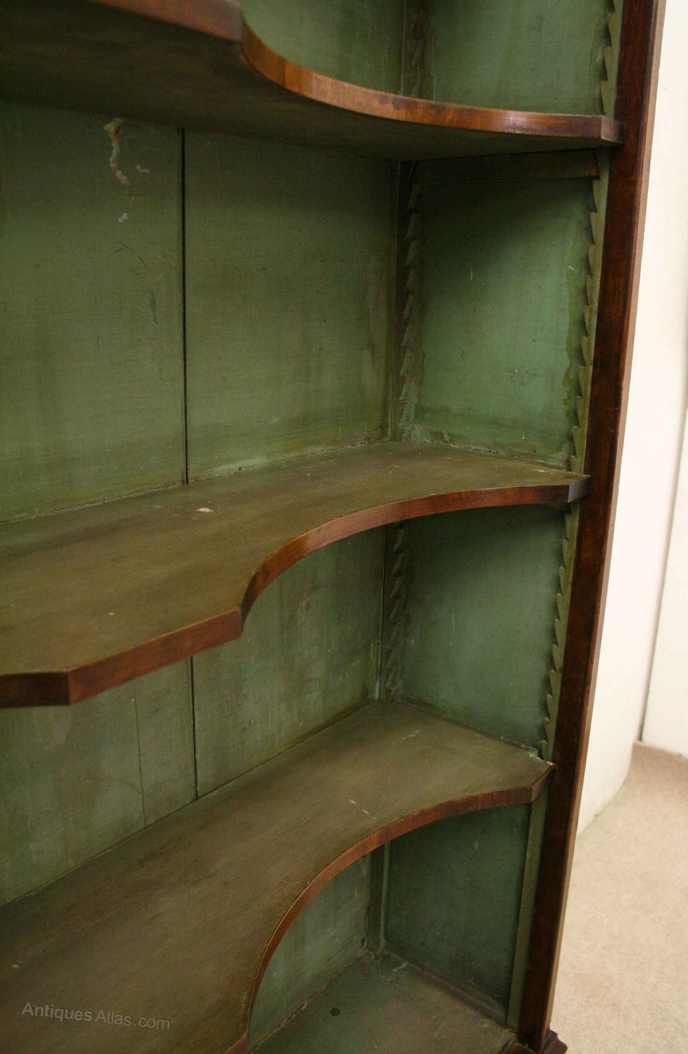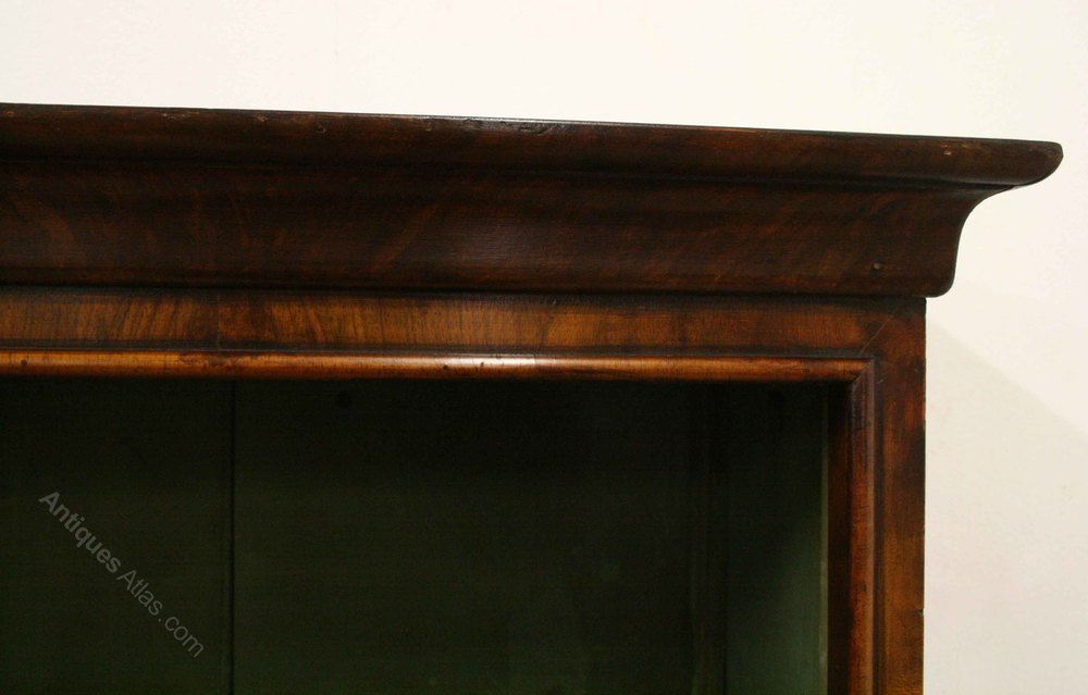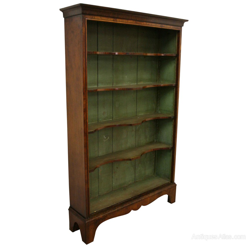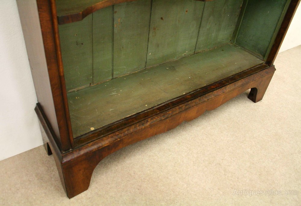 Circa 1900, George II style walnut open bookcase. The stylish cornice has a double ogee moulding, over an apron which is veneered in walnut, as is the facing. On the inside of this is a large half round beading which frames the top and front of the bookcase. The inside is painted green and there are 4 shaped adjustable shelves with walnut facings. At the bottom is an ogee moulding over a shaped apron and the whole piece stands on 4 elegant French style raised bracket feet. Good proportions and excellent condition.