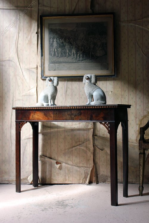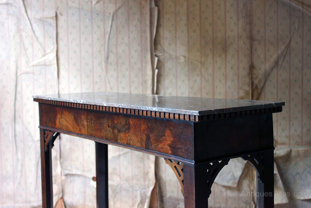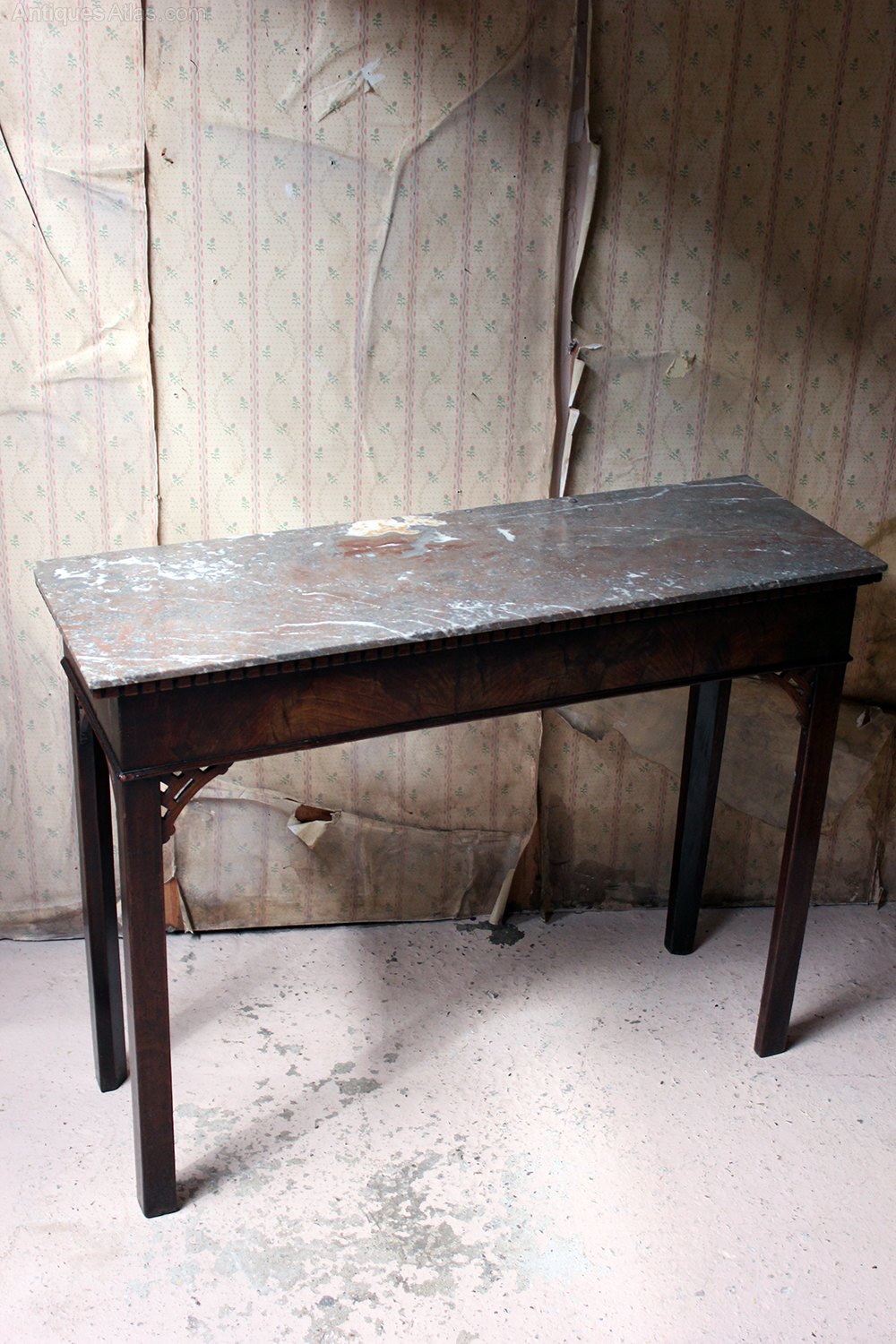 The table probably had a mahogany top that was damaged and not saveable so the marble was introduced and a dentil frieze added, the rest of the carcass is all Georgian and with a good colour, with the fretwork all in tact to all sides. There is one corner of loss to the marble top as photographed, with the mahogany facing veneers with a little bubbling.