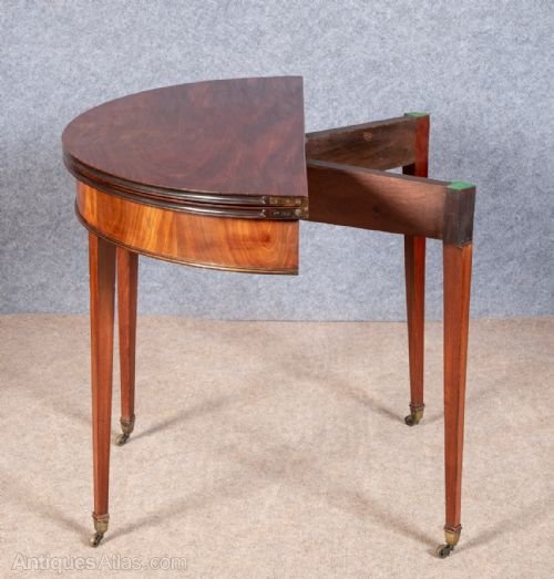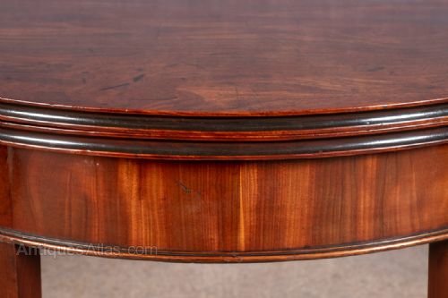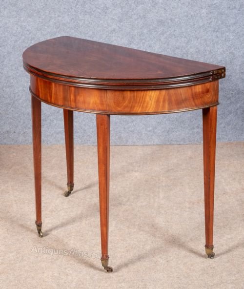 A good quality George III mahogany demi lune console table. The moulded edge top opens to form a circular tea or dining table. The cross grain frieze with beaded edge, the whole raised on square tapering legs with brass cup casters. In good condition with original patina. Dimensions:- Height…29.75’’/ 75.5cm. Width…36’’/ 91.5cm. Depth closed…17.75’’/ 45.5cm. Depth open…36’’/ 91.5cm. Delivery to most of U.K. mainland £50