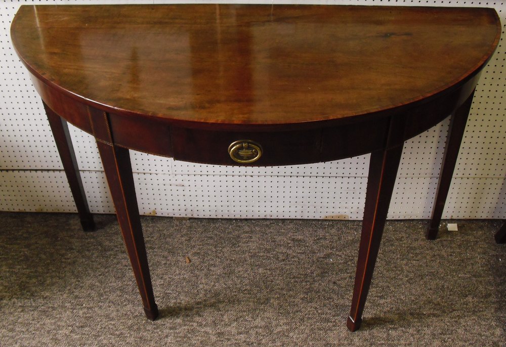 George III Inlaid Mahogany Demi-Lune Table with Boxwood and Ebony Inlay Stringing. Original Crossbanded "Adams" Urn Handle on Tapering Inlaid Legs. c1790 Some superficial damage. Dimensions: 45.5"x 19.5" x 29"H