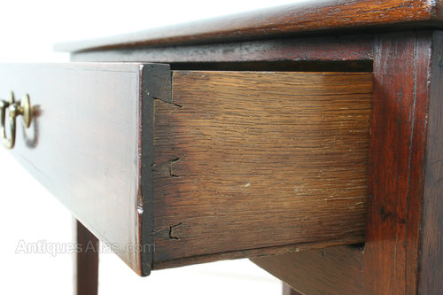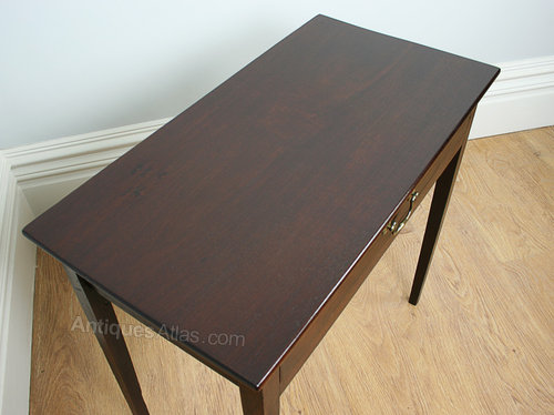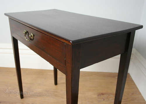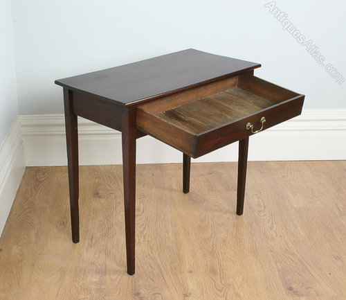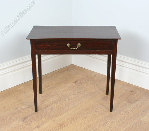 PriceDelivery to any address in mainland England & Wales is £49. DimensionsHeight 70cm or 2ft 3½” Width 76.5cm or 2ft 6” Depth 39.8cm or 1ft 3¾” Category Antique Furniture Date Circa 1780 George III Antiques Material Mahogany Origin English Condition This item is in excellent condition. Although there are no water or ink stains to the mahogany top, there several small knot variations in the timer located on the back left hand side of the top these are natural variations in the timber and it does not constitute damage. The single brass swan neck handle is original. Nominal old use marks to the leading edges but nothing significant considering the age of the item. The drawer is in good working order. Free of woodworm, solid in joint and ready to use. Item code as236a357 / Side Table 13 Status Sold
