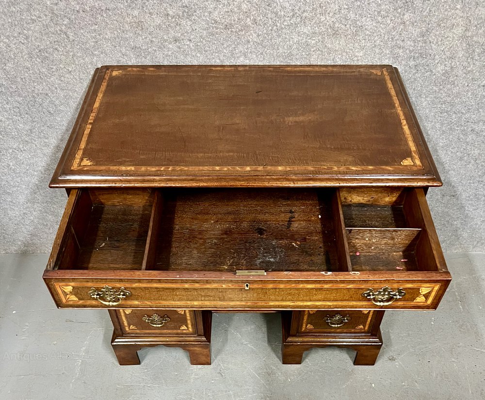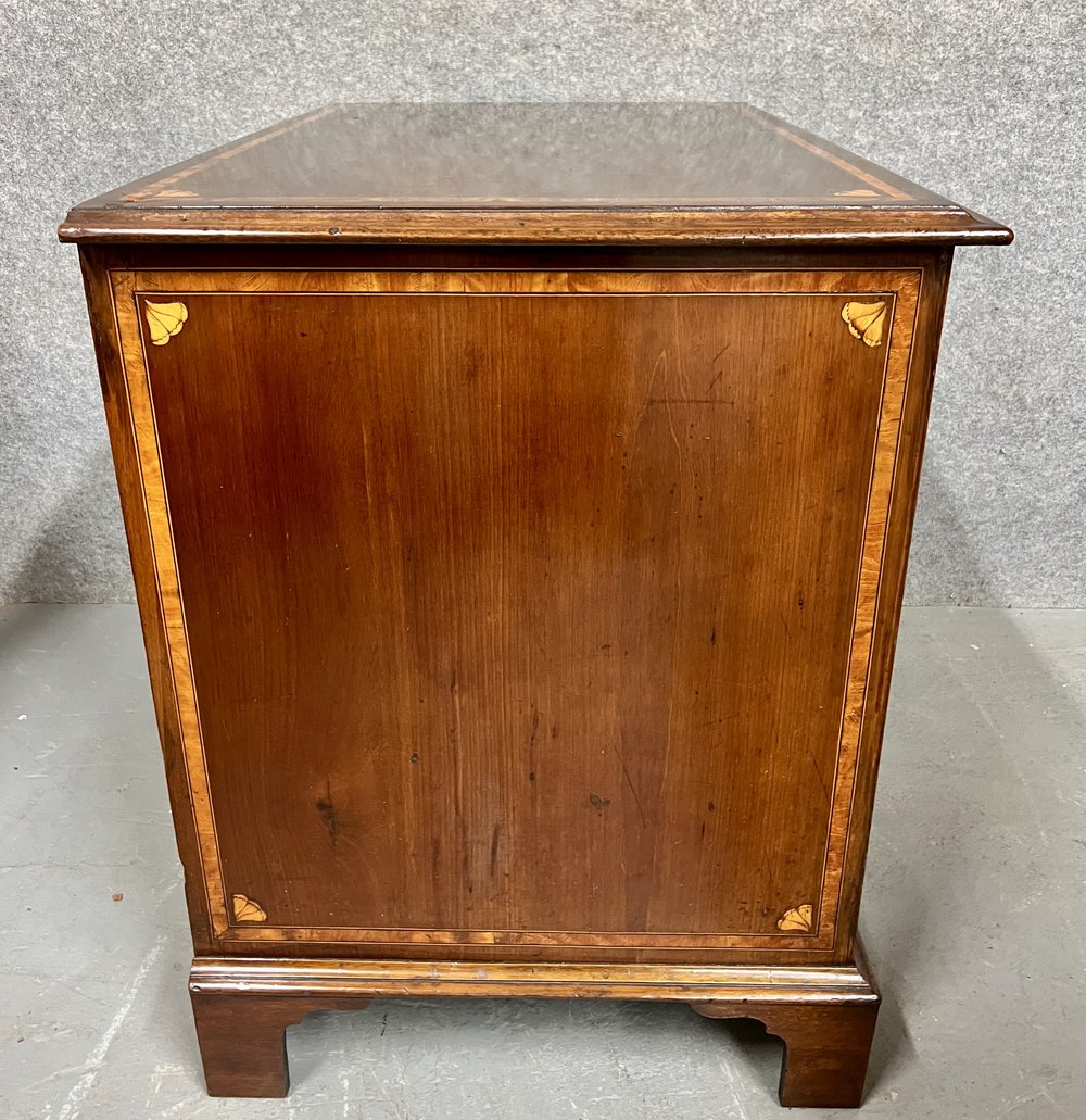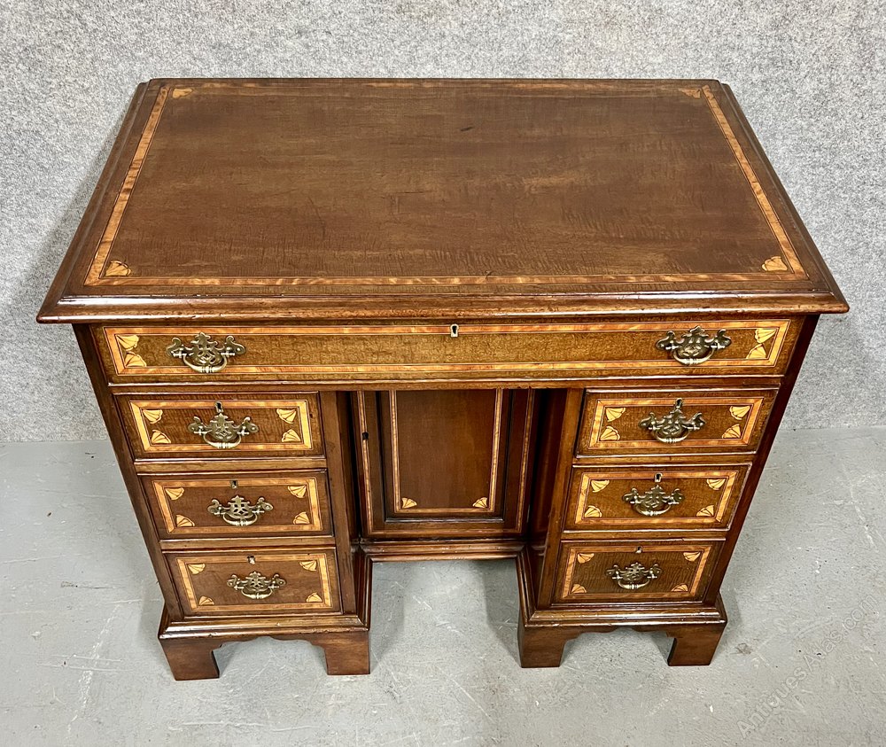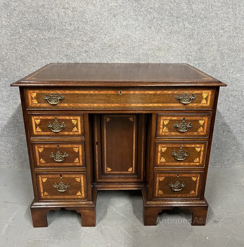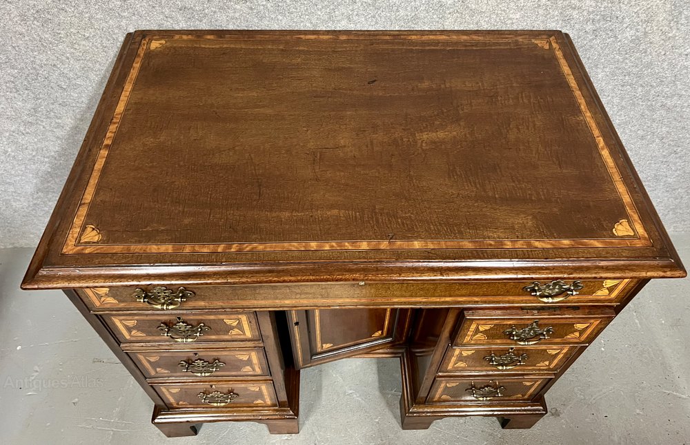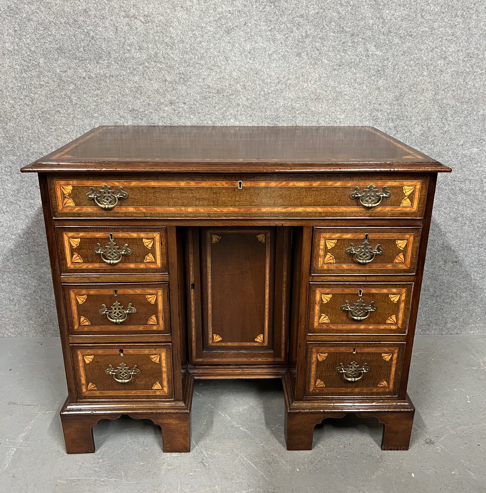 A small good quality mahogany and inlaid George III kneehole writing desk or dressing table. The rectangular shaped top having inset satinwood cross banding between box wood and ebony lines with inlaid shells to each corner and a moulded edge. The long top drawer above three smaller drawers to each side and all having conforming inlay. The drawers are oak lined and retain their original pierced brass handles. The kneehole has a recessed cupboard and the whole raised on 6 shaped bracket feet. Dimensions:- Height... 32.25”/ 82cm. Width... 38”/ 96.5cm. Depth…24’’/ 61cm. Condition - Very good with working lock & keys and ready for immediate use. Delivery to most of UK Mainland £65.