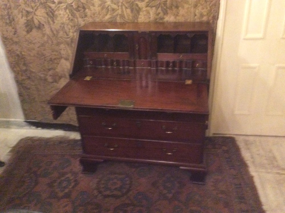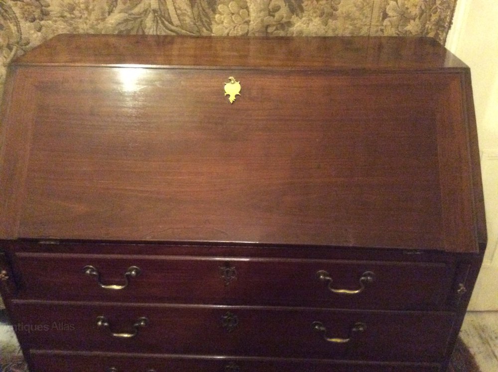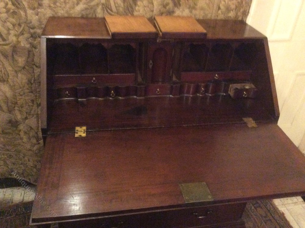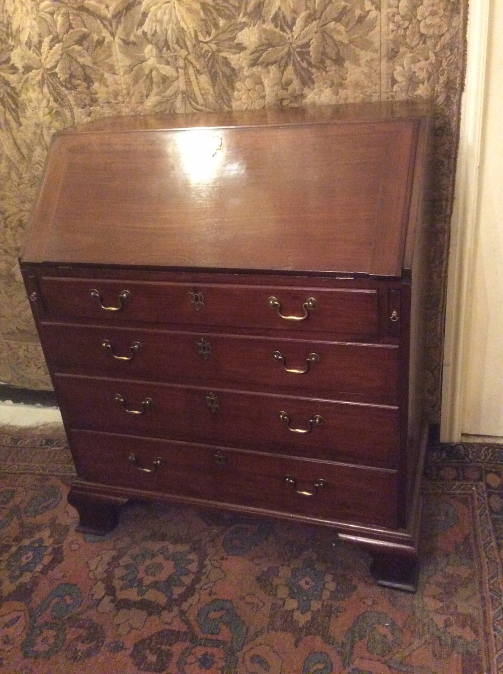 A good example of a Georgian bureau. Enclosed fitted interior, with 7 fitted drawers, 6 pigeon holes, 1 cenral cupboard and 2 concealed pillar drawers. Over four graduated drawers. Original fittings