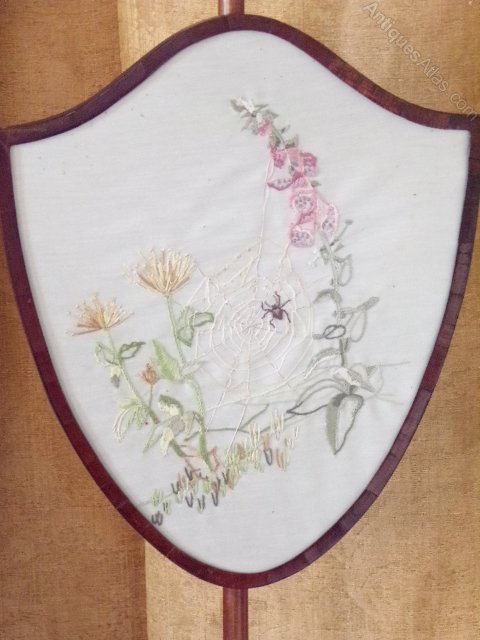 George III mahogany shield pole screen with later embroidered panel depicting a spider in a web with flowers in the background.
