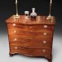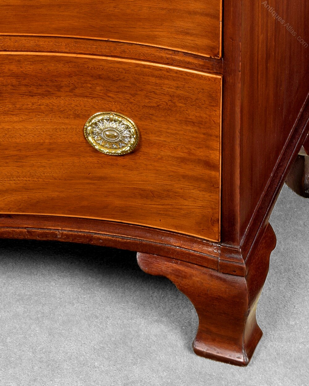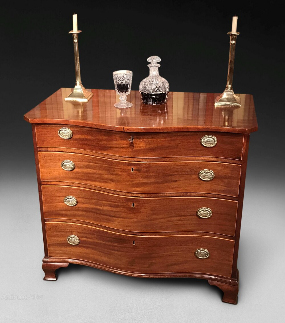 A very good George III period Mahogany Serpentine Fronted Chest of four drawers of rare, small size, the top with canted corners and the graduated drawers retaining the original oval plate handles, the whole raised on ogee shaped bracket feet.