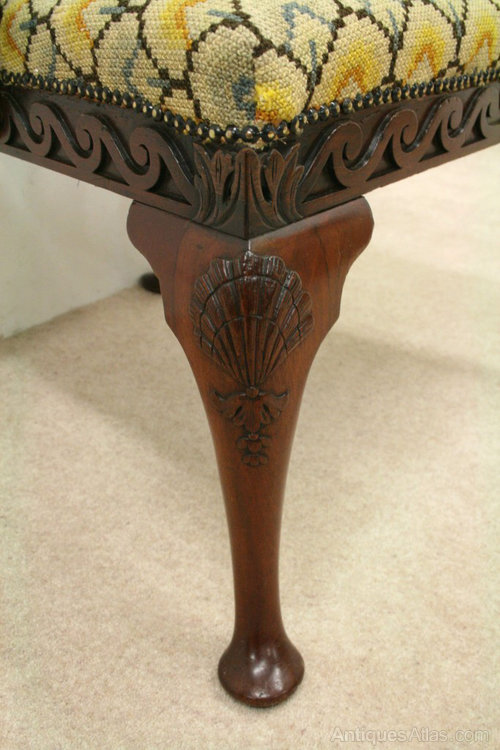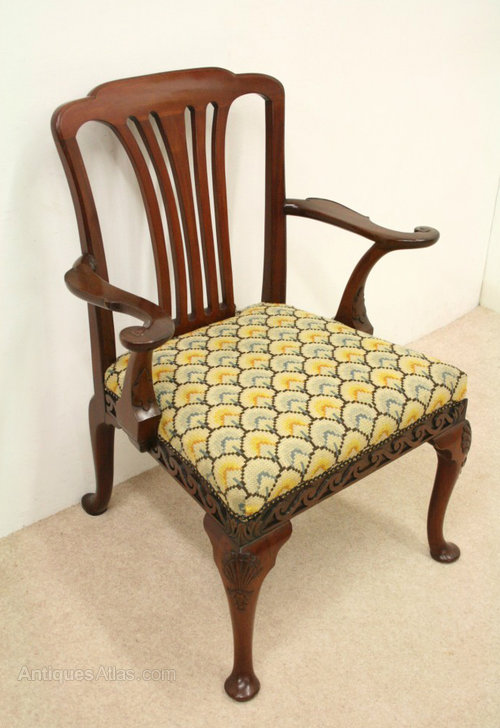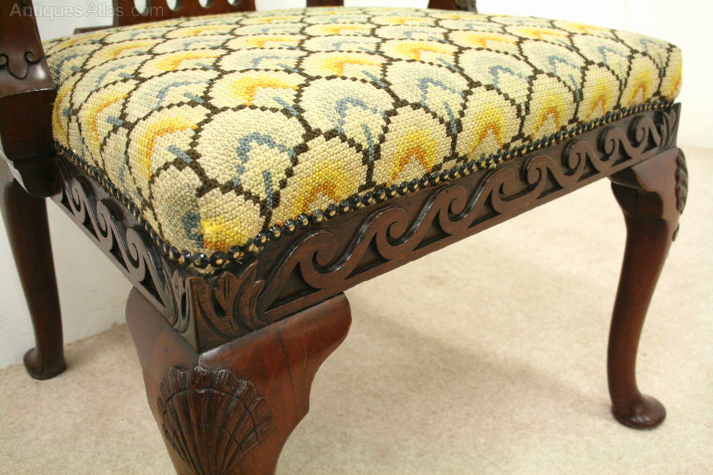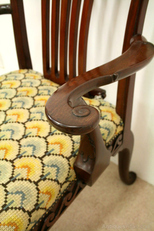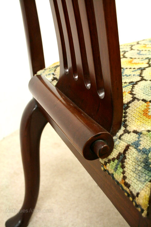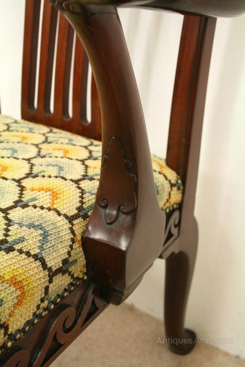 Circa 1780, George III mahogany side chair. The chair has a large back and shaped upright splat. At the base of the back is a stylish paper fold piece of mahogany. The two large arms have carving on outside edge and finish in a shepherd crook end. These are supported by stylish uprights with an unusual carving on the facing. The stuffover seat is needlepoint and beneath this is a very stylish apron carved with Vitruvian wave scrolls. The front legs have carved shells on the knees and finish on pad feet. The two back legs are outswept and also finish in pad feet. The chair has been re-polished at some stage.