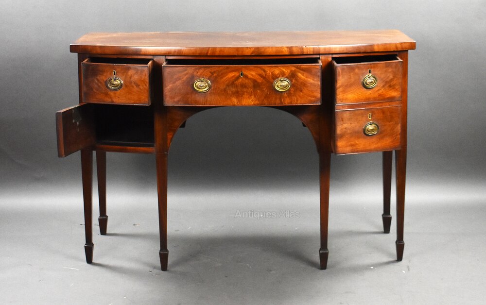 An elegant George III bowfront sideboard dating to the late 18th century, showcasing the refined lines and symmetry of the Georgian period. Constructed in richly figured mahogany with excellent colour and patina, this timeless piece offers graceful proportions and useful storage for dining or reception rooms.