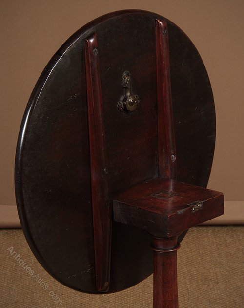 Lovely quality George III mahogany tripod wine table c.1800. 21½” diameter single piece solid mahogany tray top with a raised and moulded edge. On an elegant crisply turned column on shaped tripod legs with pointed feet. Top can be tipped to vertical when not in use, locking into place with the original brass catch. Some old wear to the edge, otherwise excellent colour and condition. Cleaned and waxed in our workshops.