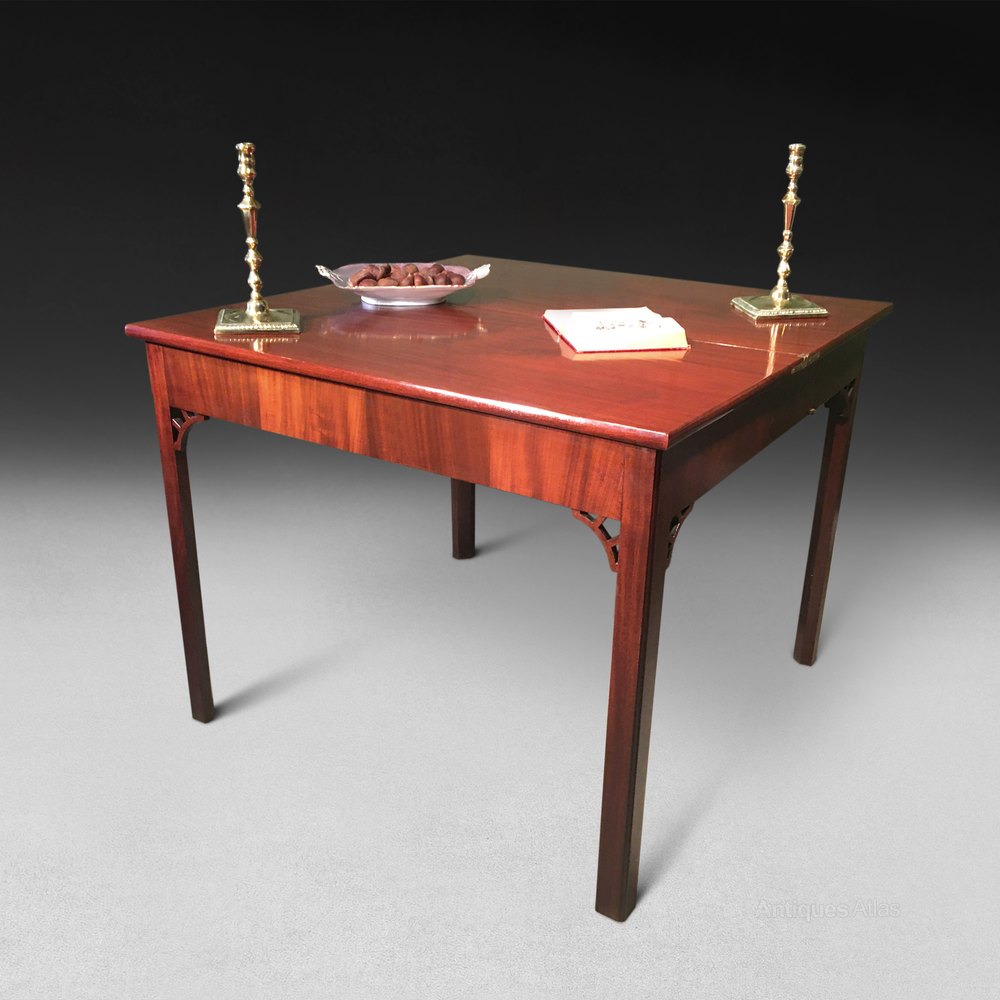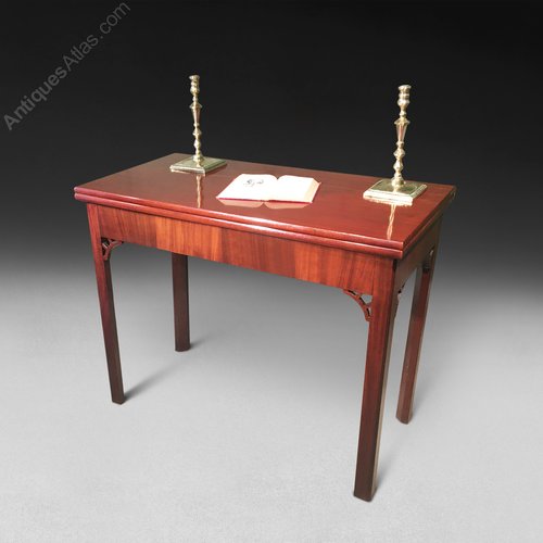 A George III mahogany turnover top tea table, with interesting concertina action to the supporting frieze, pull out supporting slide and raised on legs of square chamfered section with fretwork spandrels. The hinge to the concertina is stamped H Tibats.