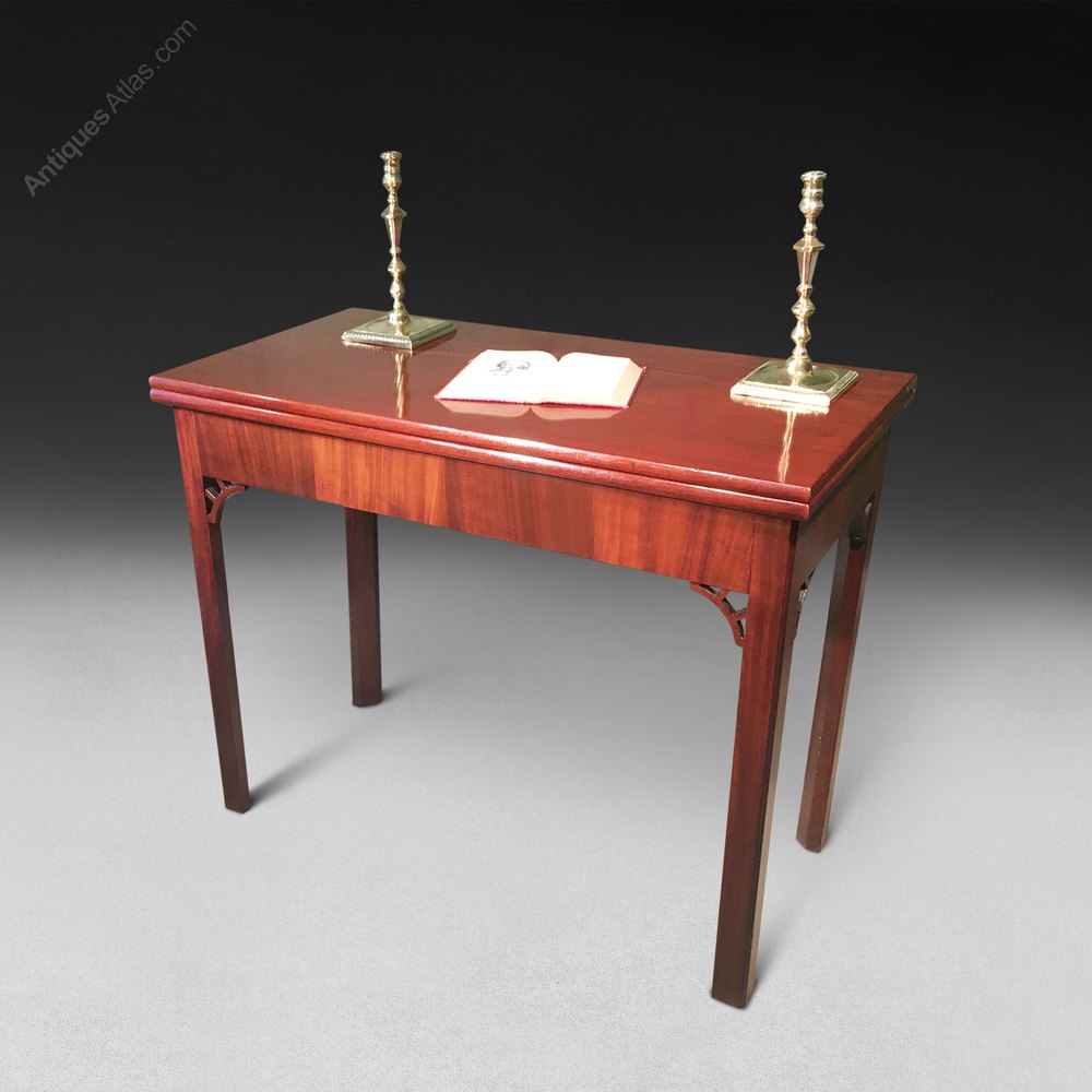A number of mid 18th century card antique tables of the finest quality have 'H.TIBATS' stamped upon one hinge and these are more often concertina-action as with the present example. It is possible that this mark refers to Hugh Tibbats or Tibats (both versions of the spelling are documented) who is recorded as working from Bell Street, Wolverhampton as a 'hinge and sash fastening maker', The Birmingham, Wolverhampton, Walsall, Dudley, Bilston and Willenhall Directory, 1781.