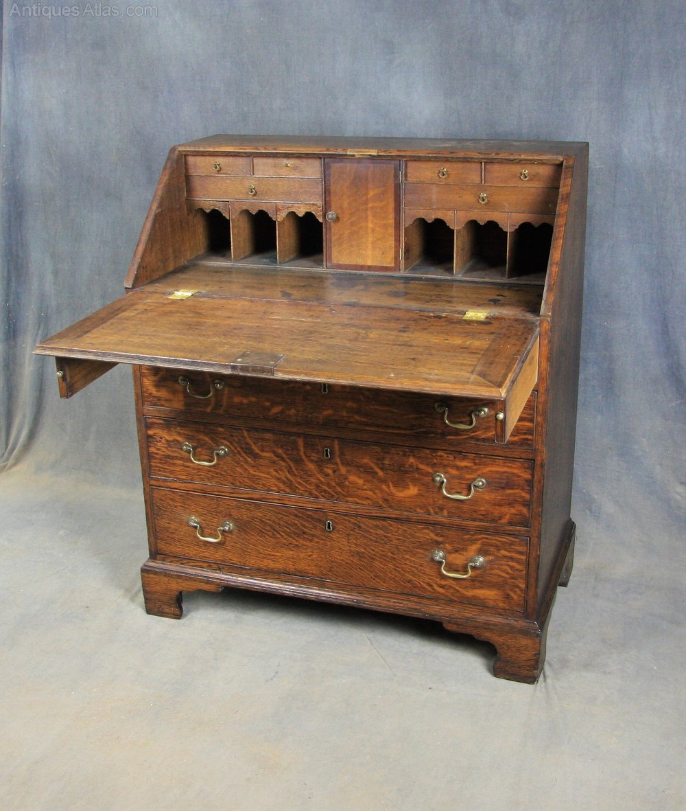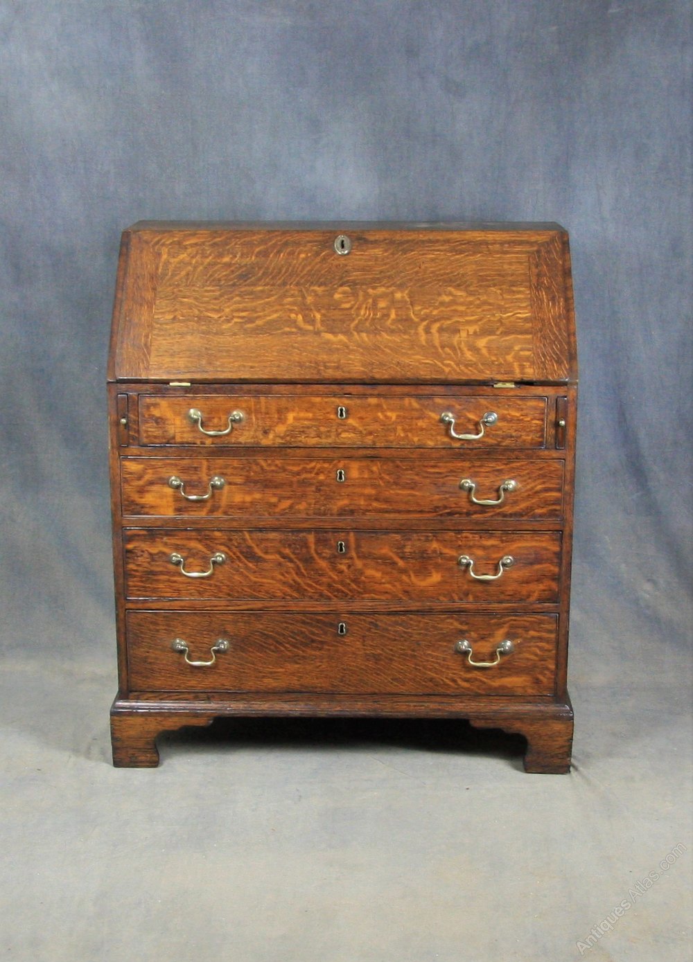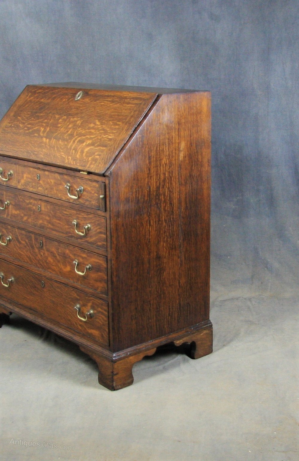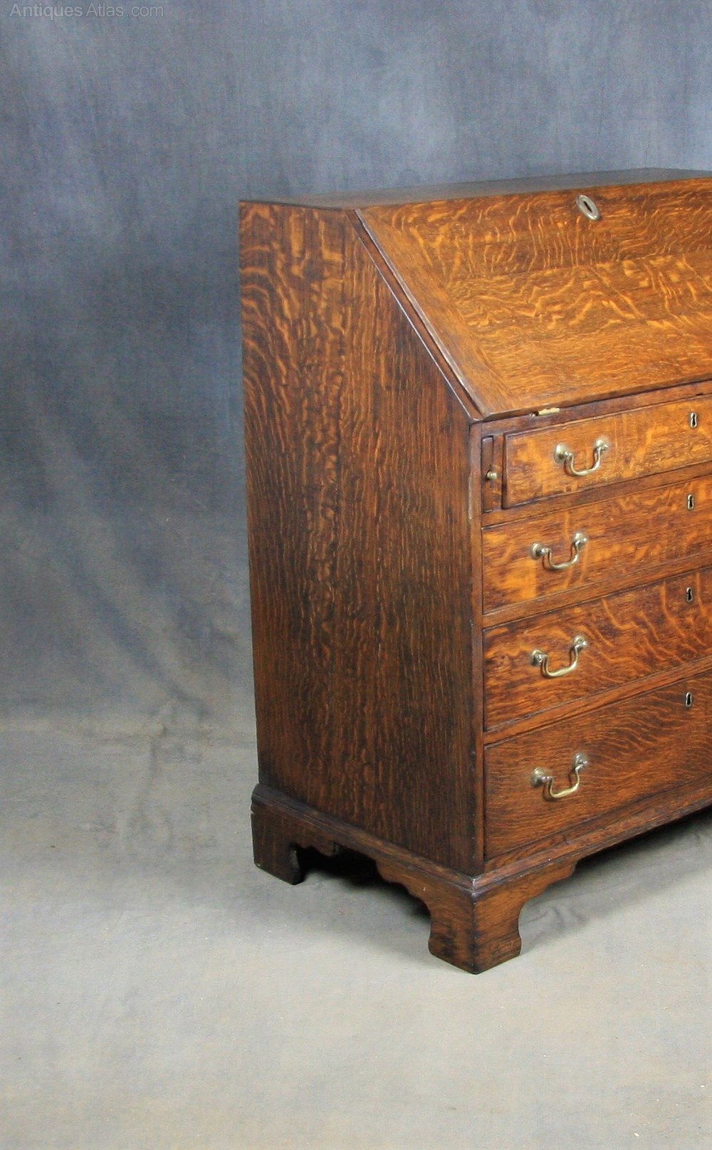 Lovely quality Georgian oak bureau having figured oak fall front that opens to reveal writing surface and pigeon holes and small drawers over 4 long graduated drawers with swan neck brass handles all standing on bracket feet.