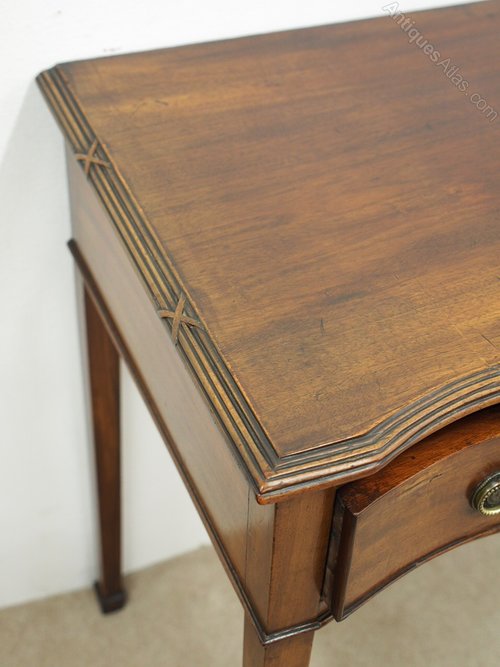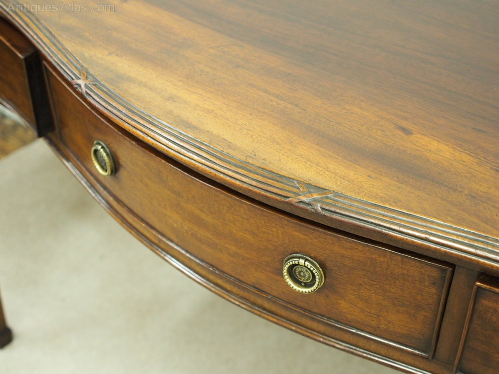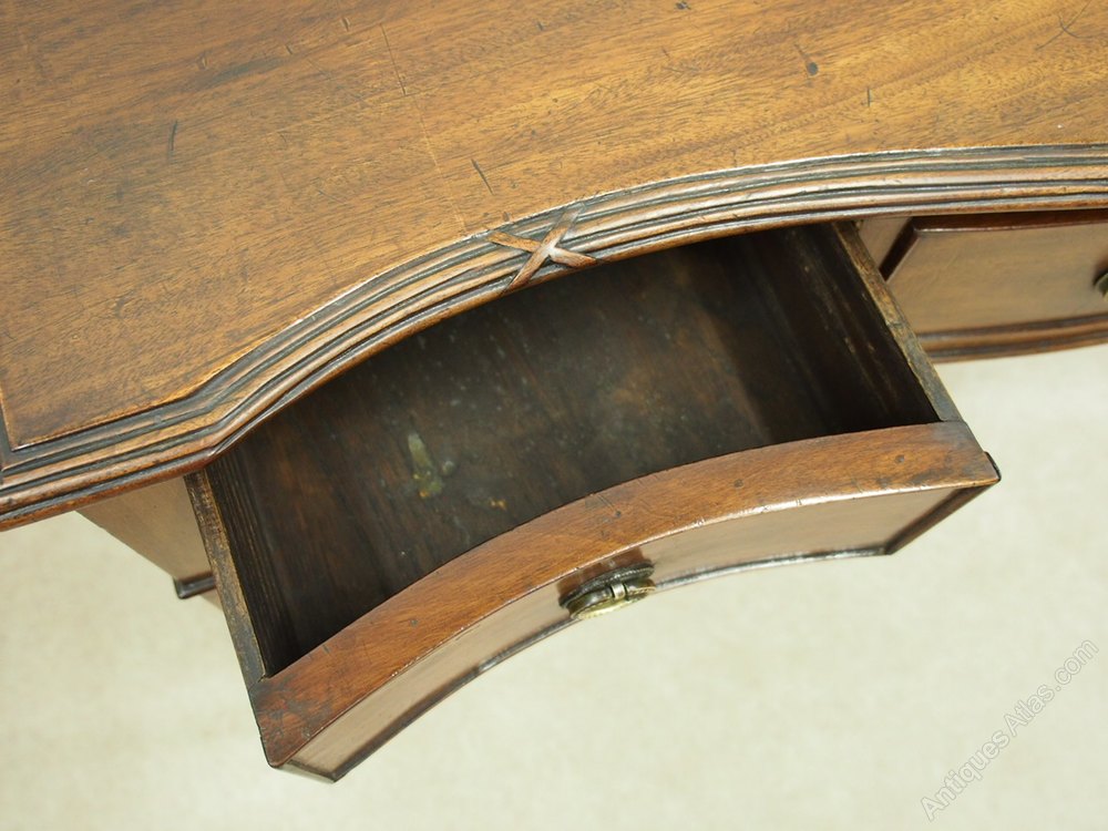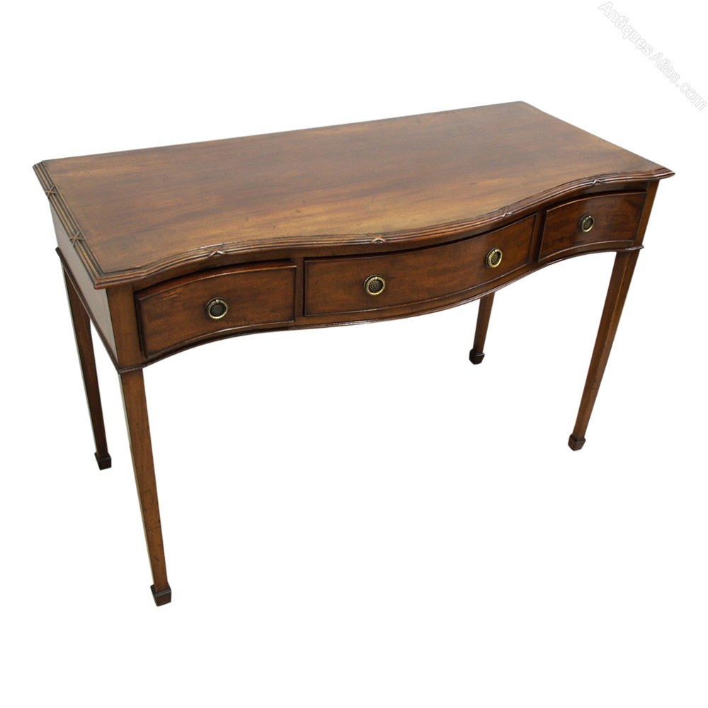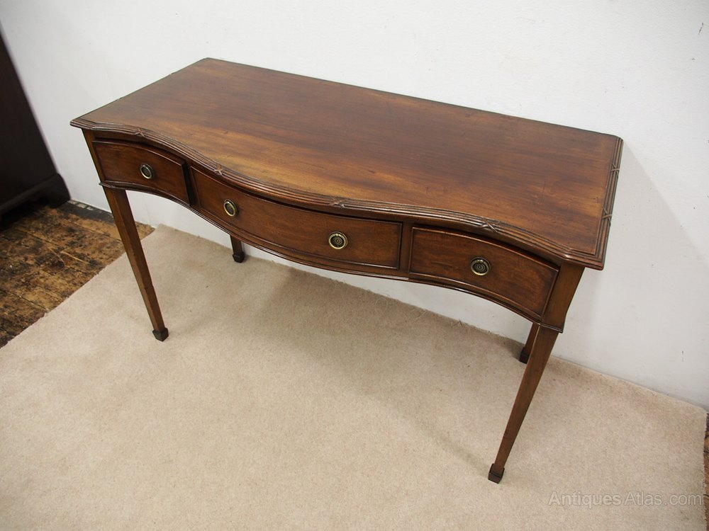 Circa 1900, George III style serpentine-fronted mahogany hall table. With an unusual fluted and carved moulding to top, three frieze drawers with cast brass ring handles all over tapered supports with block toes.