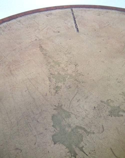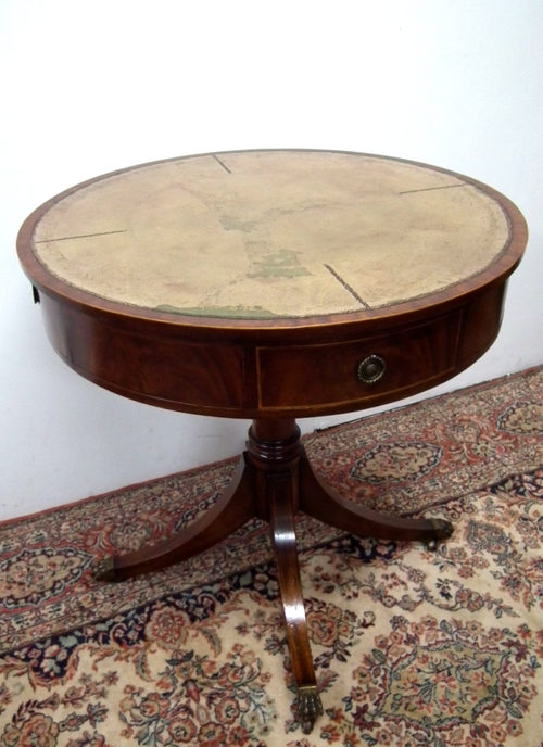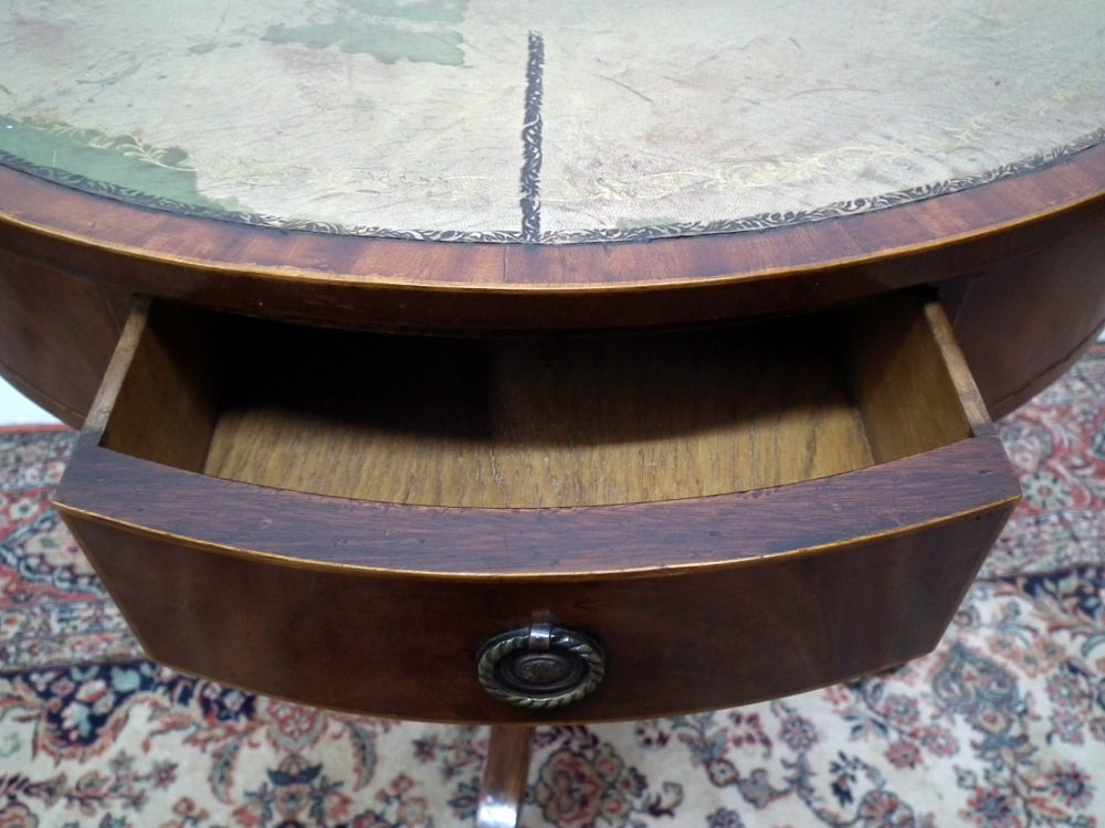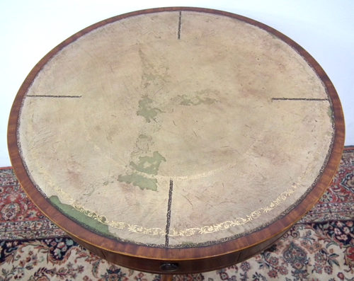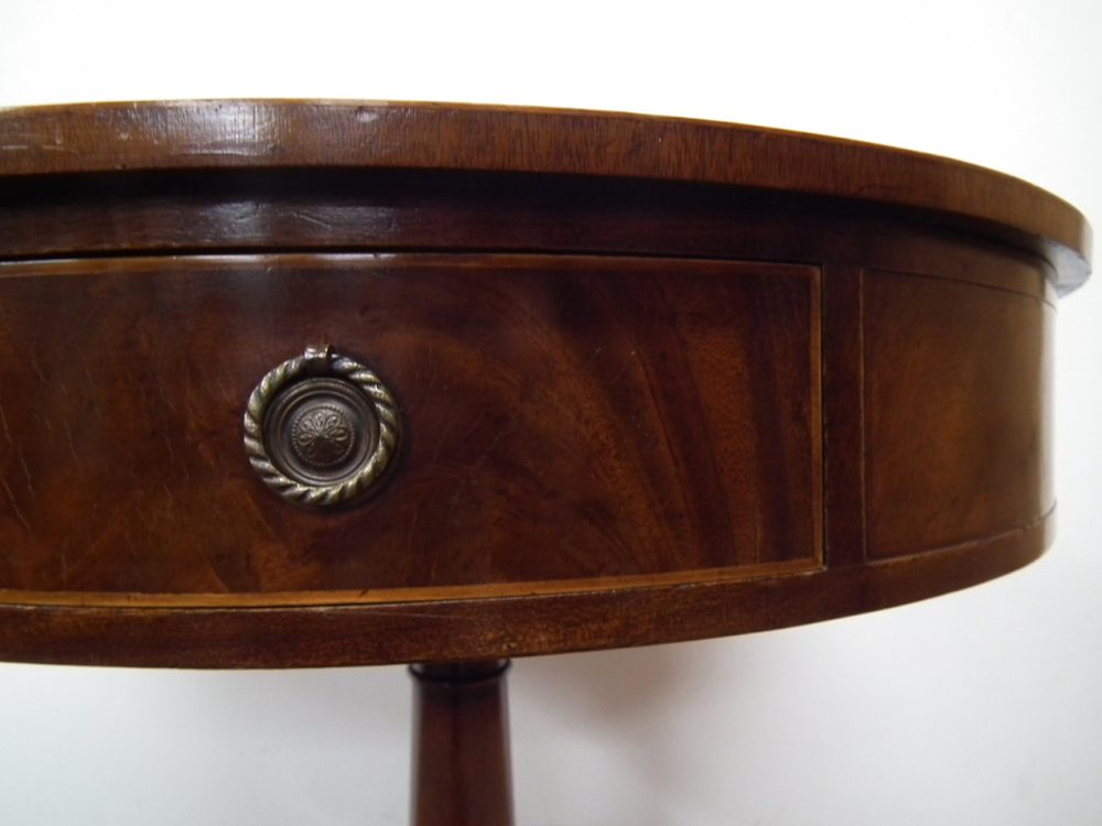 Circa 1920, George III style neat sized circular mahogany inlaid drum table. The top has its original green tooled and gilded leather, a crossbanded fore edge and boxwood inlay. Below the top is a deep apron with flame mahogany panels and small drawers with boxwood inlay and small brass handles, on a turned cannon barrel support finishing on a quadruple base with 4 string inlaid splayed legs.