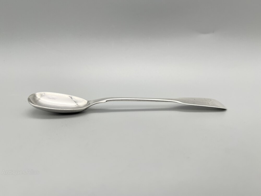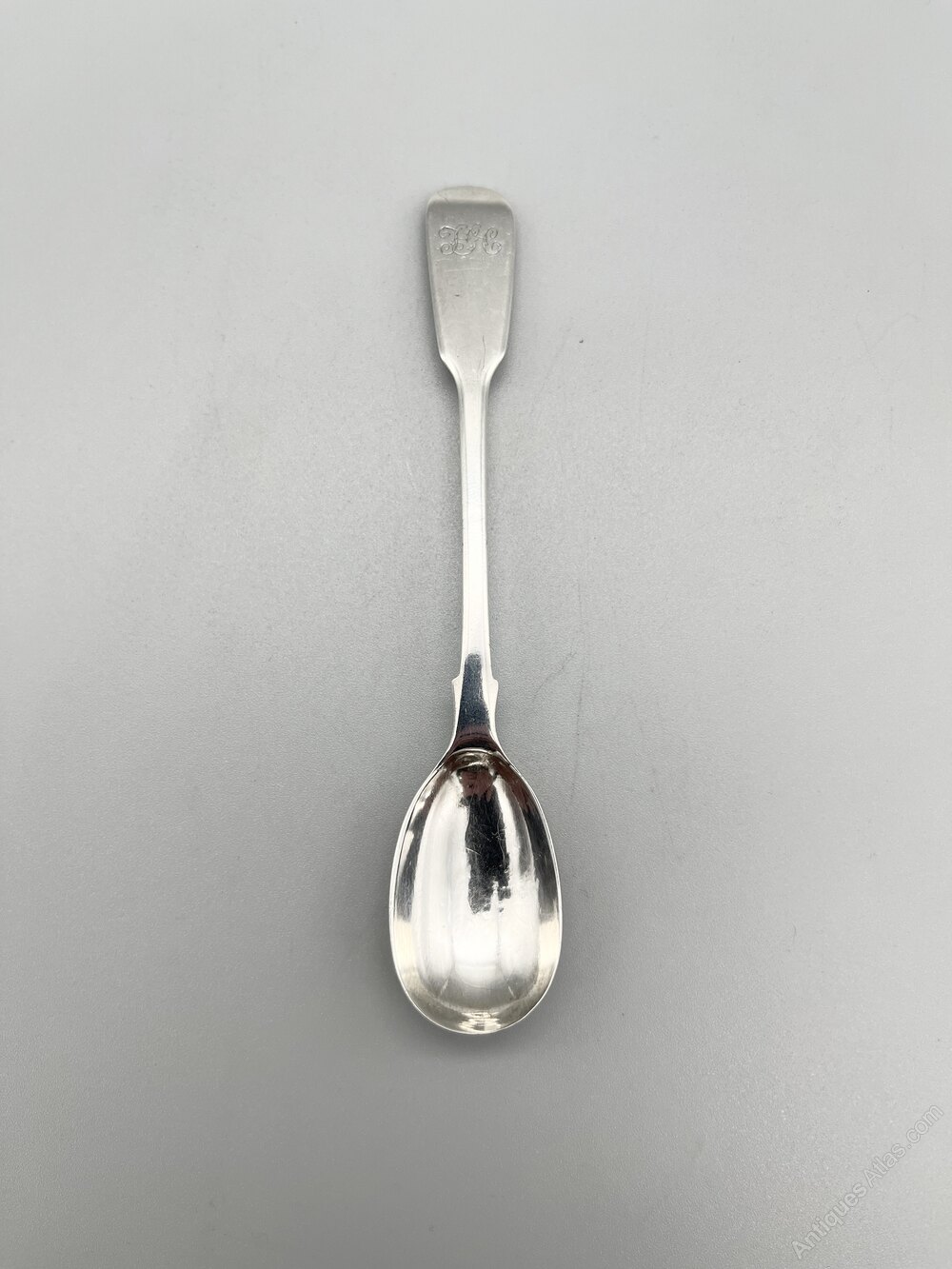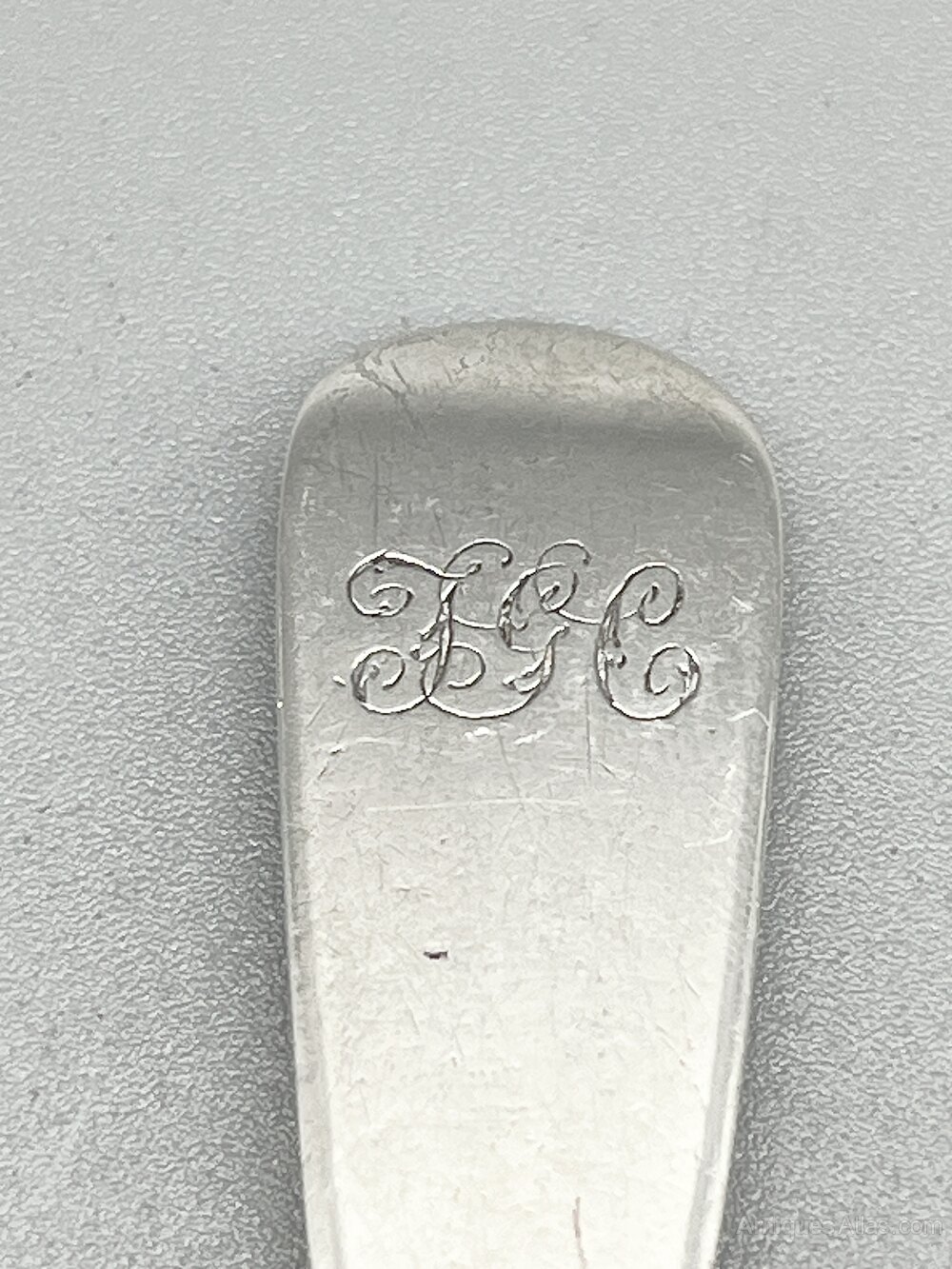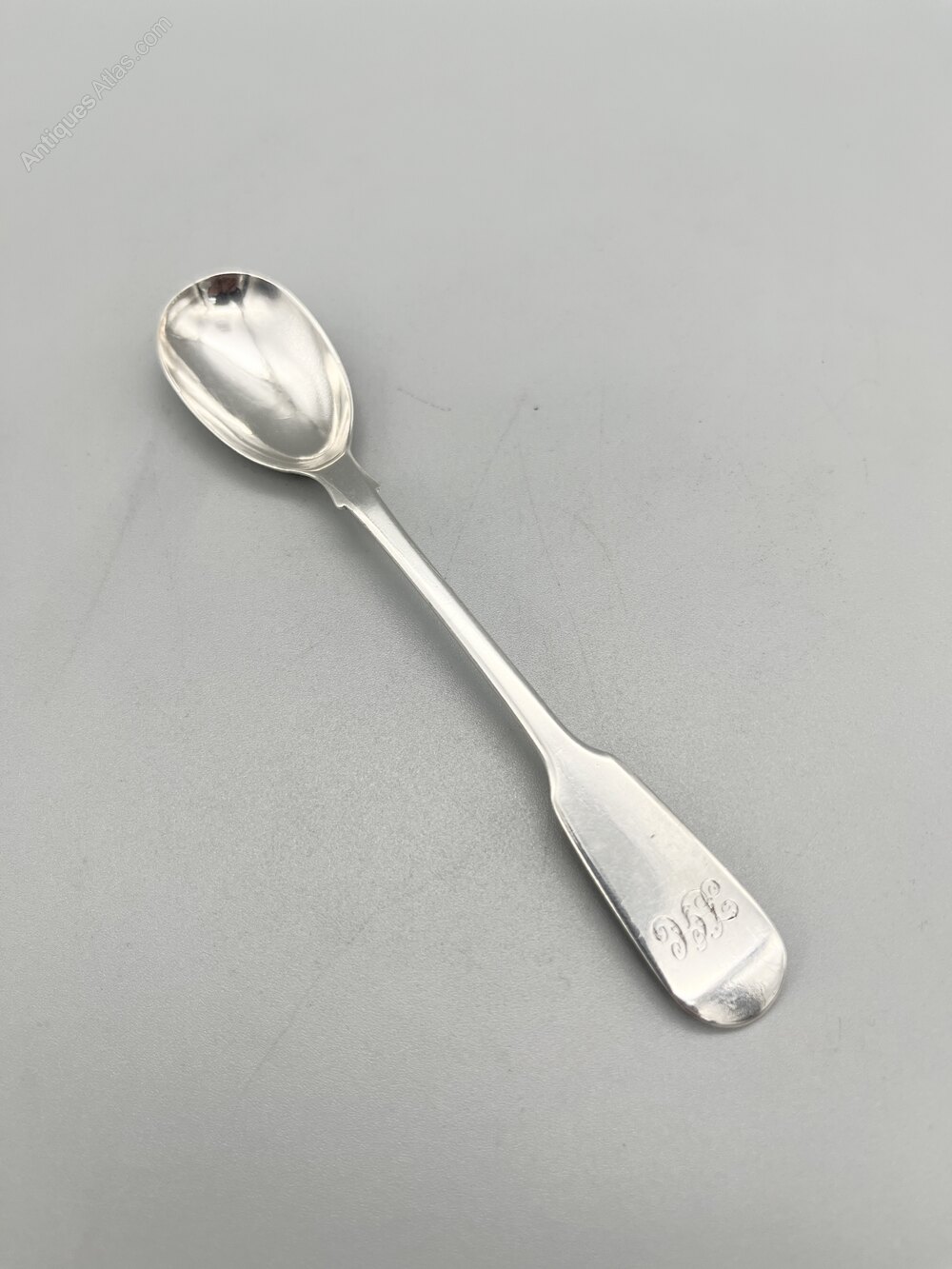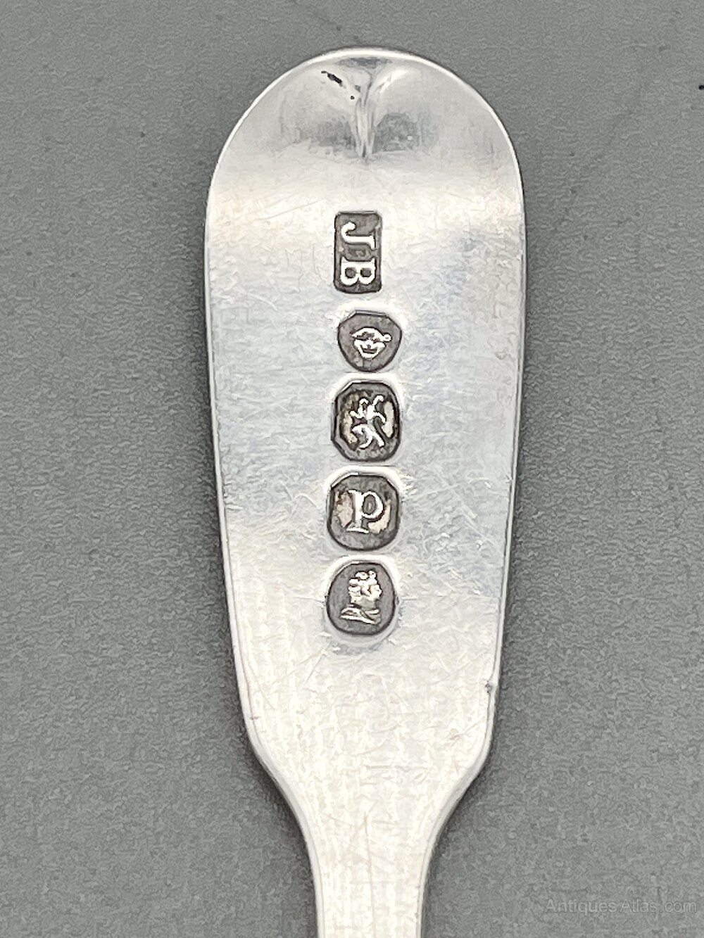 The mustard spoon was made in London by silversmith James Beebe and dates to 1830. James Beebe was a specialist spoon maker who registered his first mark at London’s Goldsmith’s Hall in 1811. He made flatware of all different sizes from salt spoons up to basting spoons along with forks and other specialist items. Beebe had a long and successful career into the late 1840s and his pieces are always of good quality.