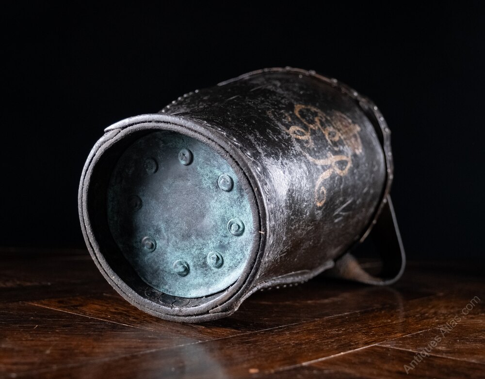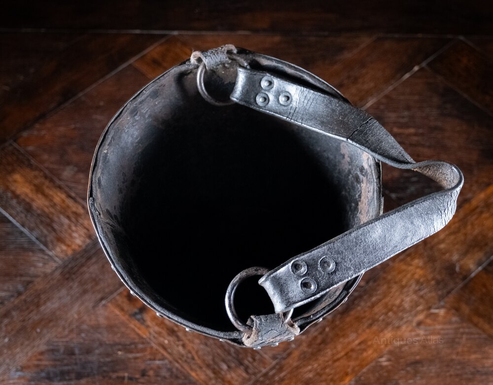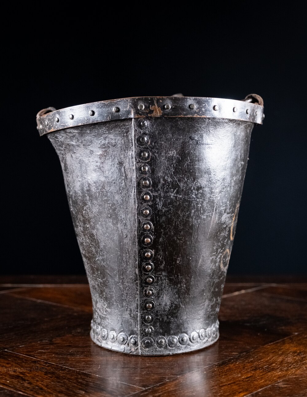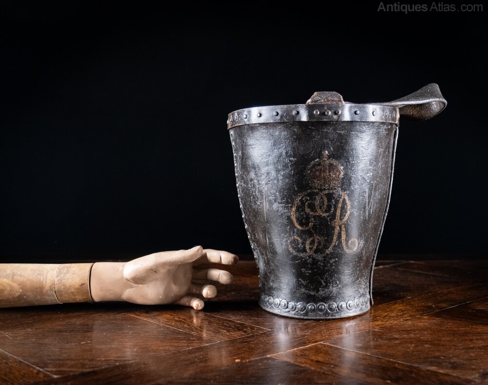 The bucket is of a wonderful form and colour throughout with the George V cypher painted in gilt and red to the front. The whole remains strong and sturdy with its original leather handle.
