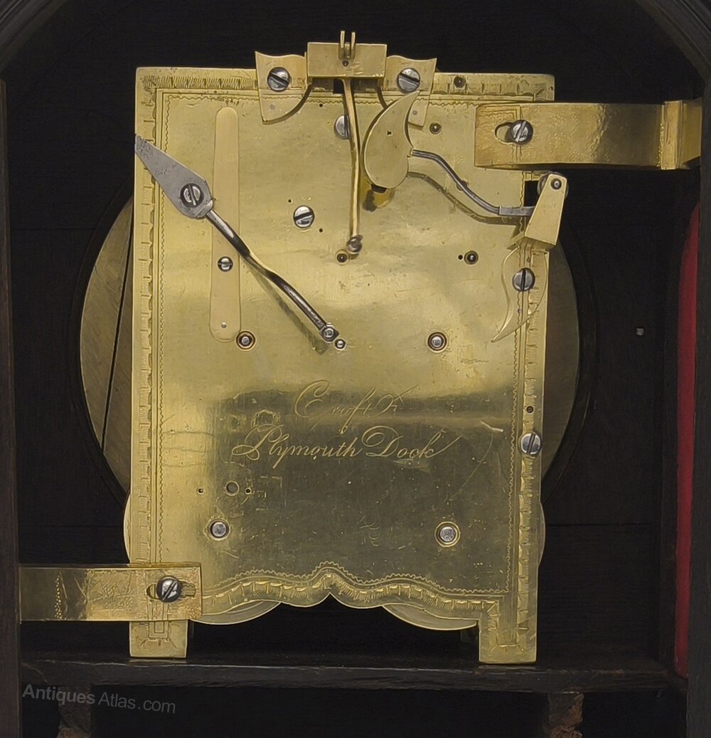 The glazed door secured by lock and key at the back gives access to a 2 train, 8 day fusee movement with verge esacapement striking on a bell. The back plate is border engraved and signed "Croft", "Plymouth Dock".There is a pull repeat cord that strikes the current hours.