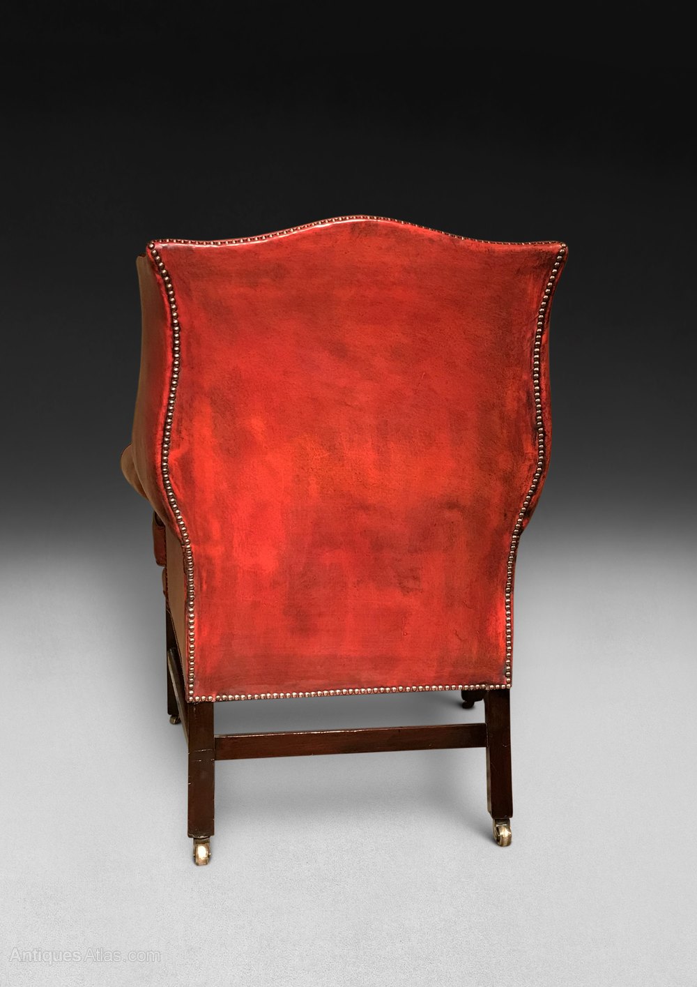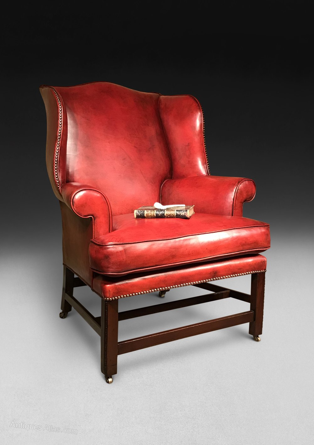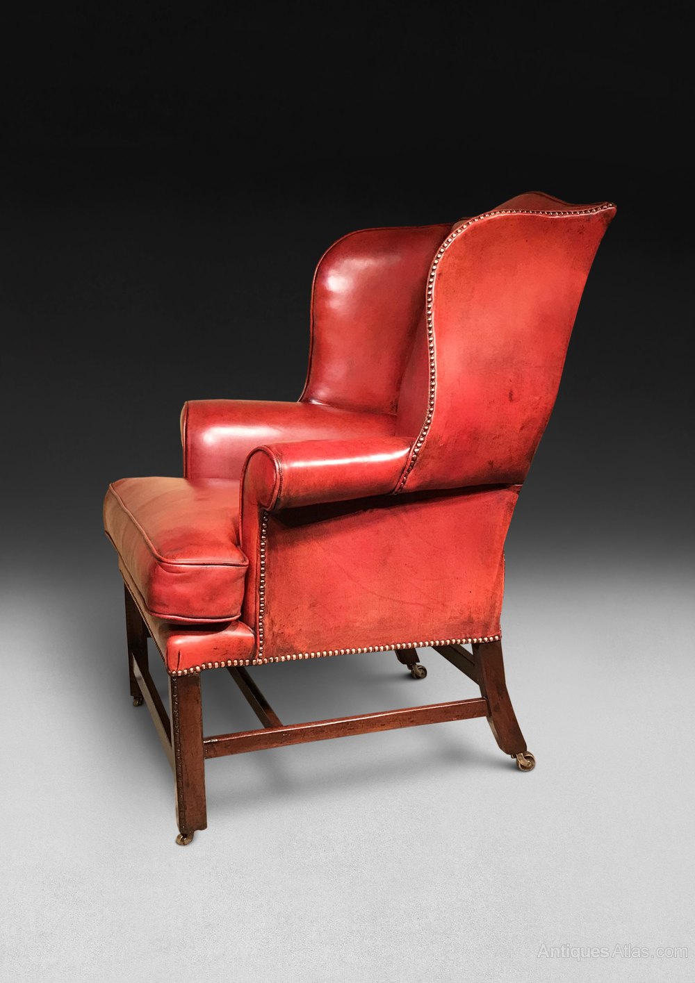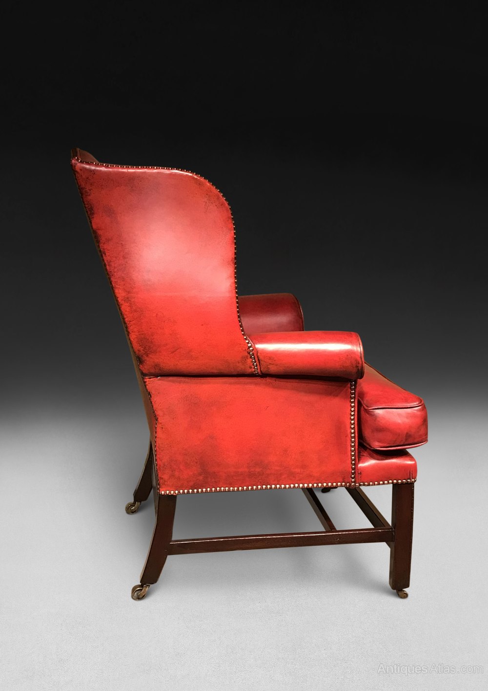 ITEM RESERVED - A very good Chippendale period Mahogany wing armchair, the camel back flanked by shaped wings above scrolling armrests and a loose cushion, the whole raised on square chamfered legs with carved moulded corners and united by stretchers, the legs all with brass barrel casters. This has been reupholstered and re-covered in fine hide edged with brass nailing in the past 10 years. The leather is patinated in a very attractive manner.