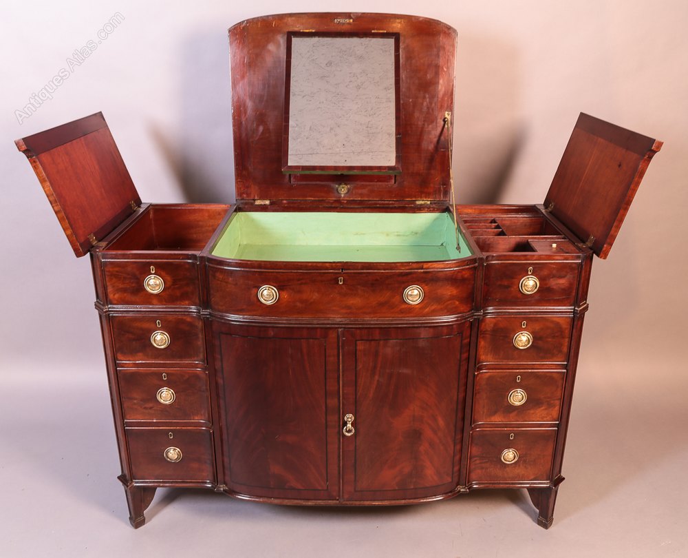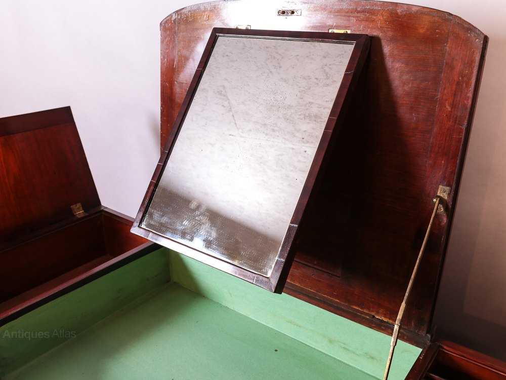A Superb Georgian Dressing Chest in Mahogany with Ebony string inlay and Mahogany cross banding to the top and doors. It has three separate lids that open to reveal compartments for storage and a dressing mirror that is adjustable via a ratchet. Six drawers and a cupboard with two doors, a very attractive country house piece with lots of quality. The condition is excellent with well figured timber used throughout in the construction.