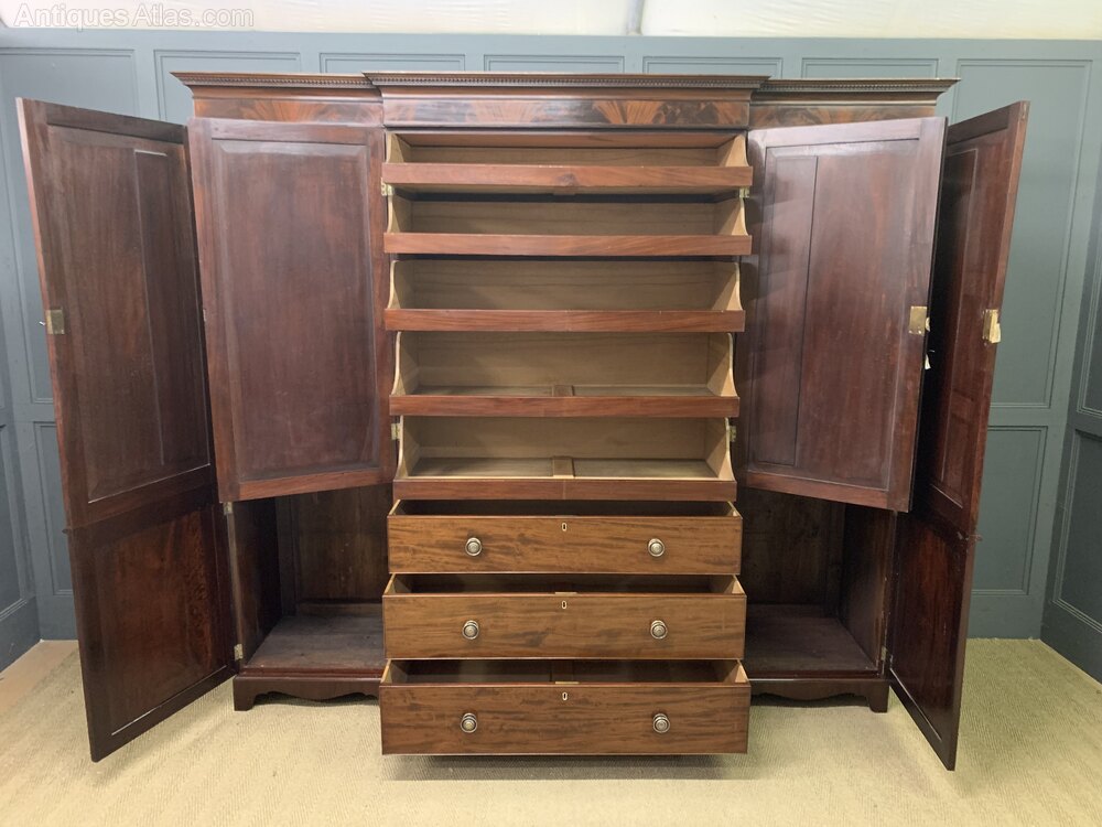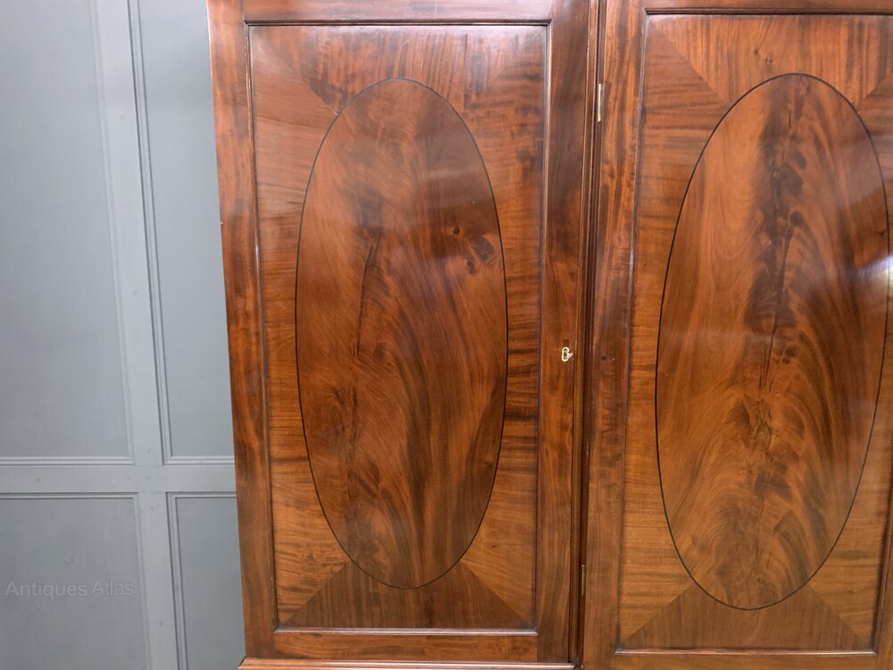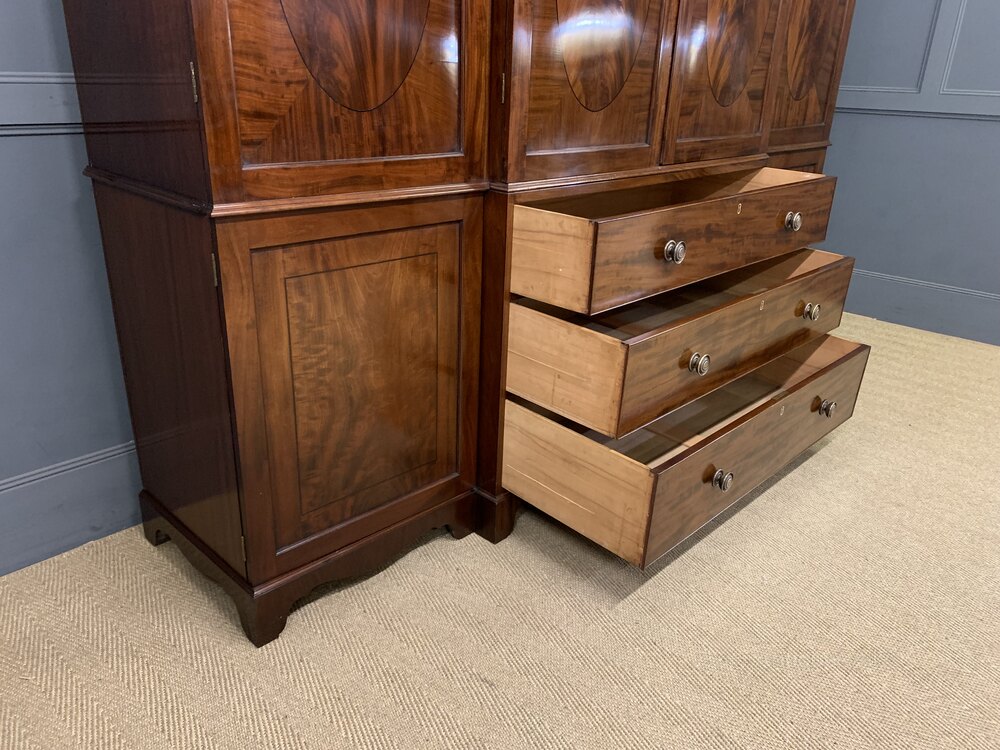A superb Georgian Inlaid mahogany compactum wardrobe dating to circa 1810 and offering a huge storage capacity. Of breakfronted from and of excellent construction in solid mahogany with attractive flame mahogany veneers. With a pair of long hanging cupboards flanking a central section fitted with pull-out trays and drawers. The cubpoard doors all decorated with attractive inset oval panels of flame mahogany. The two end full length cupboards are fitted with brass hanging rails. The central cupboard doors open to reveal a series of 5 graduated pull-out trays. Beneath which are a series of 3 graduated drawers fitted with their original brass bun handles. All of the cupboard doors are lockable (key supplied). All surmounted by an over sailing cornice with dentil moldings. The whole piece standing on bracket feet. Sympathetically repolished in our workshops to a very high standard. Now offered for sale in excellent condition with a rich colour and good patina. Splits into sections for ease of installation.